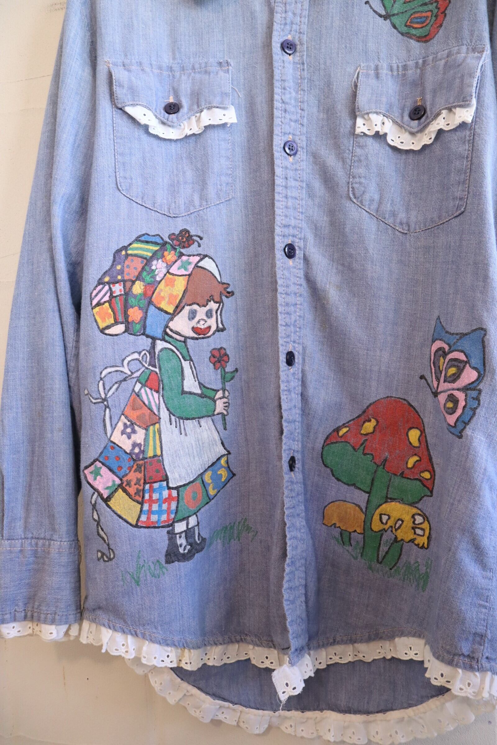 女の子・蝶々・キノコのハンドペイントがとっても可愛いシャンブレーシャツ。