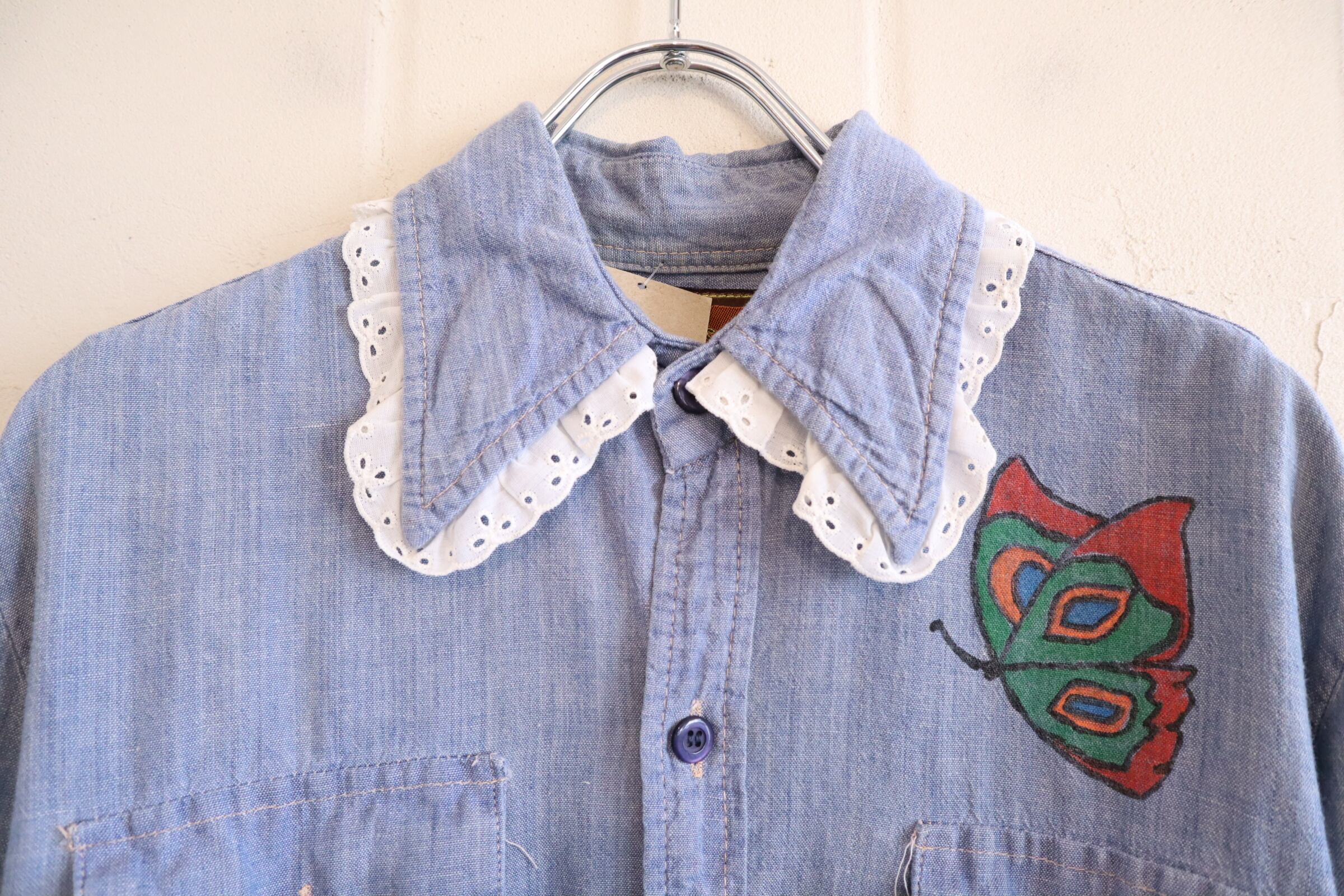 70s- lightblue human&butterfly paint chambray shirt [l-3619]