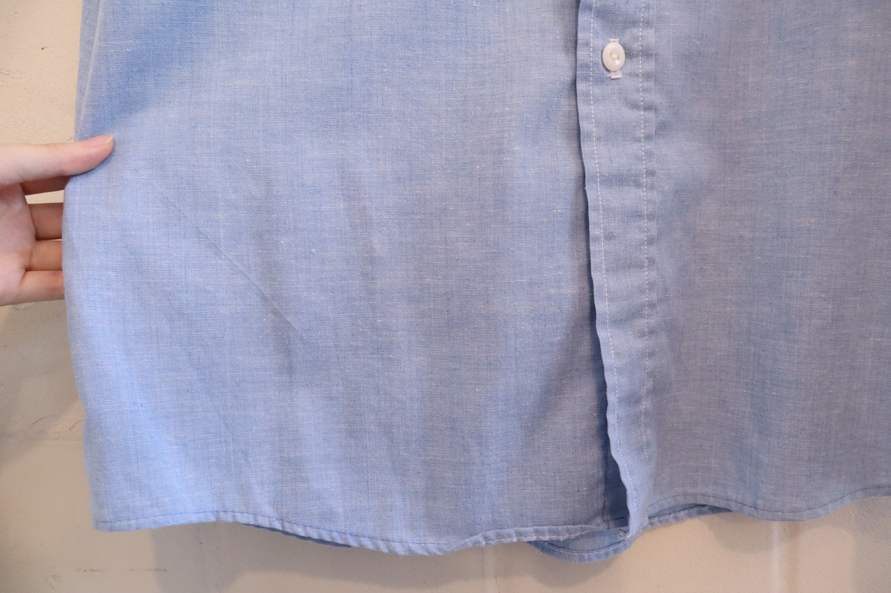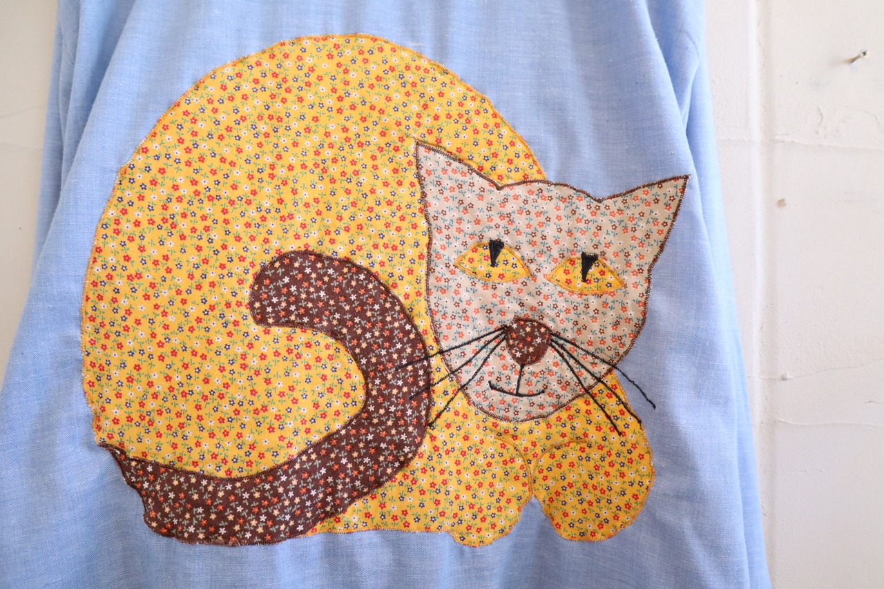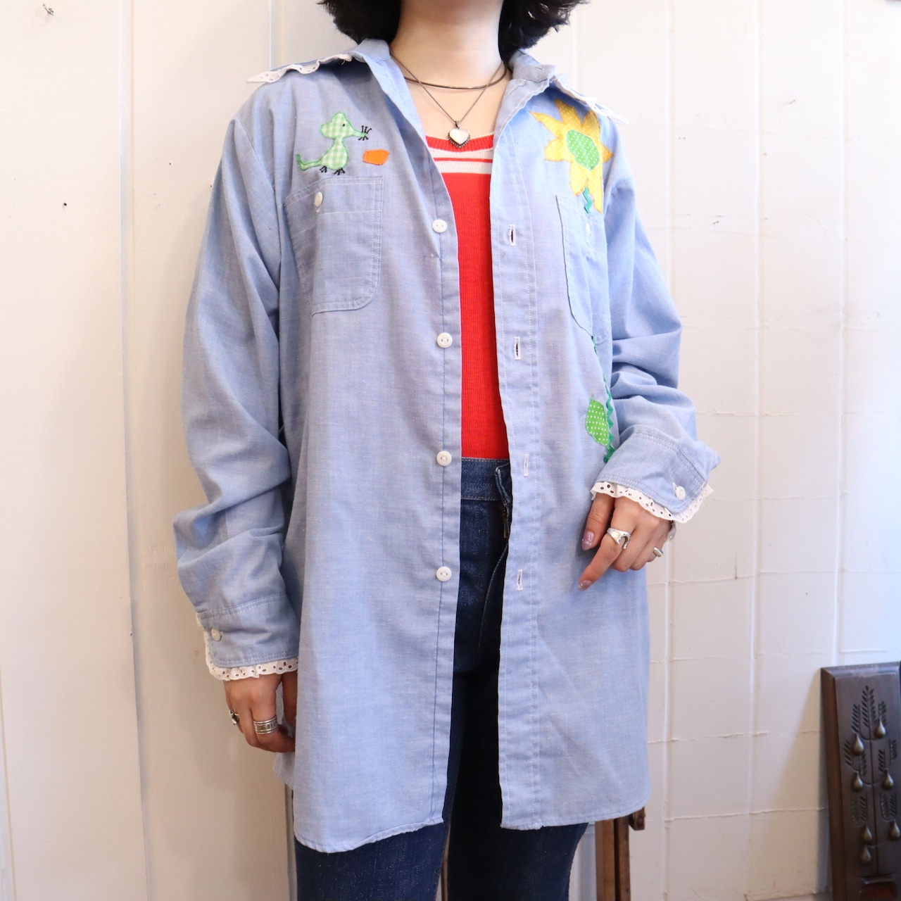 70s lightblue cat&flower applique chambray shirt [l-3620]