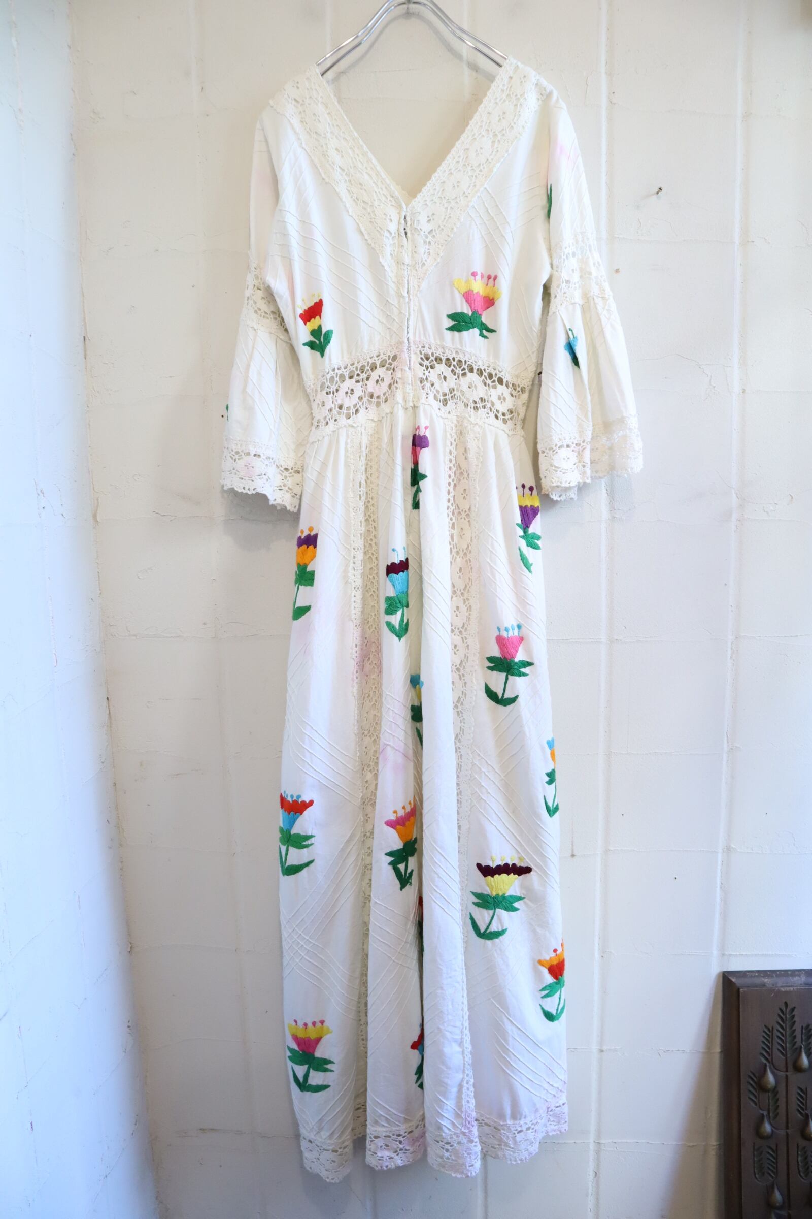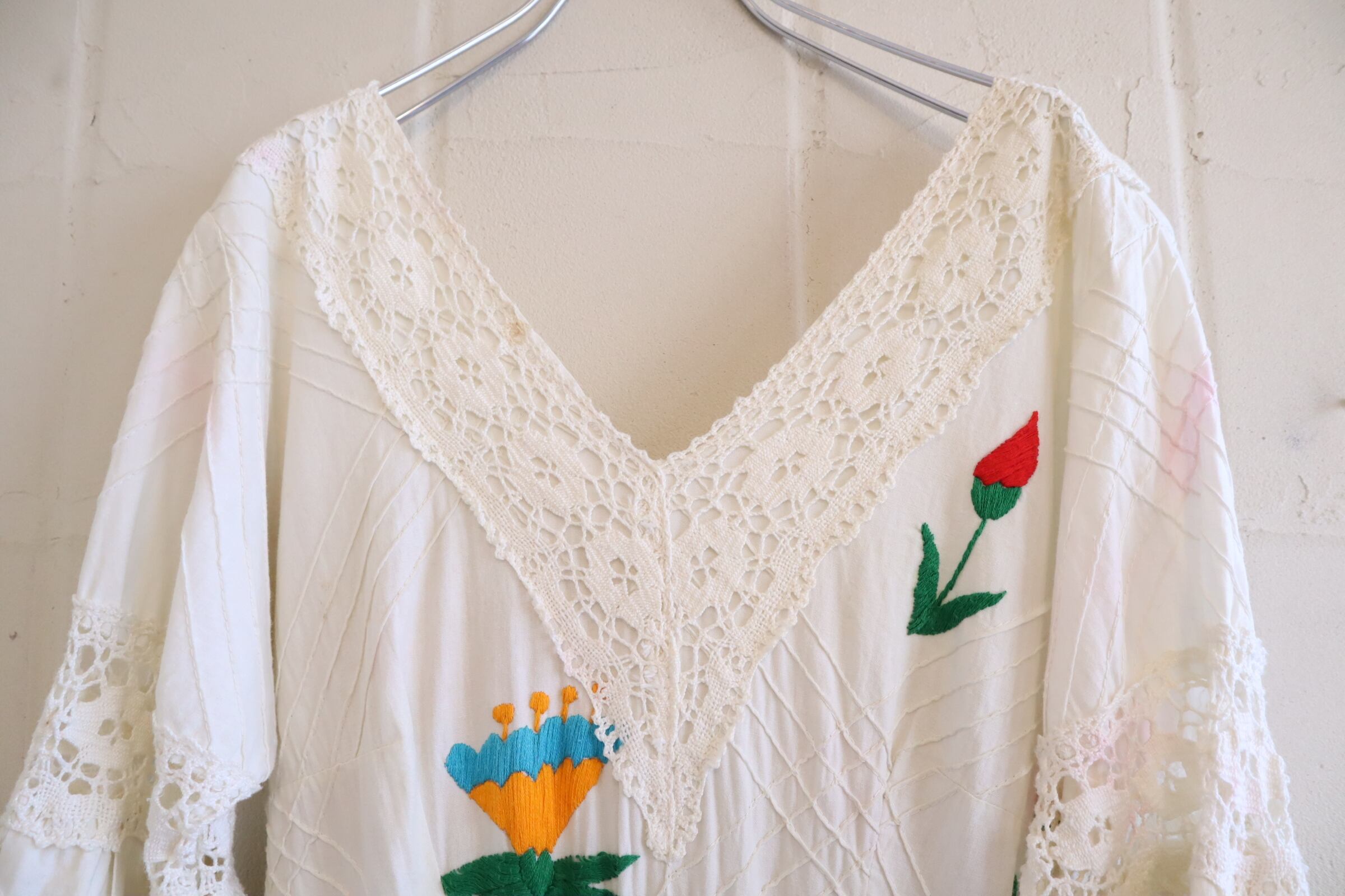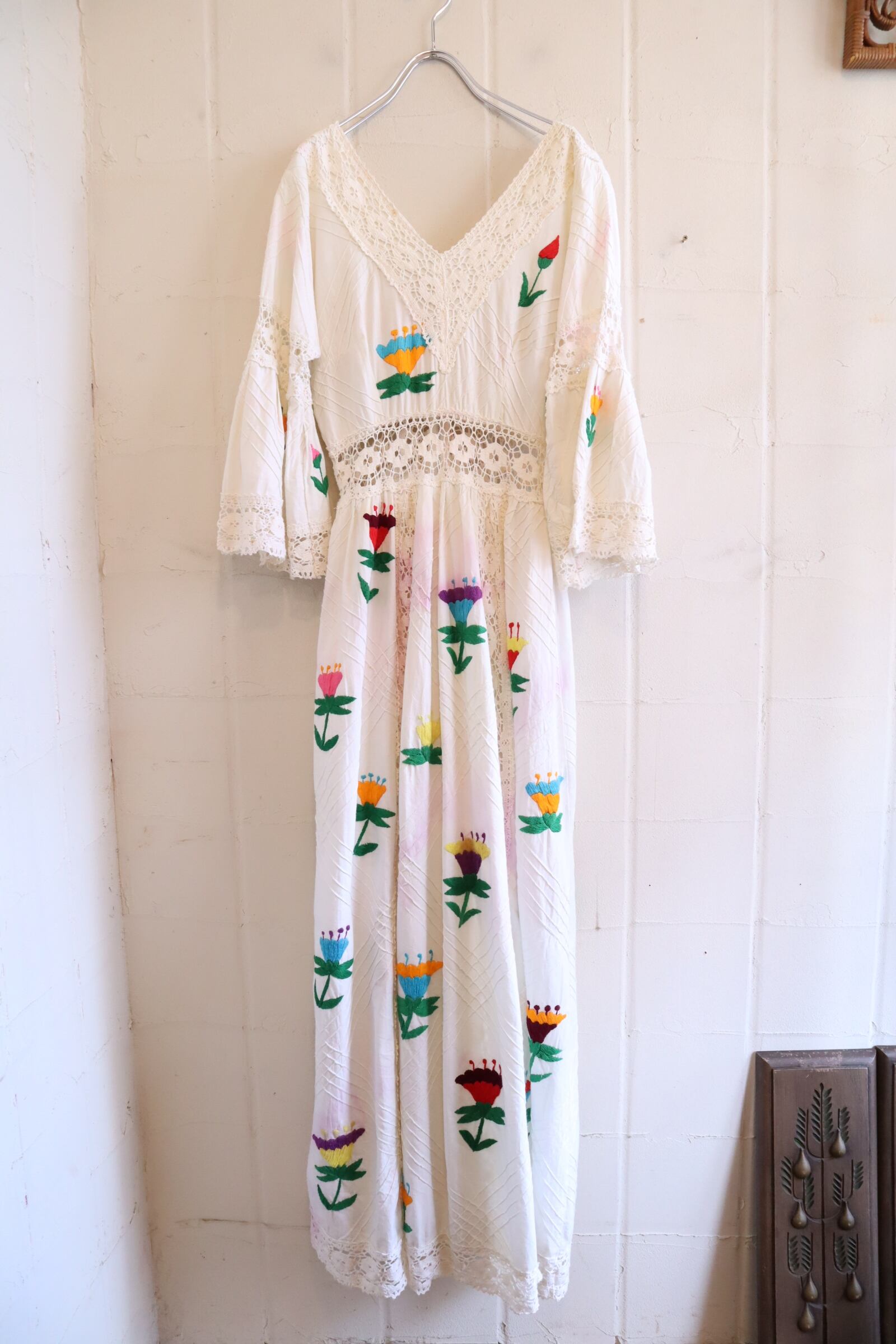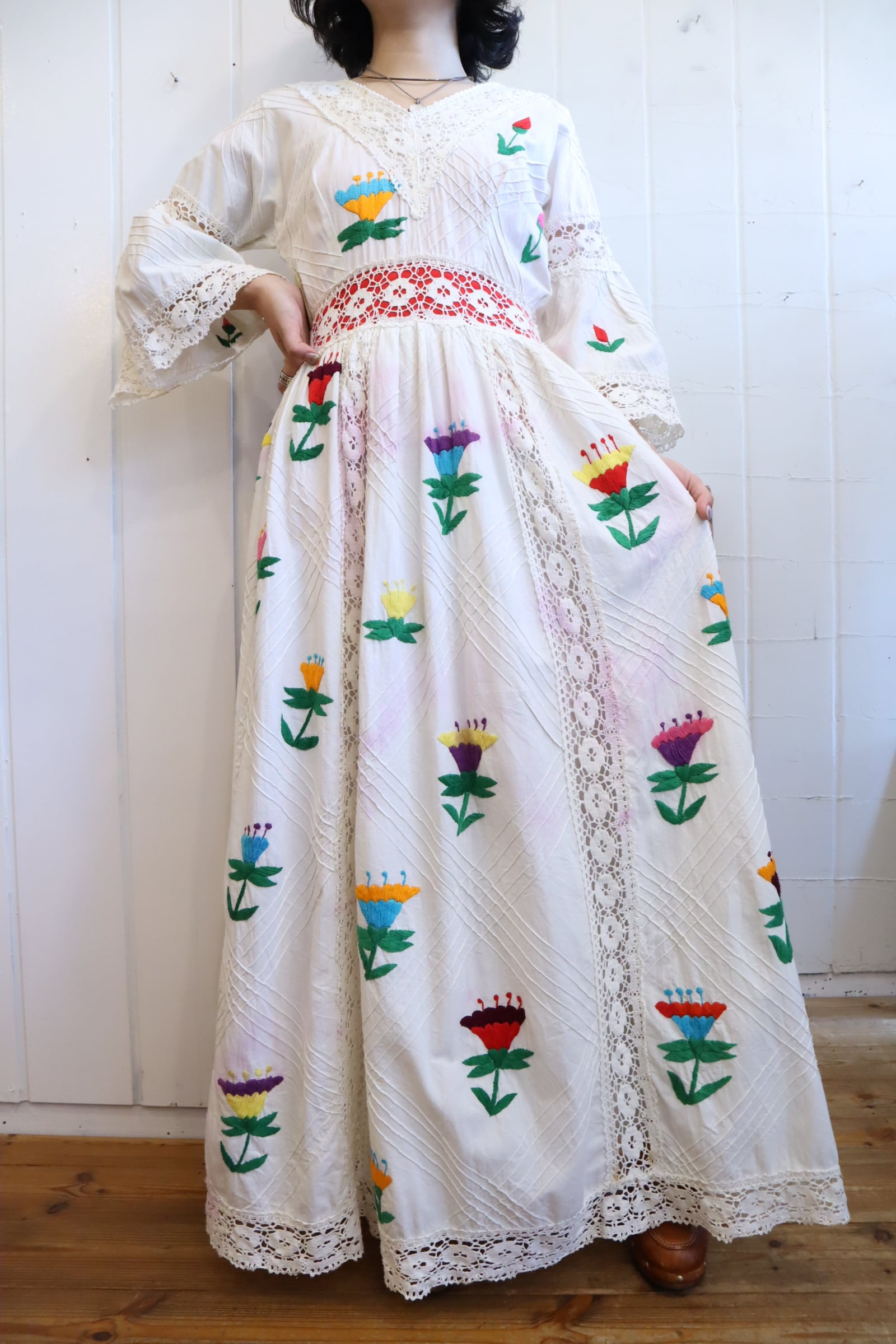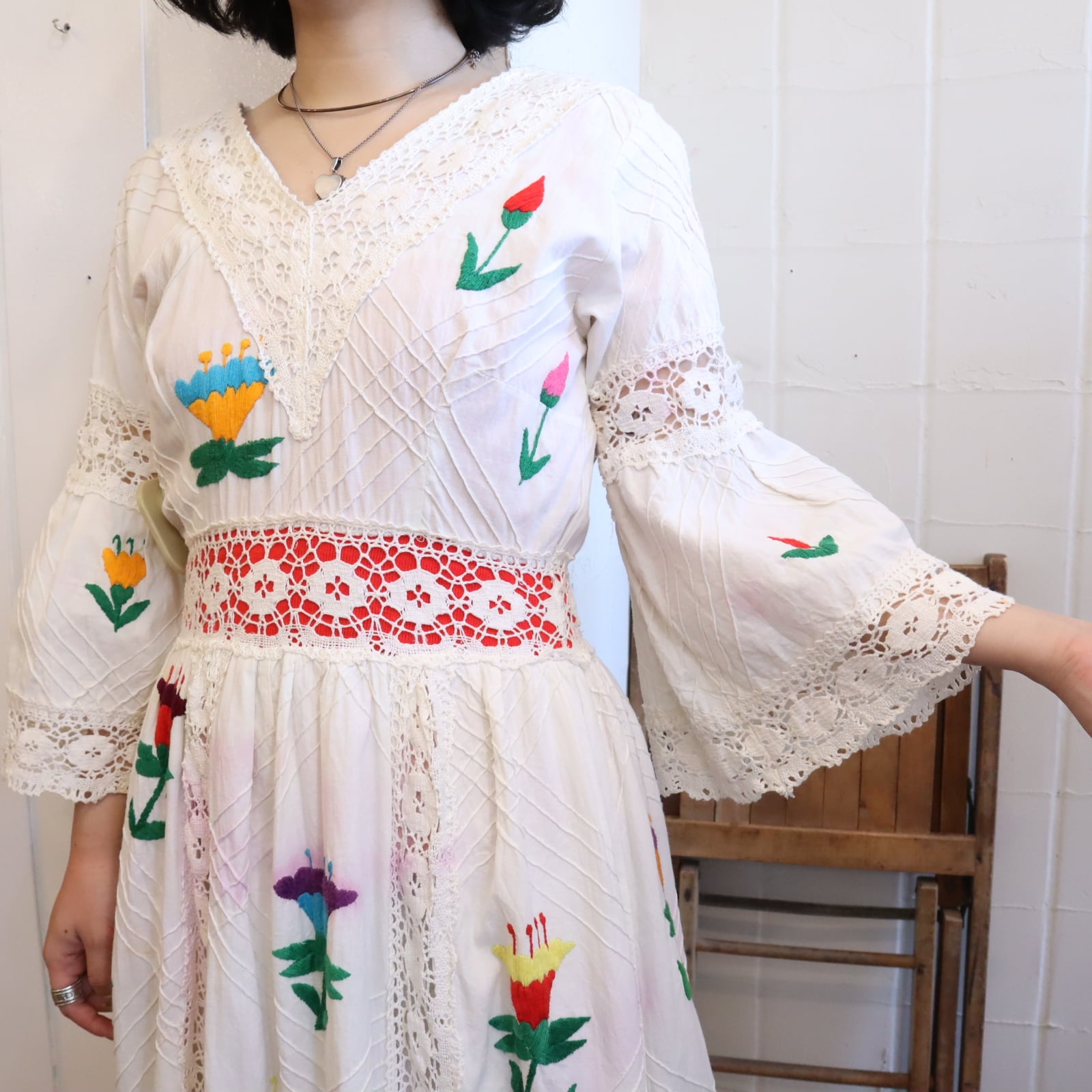 かぎ編みレースの切替とお花の刺繍が可愛いメキシカンドレス。