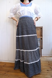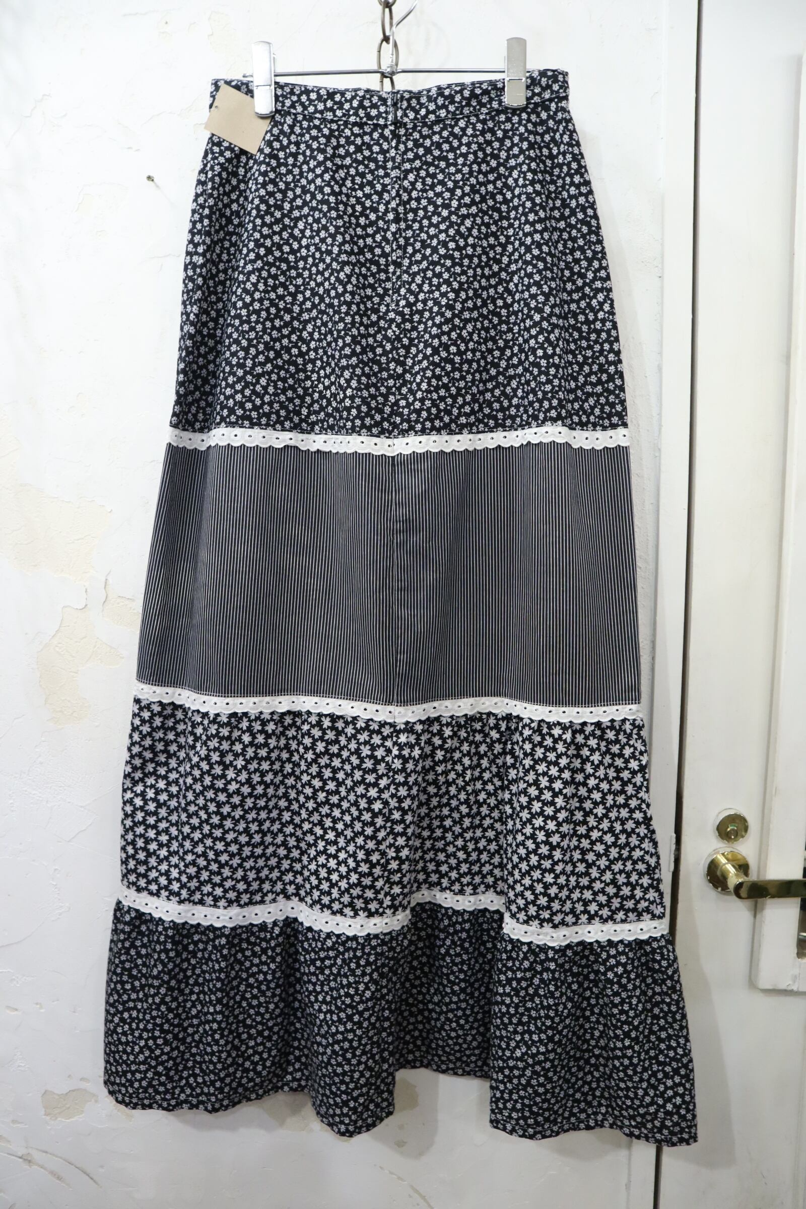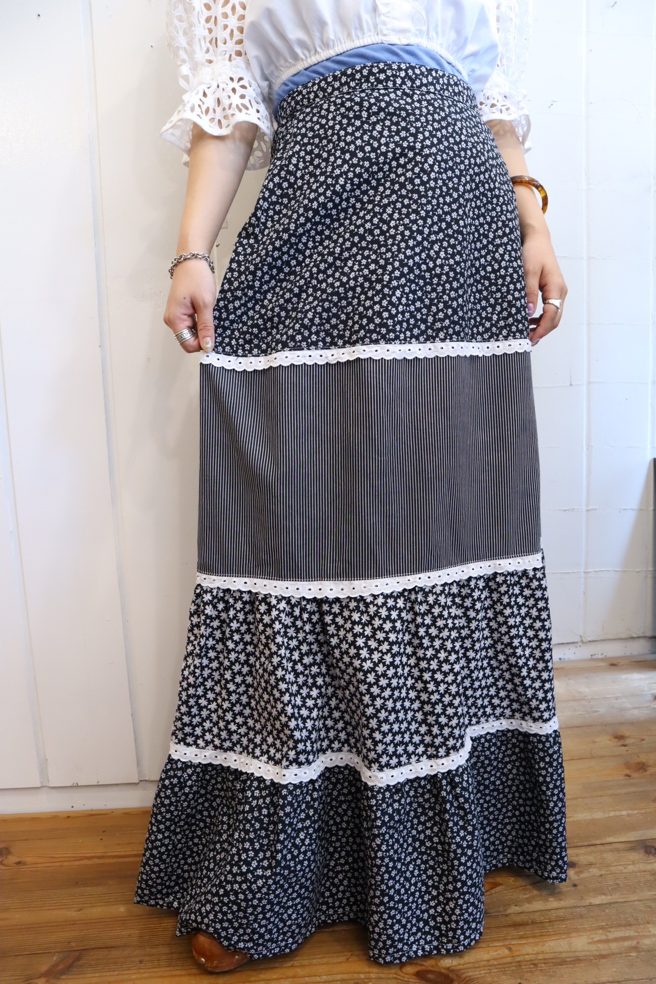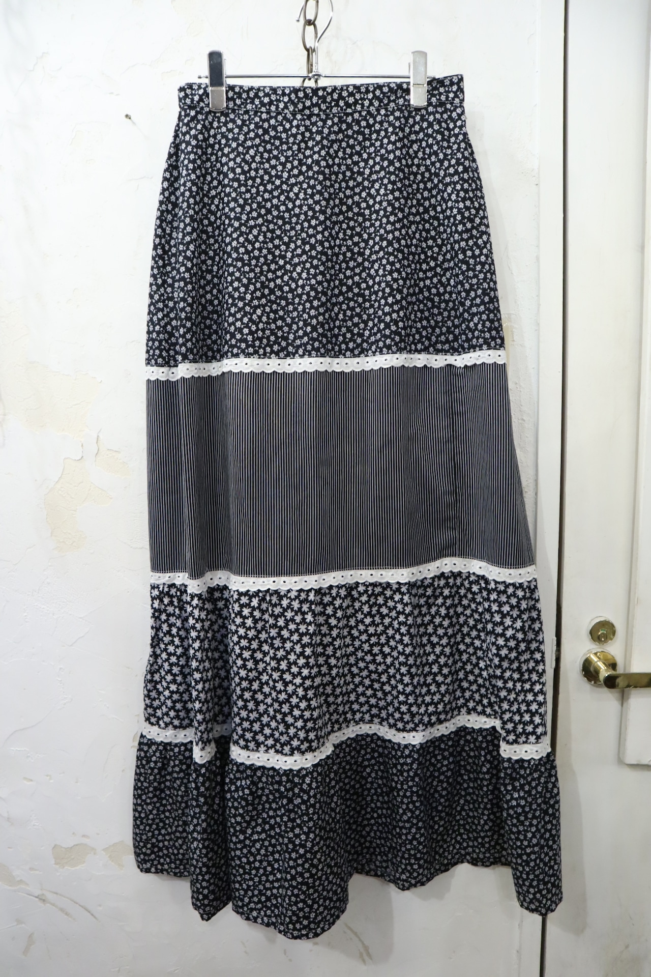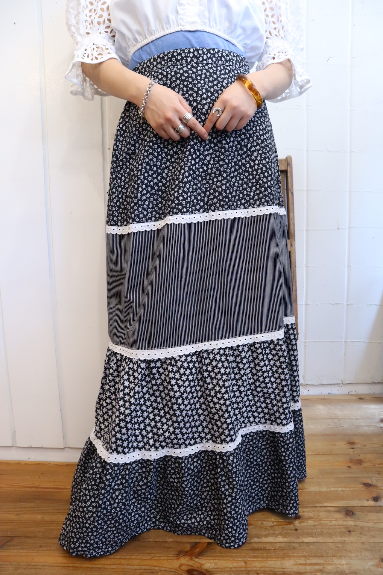 Euro 70s black×white flower&stripe long skirt [l-3661]