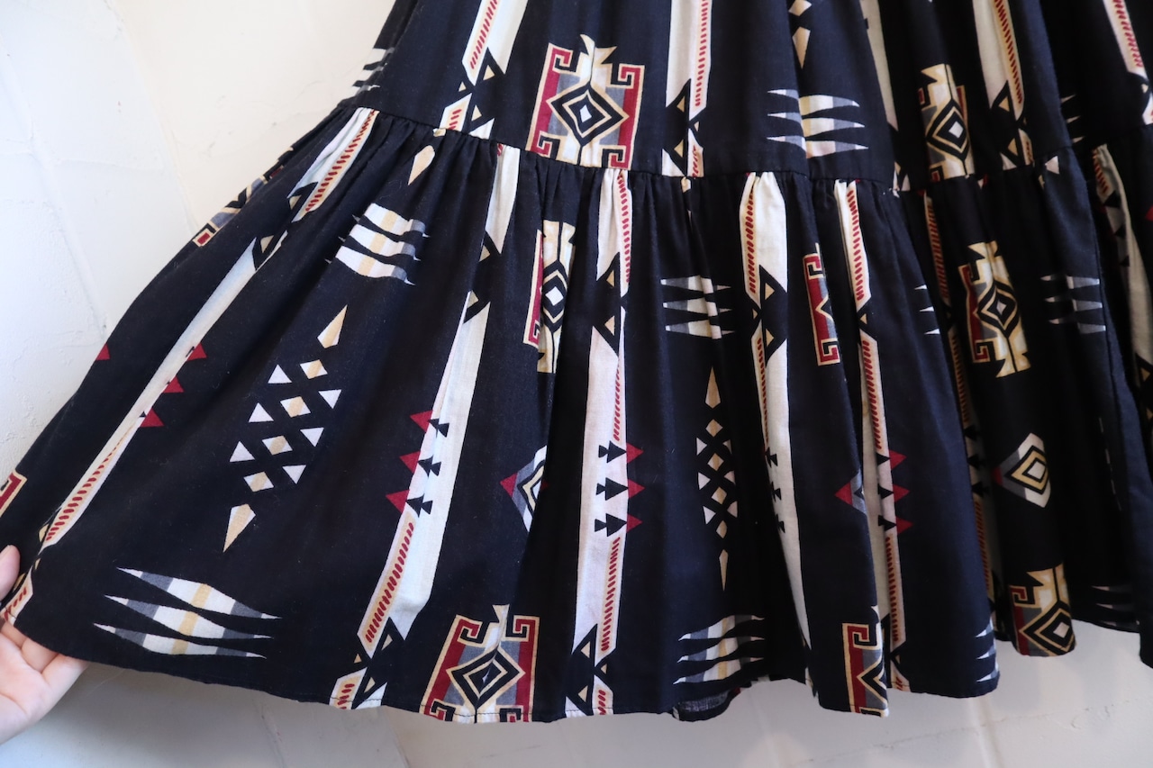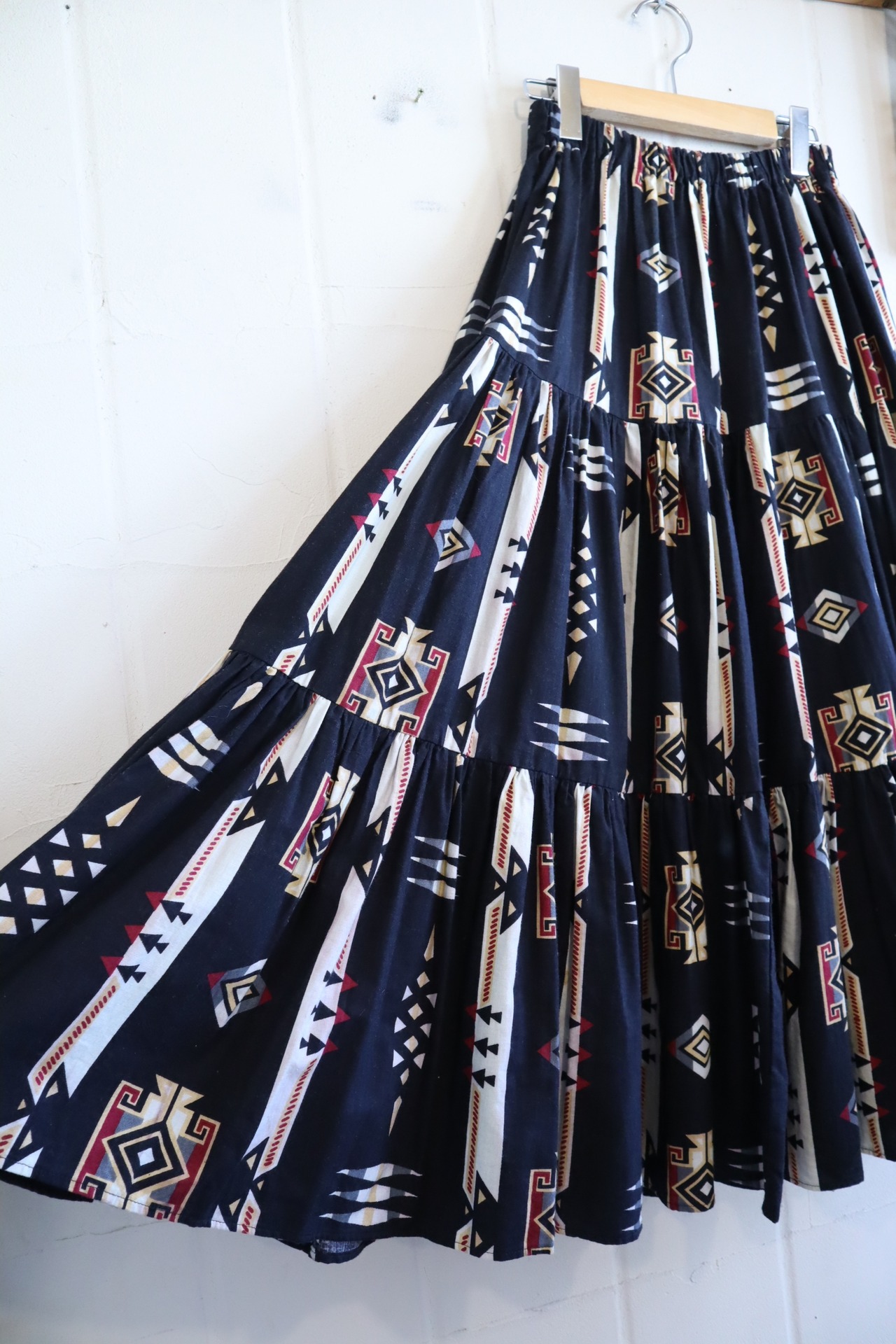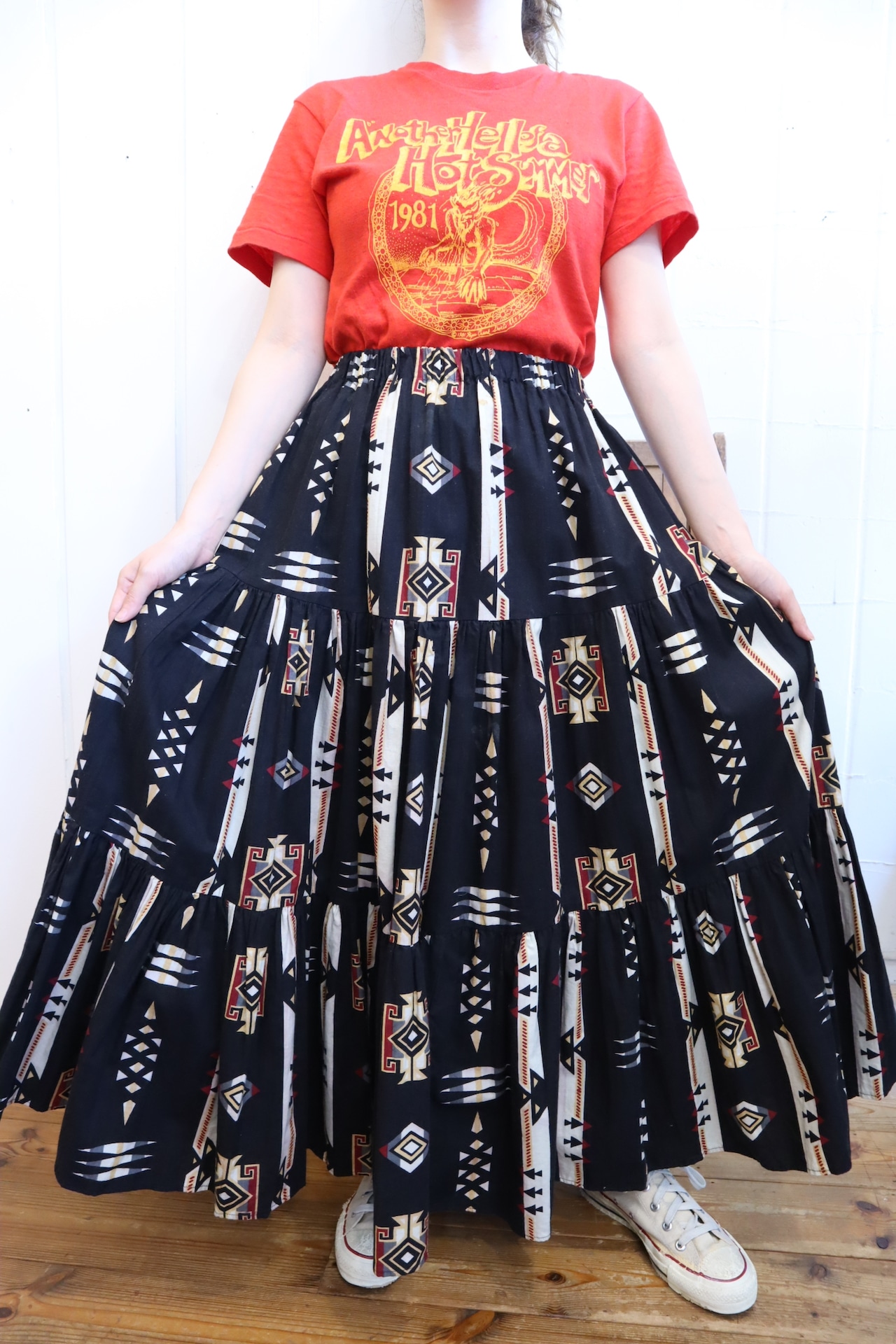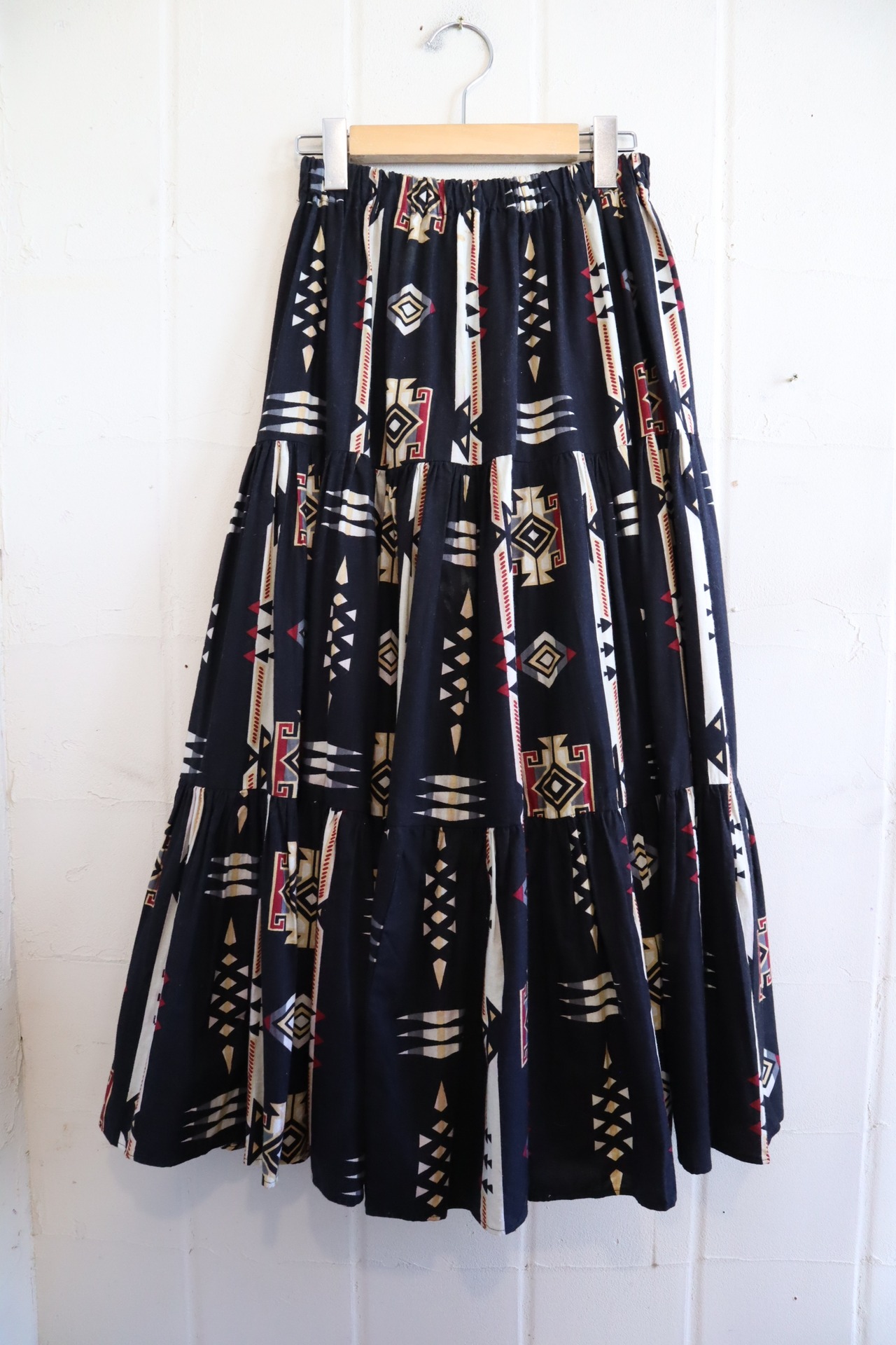 made in USA black×beige native pattern tiered skirt [l-3665]
