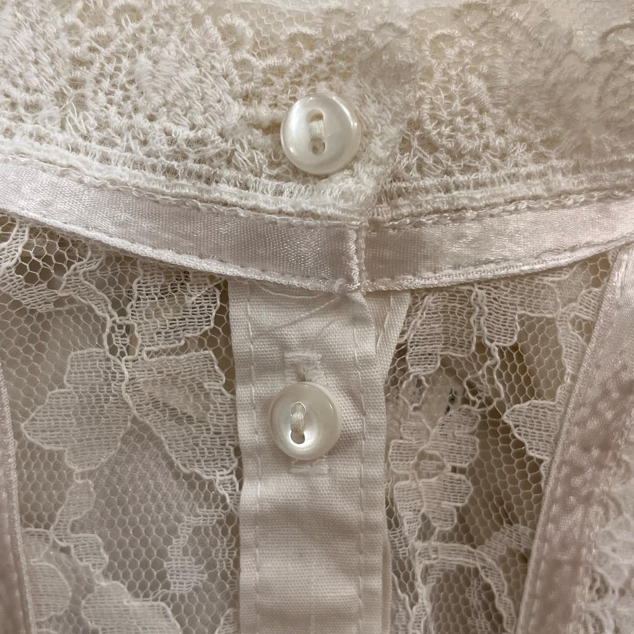 スタンドカラーにV字に切替られたレースのデザインとボリュームのあるお袖が可愛いガニーサックスのブラウスです。