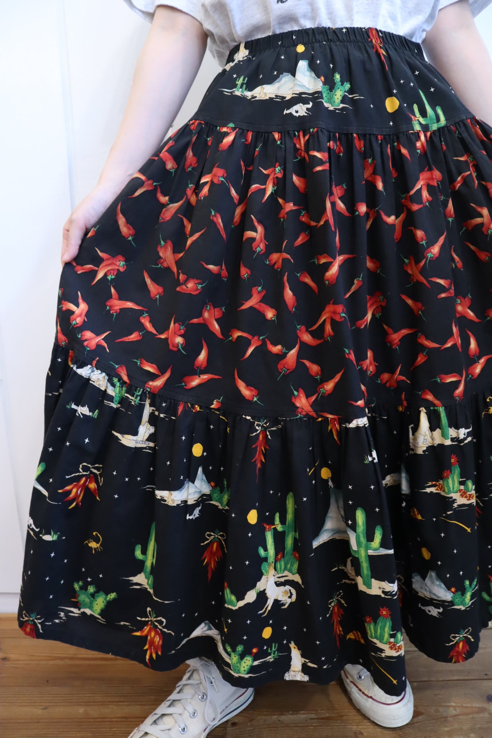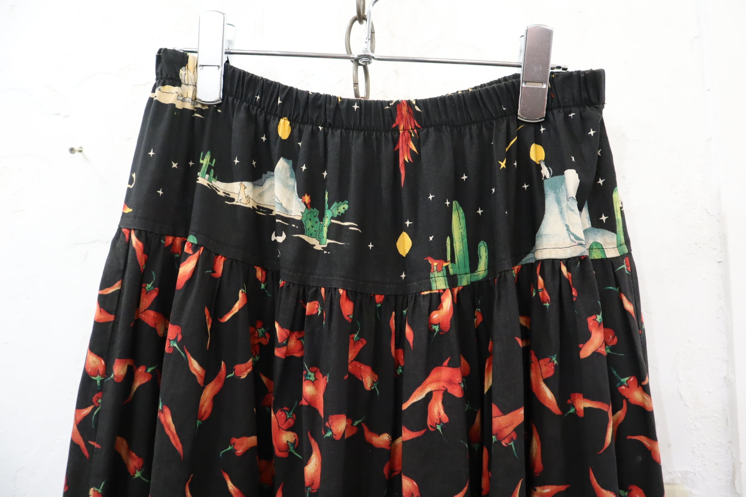 唐辛子にサボテンとユニークなデザインが可愛いティアードスカートです。