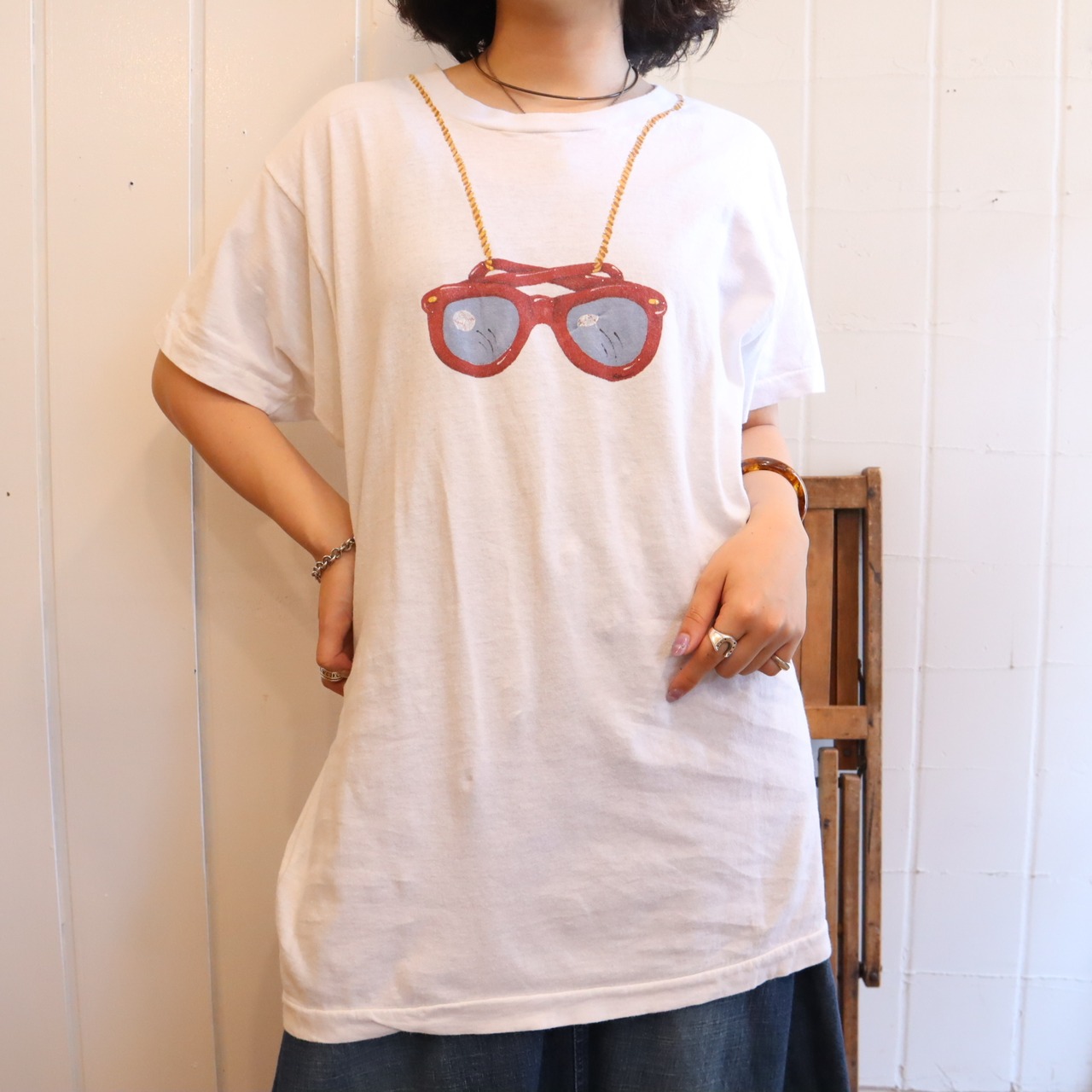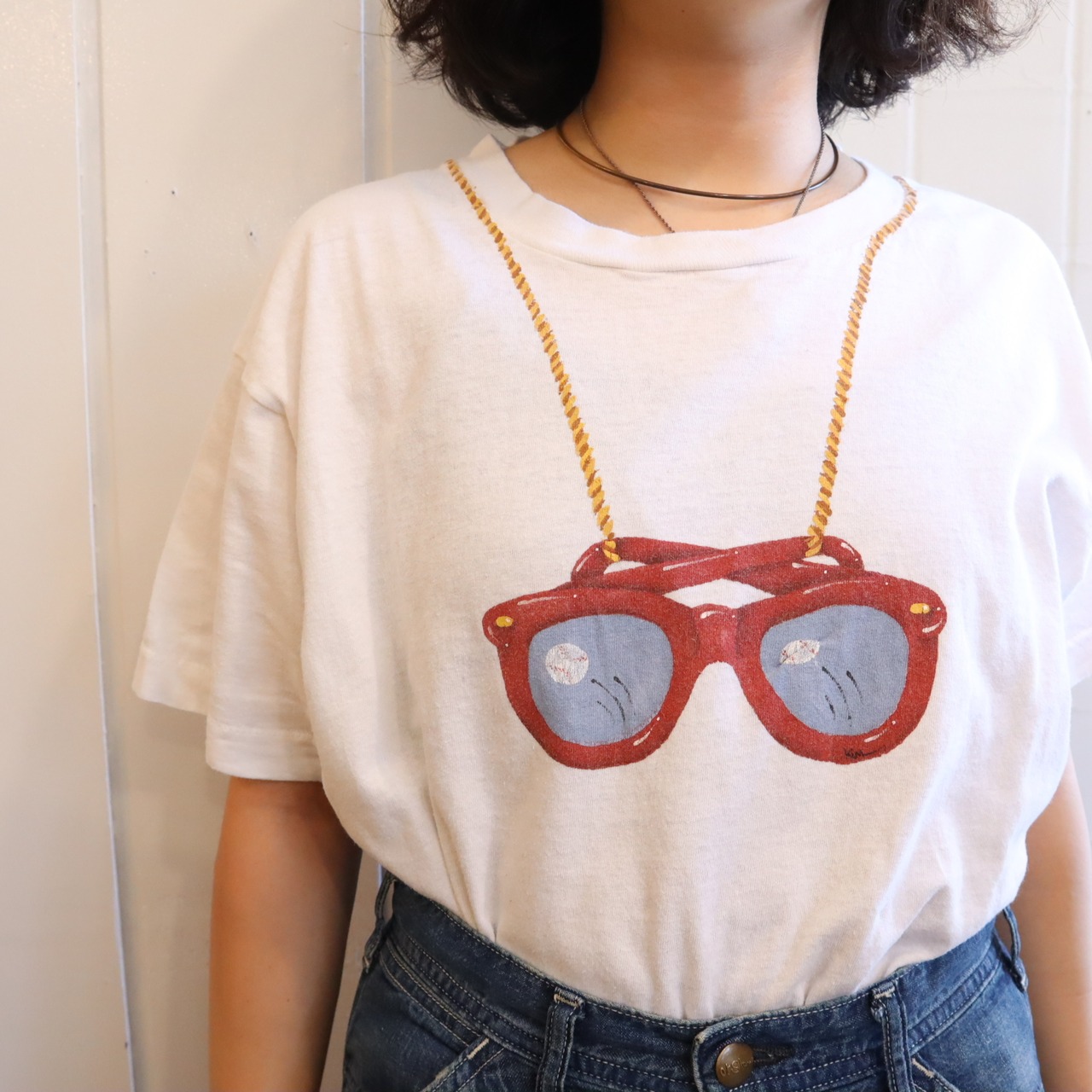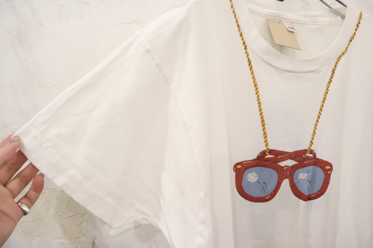 眼鏡を首に掛けたような遊び心のあるプリントが可愛い80sFRUIT OF THE LOOMのTシャツ。
