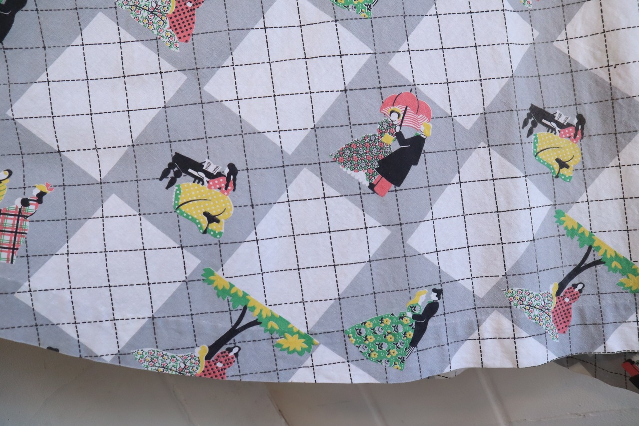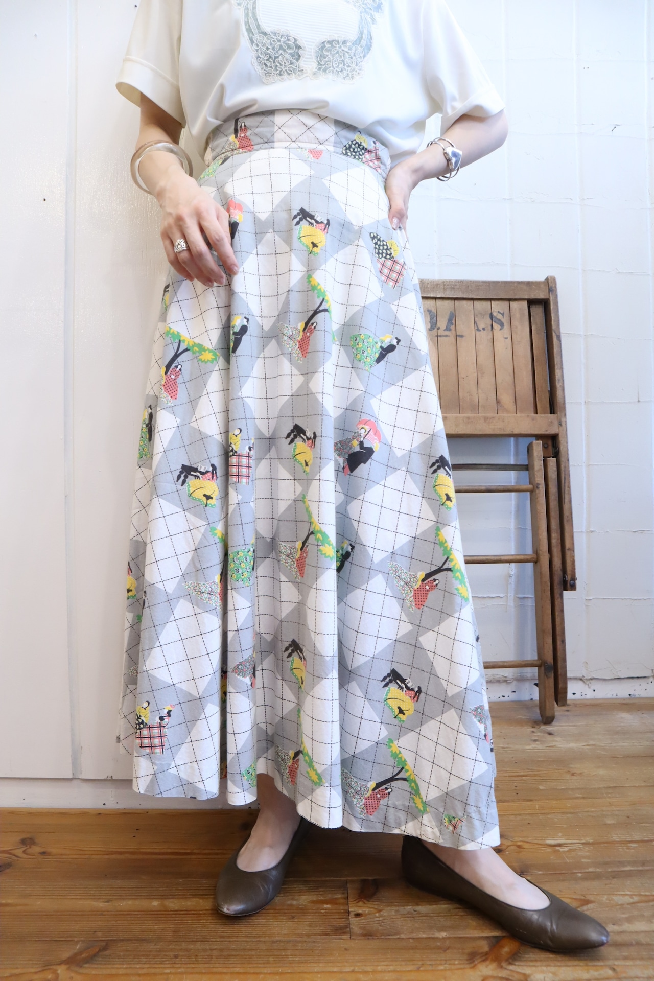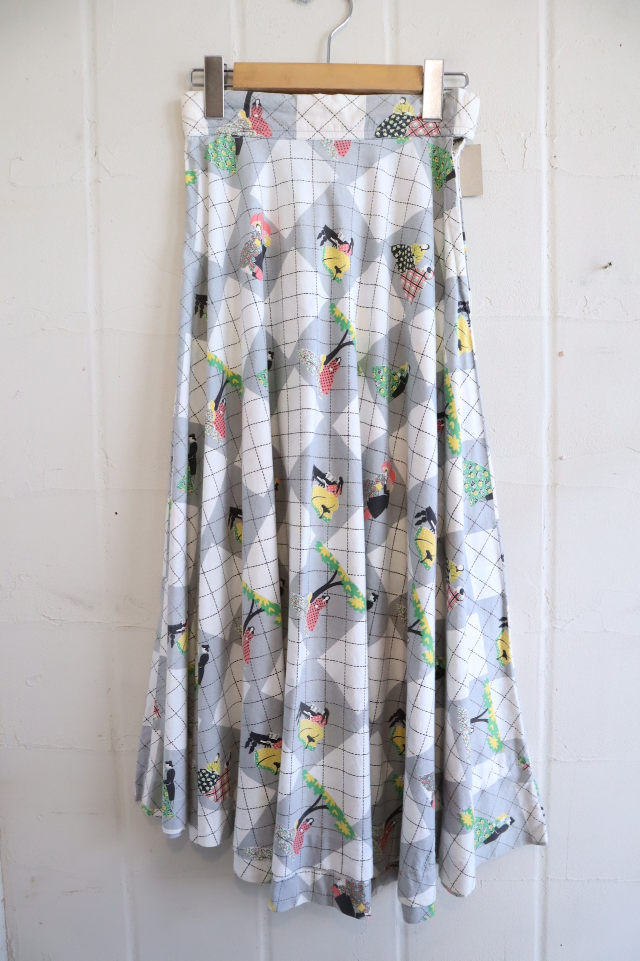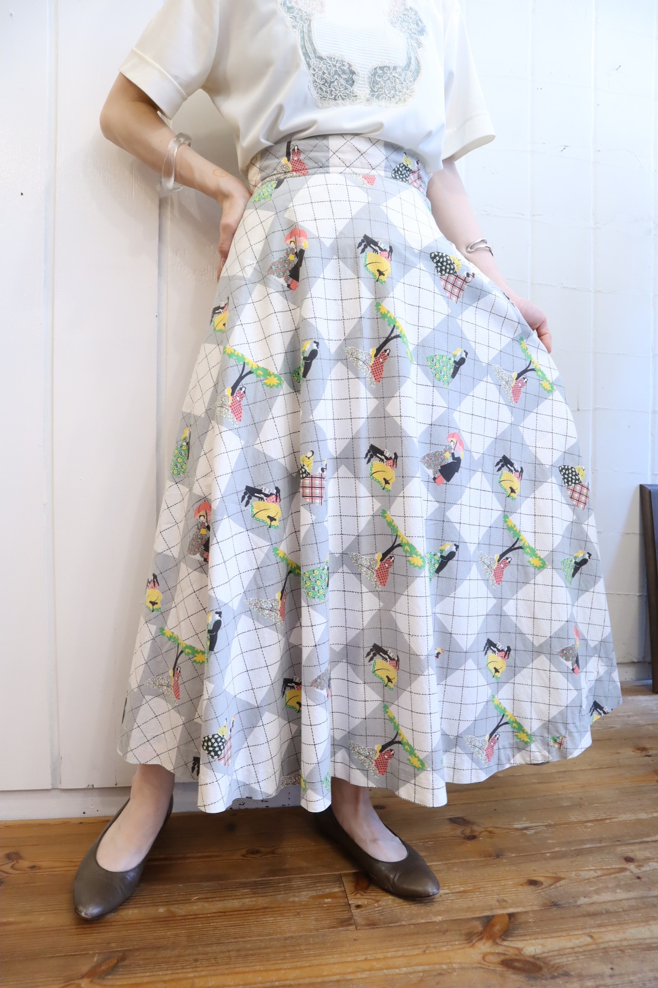 50s-60s white×gray plaid & human pattern skirt [l-3707]