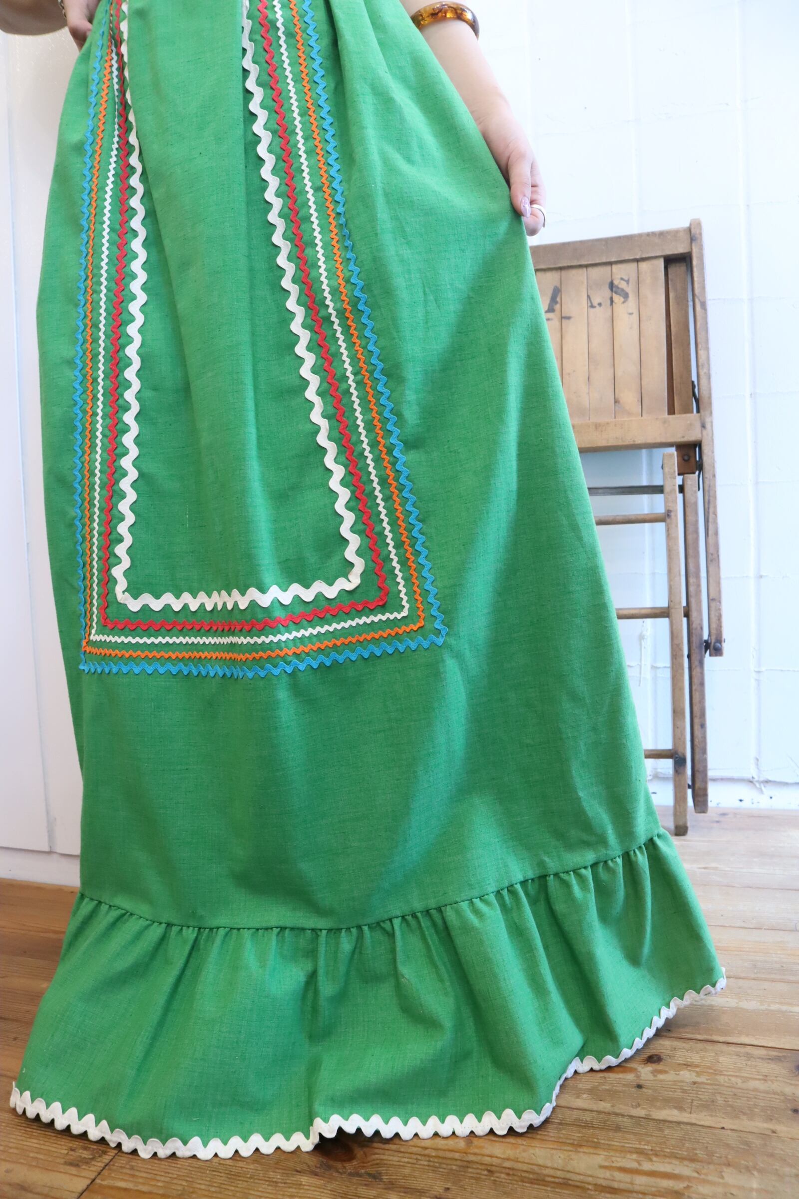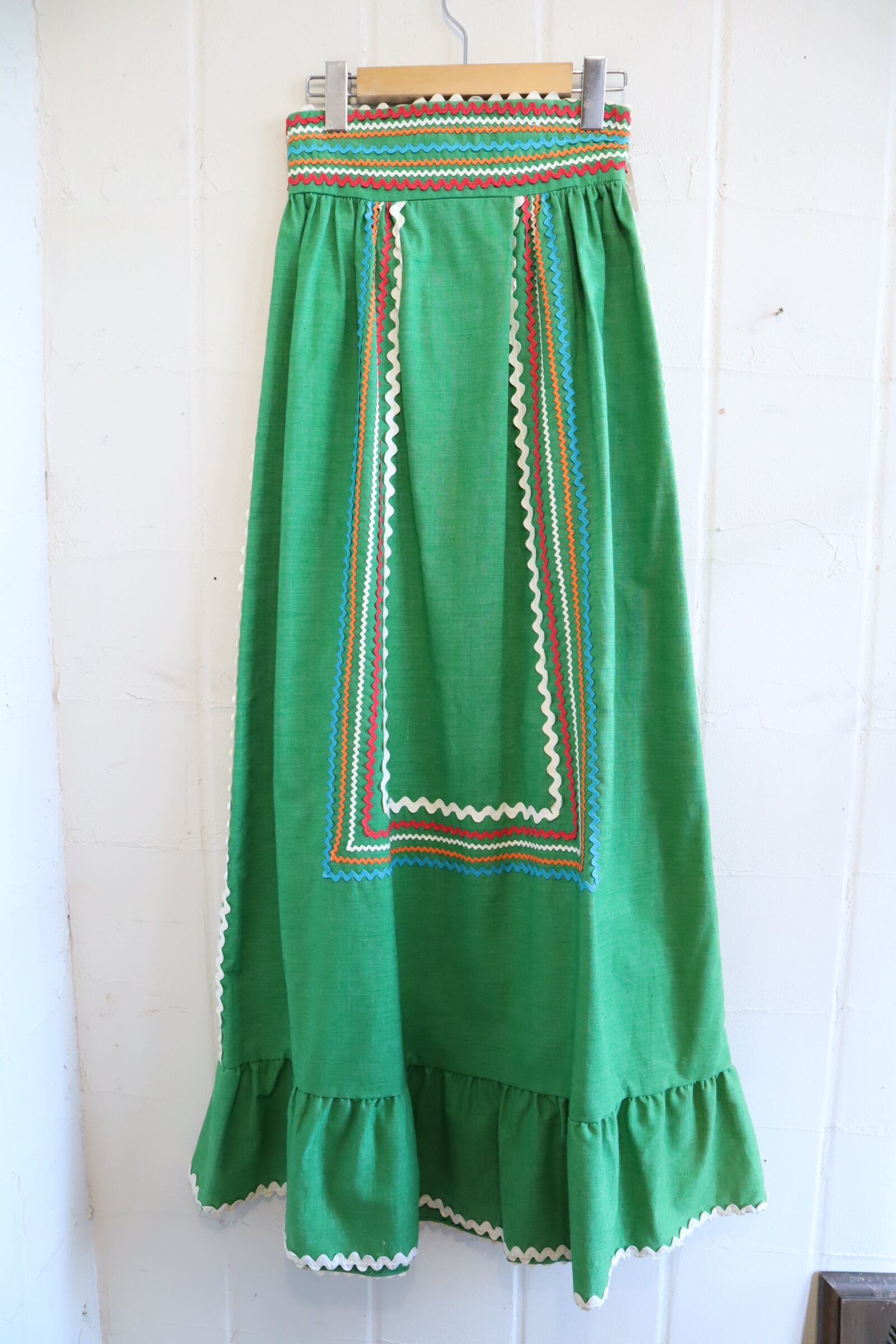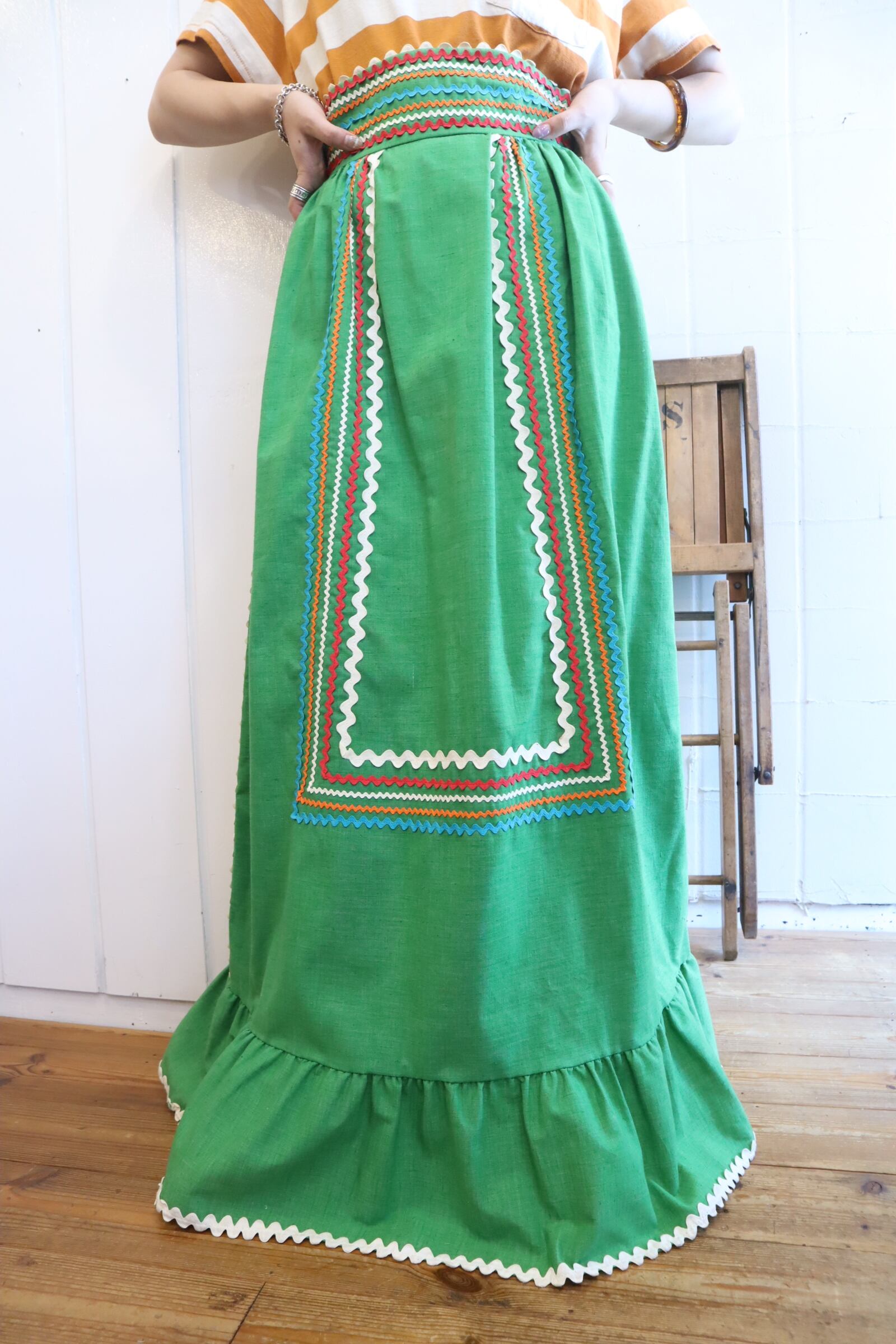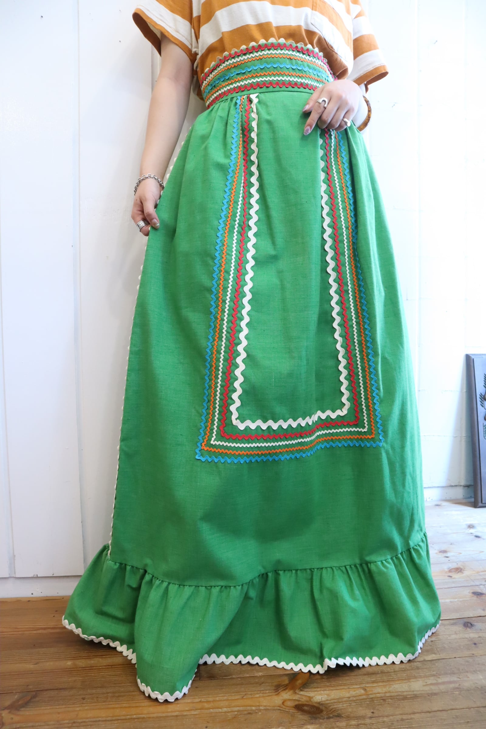 70s lightgreen×colorful tape design long skirt [l-3710]