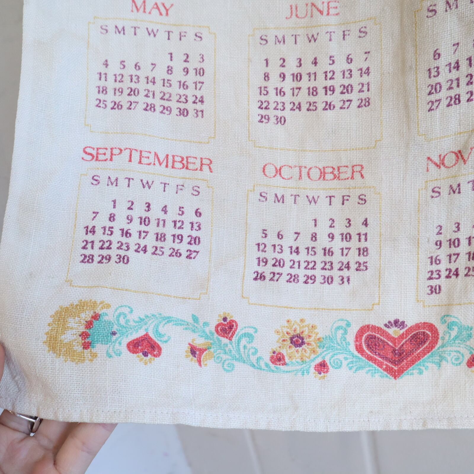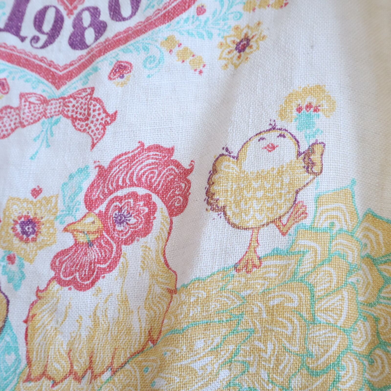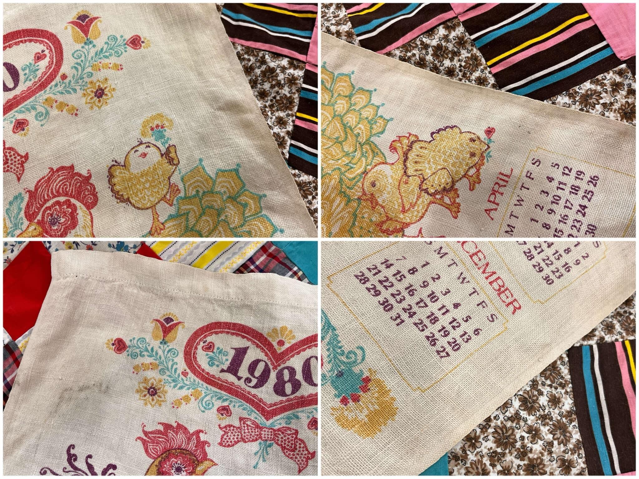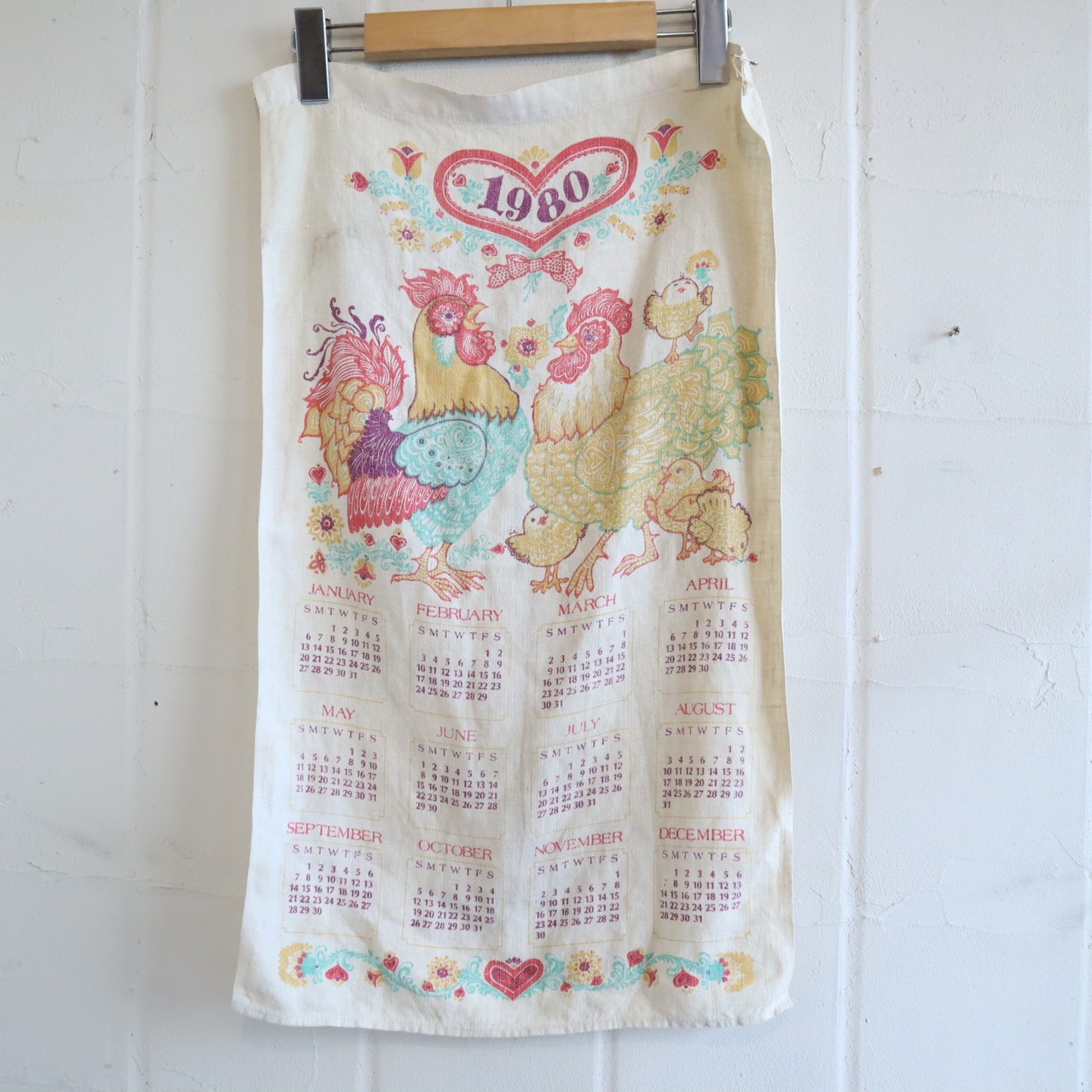 ニワトリやハートなどメルヘンな柄が可愛い1980年のカレンダータペストリー。