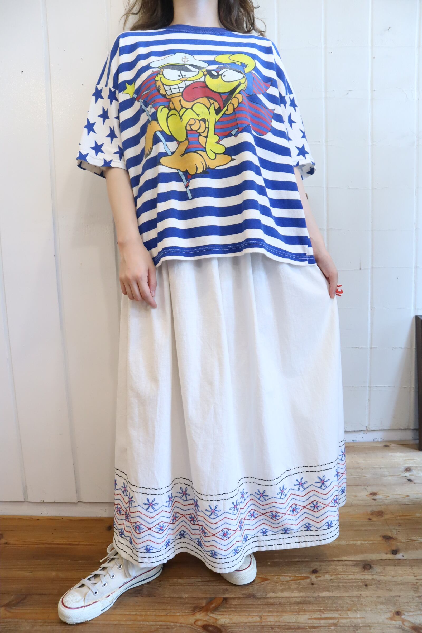 無地に映えるギザギザとお花の刺繍がとっても可愛いヴィンテージスカート。
