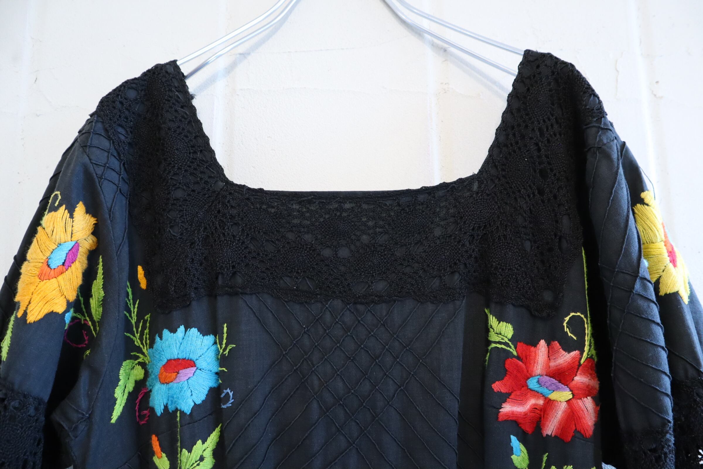 -70s black×colorful flower embroidery Mexican dress [l-3769]