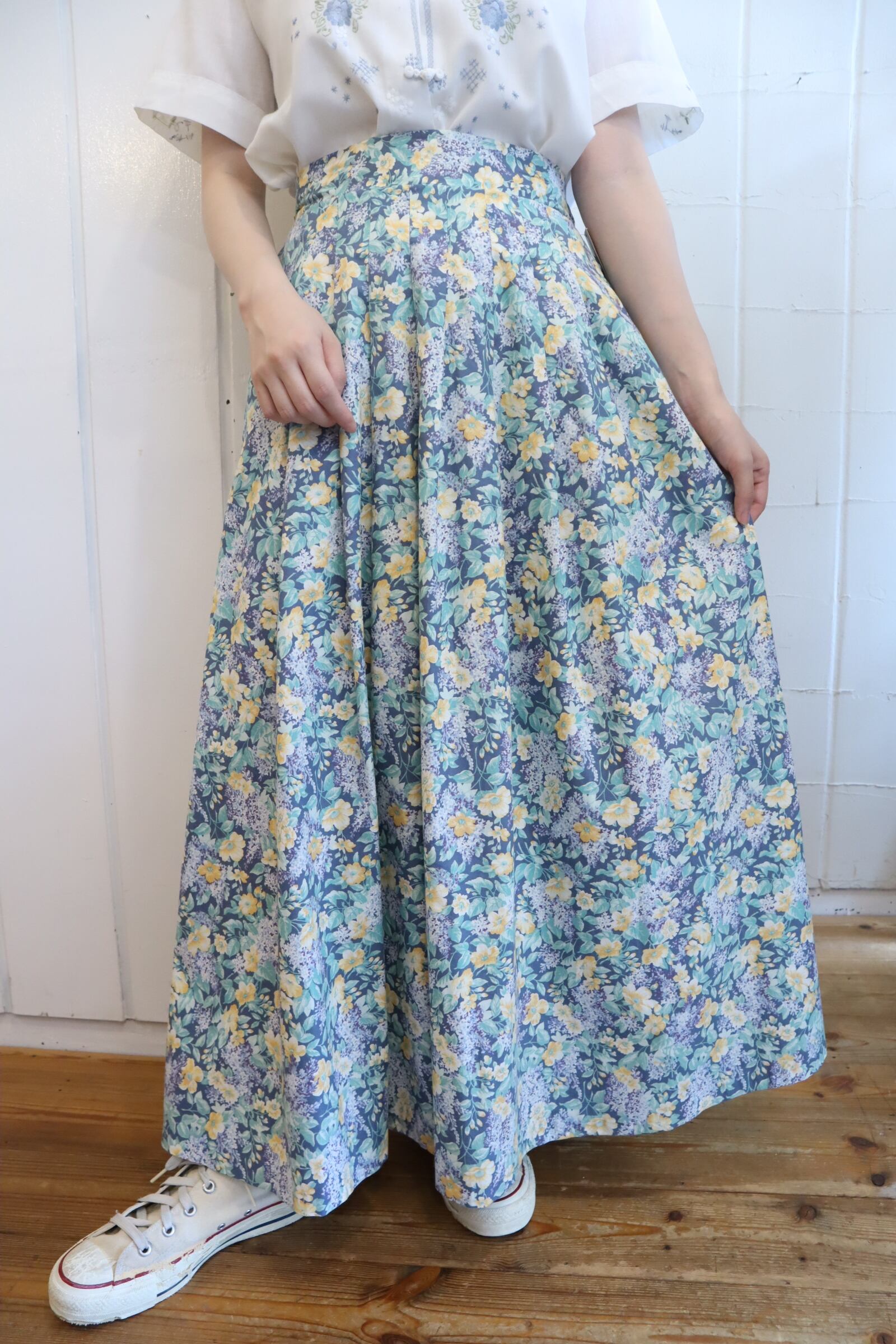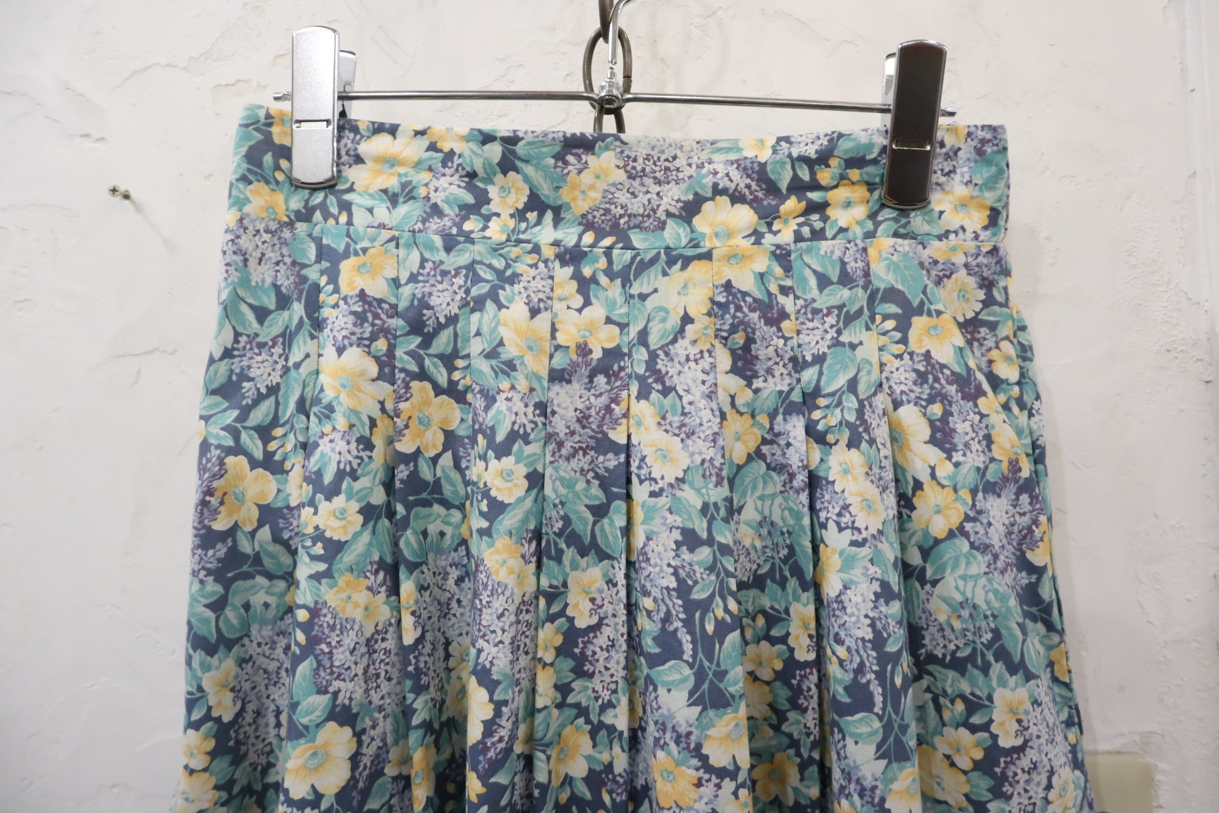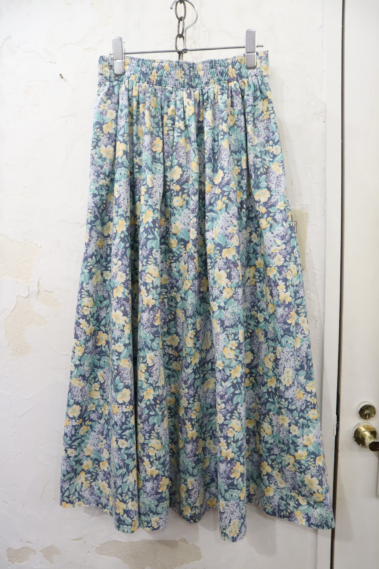 Laura Ashley blue×pailgreen×yellow flower pattern skirt [l-3781]