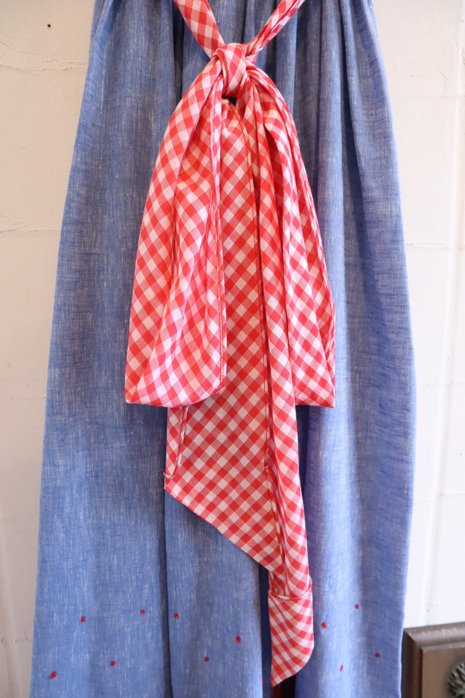 70s blue×red embroidery ginghamcheck ribbon dress [l-3782]