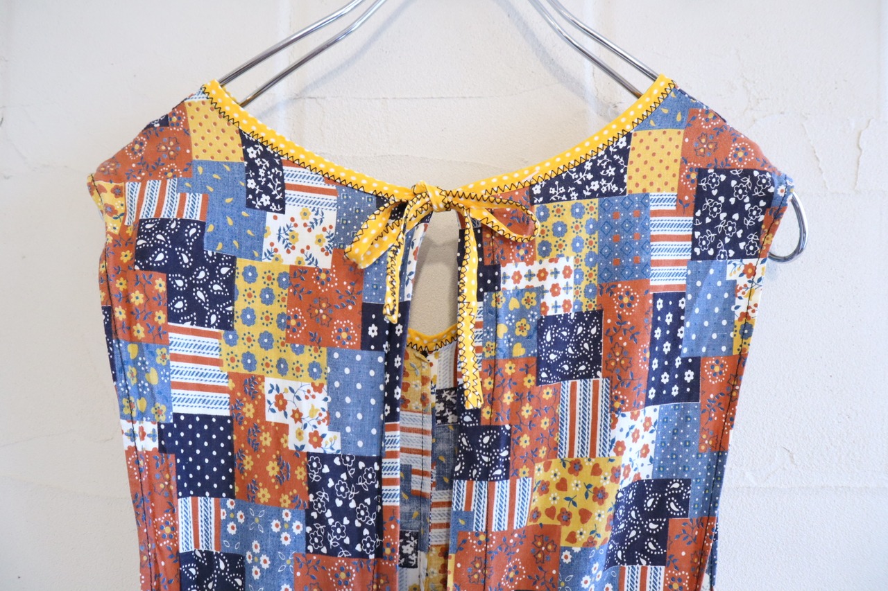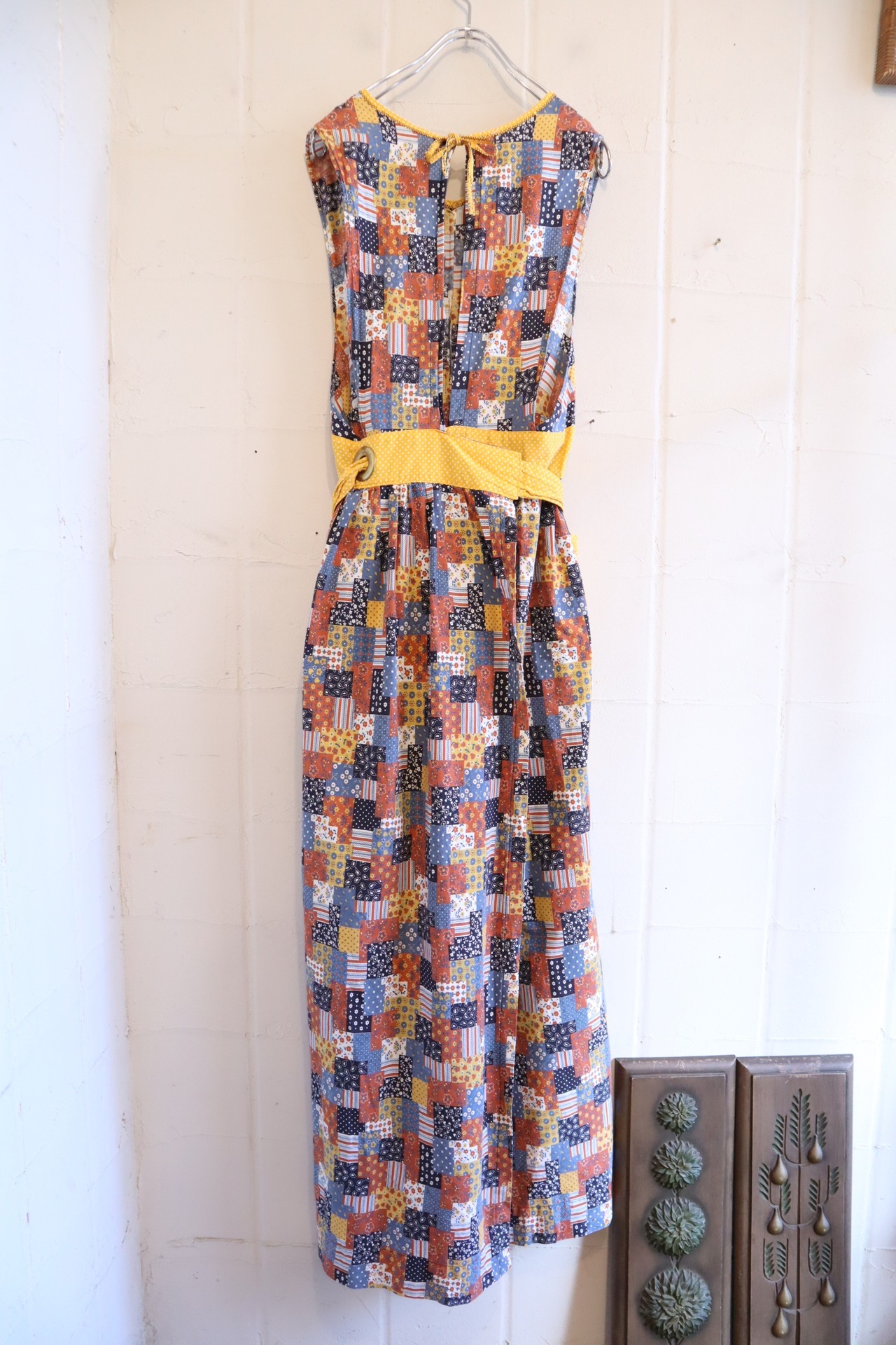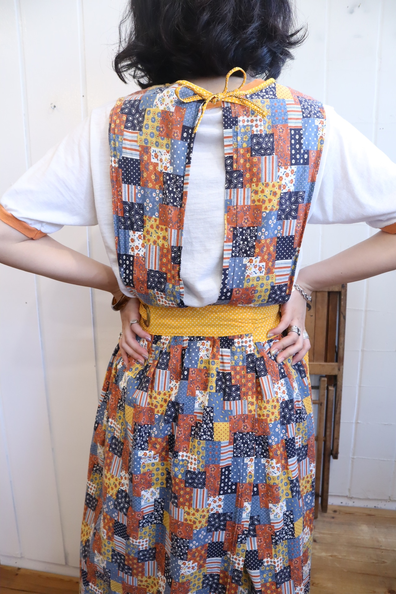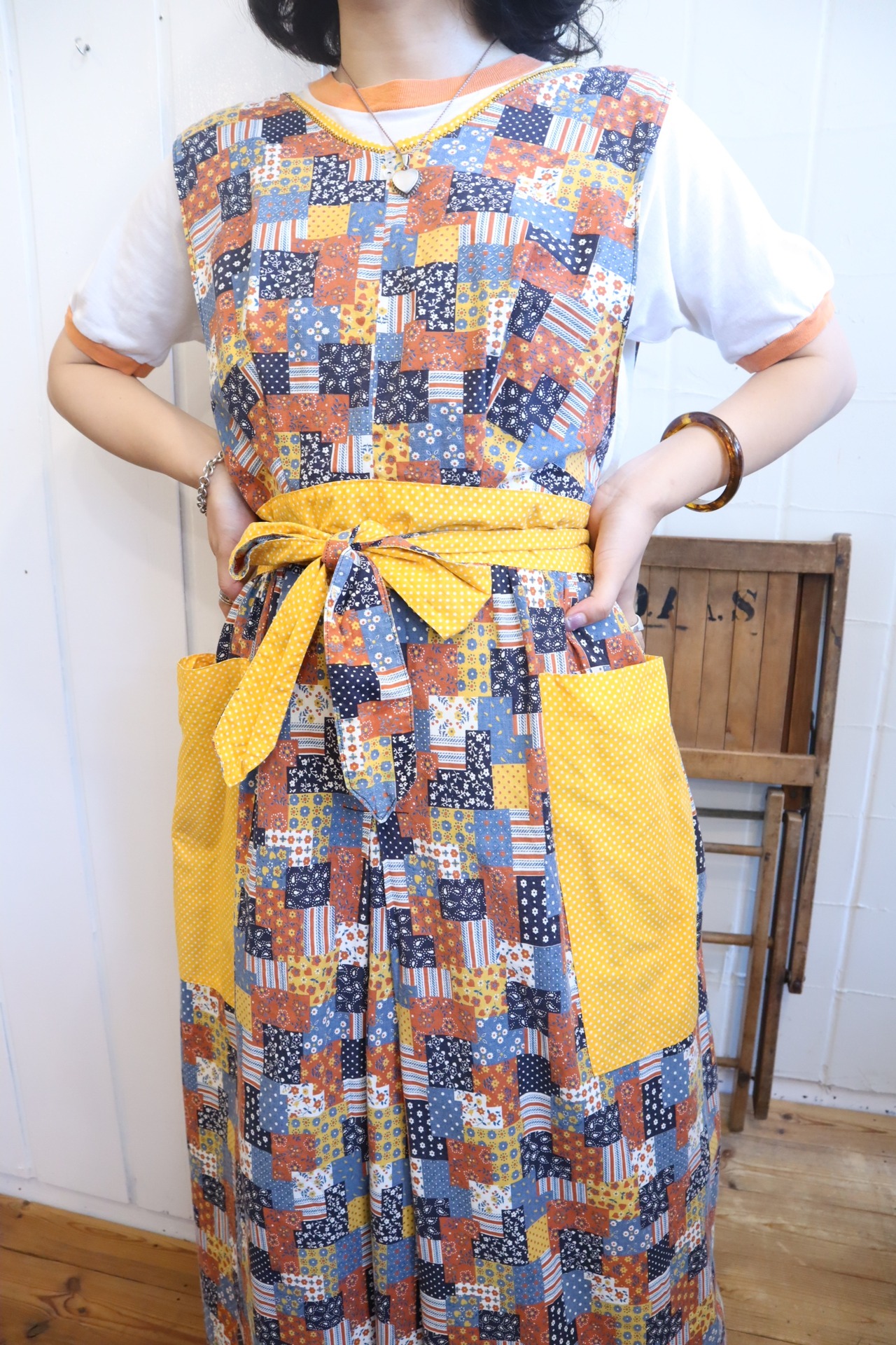 70s yellow×colorful patchwork print apron dress [l-3784]