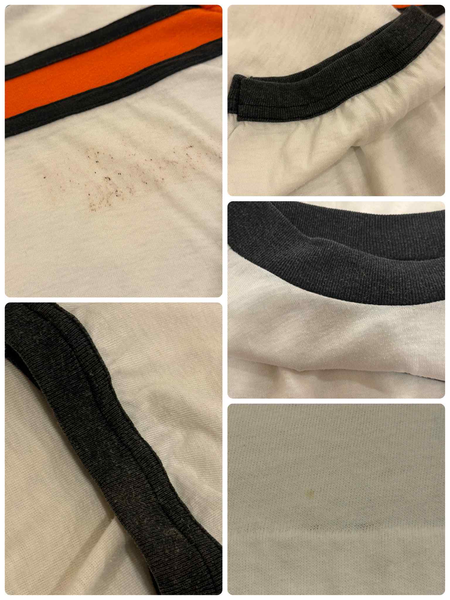 いくつか生地の毛羽立ちや小さな汚れ、胸元プリントの剥がれがございますが、古着の味として着て頂けるかと思います。