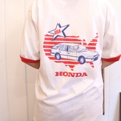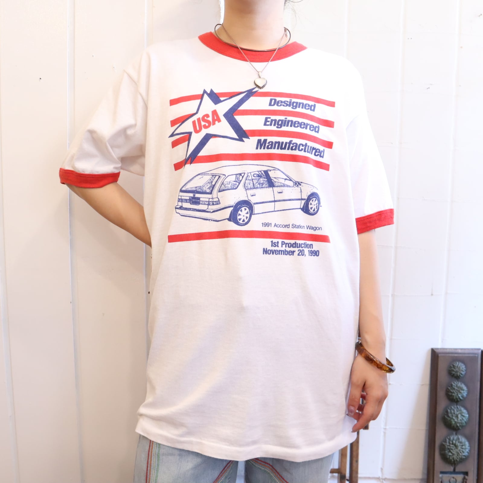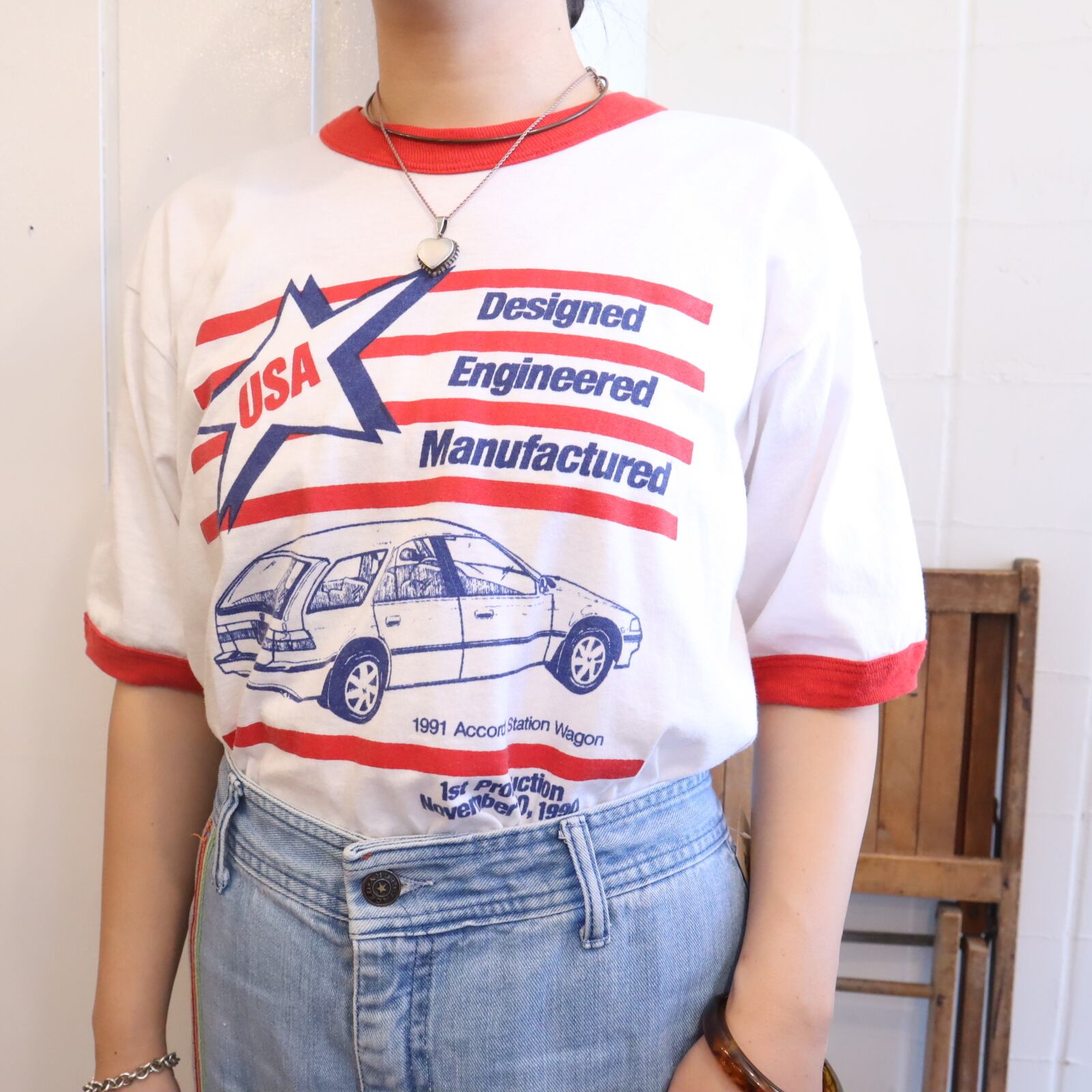 90s white×red×blue rubber print ringer T-shirt [k-3787]