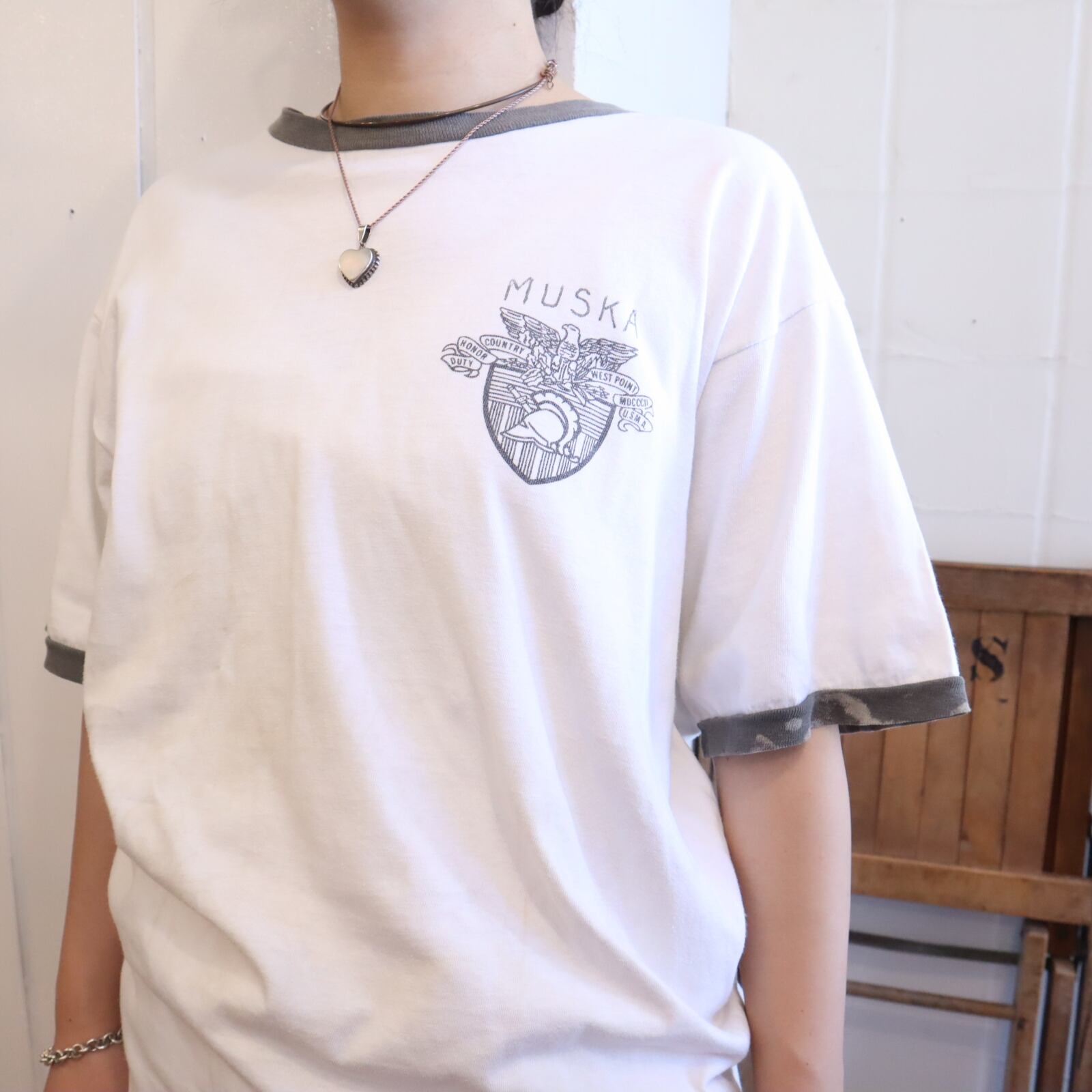 70s-80s champion white×khaki USMA print ringer T-shirt [k-3788]