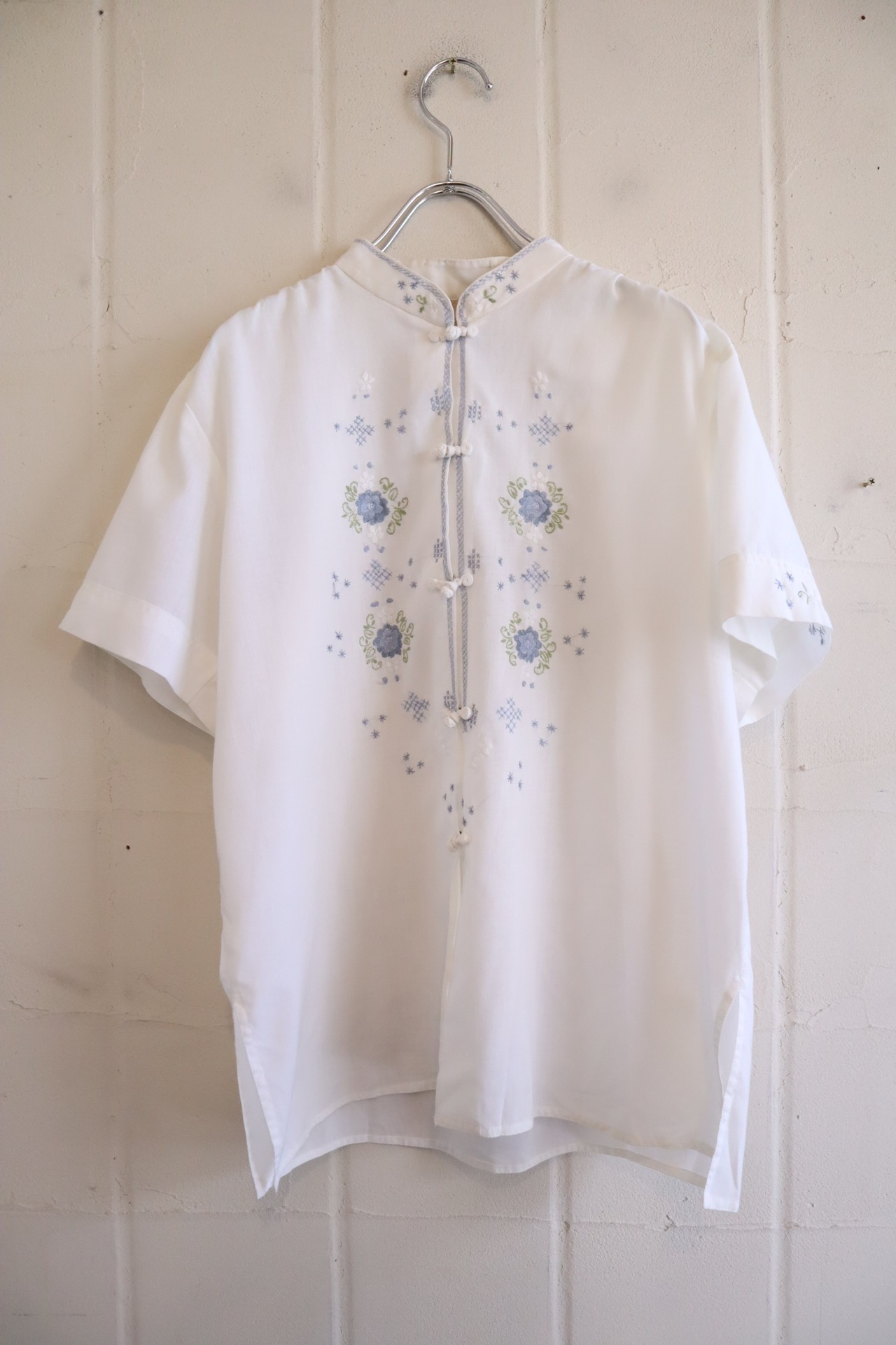 ほわっと優しいカラーリングの刺繍がとっても可愛いチャイナシャツ。