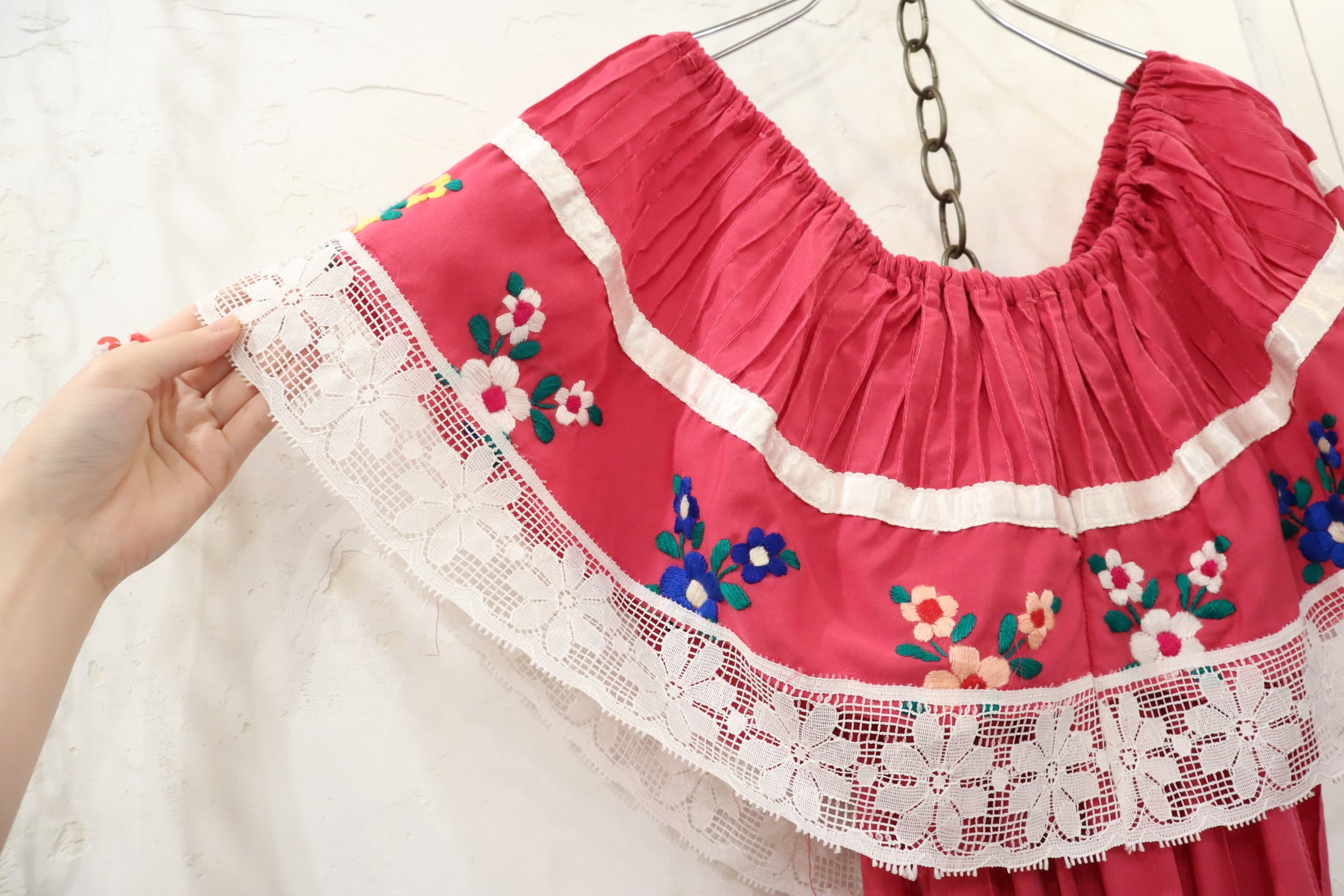 pink×white×colorful flower embroidery&lace Mexican dress [l-3803]