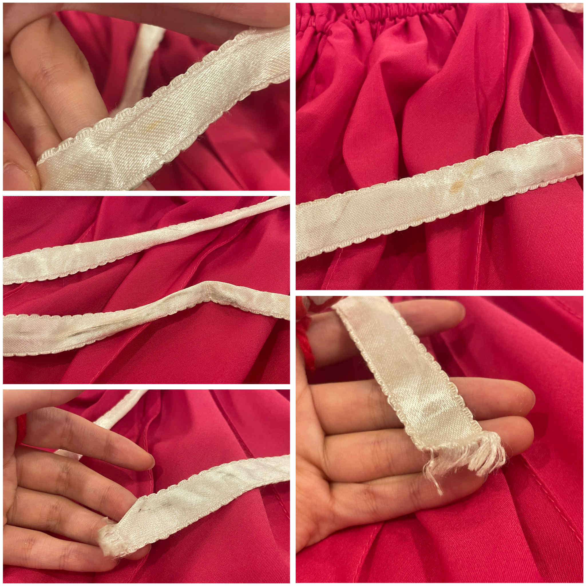 いくつか汚れやシミ汚れ、刺繡部分とリボンの毛羽立ちや糸のホツレがございますが、古着の味として着て頂けるかと思います。
