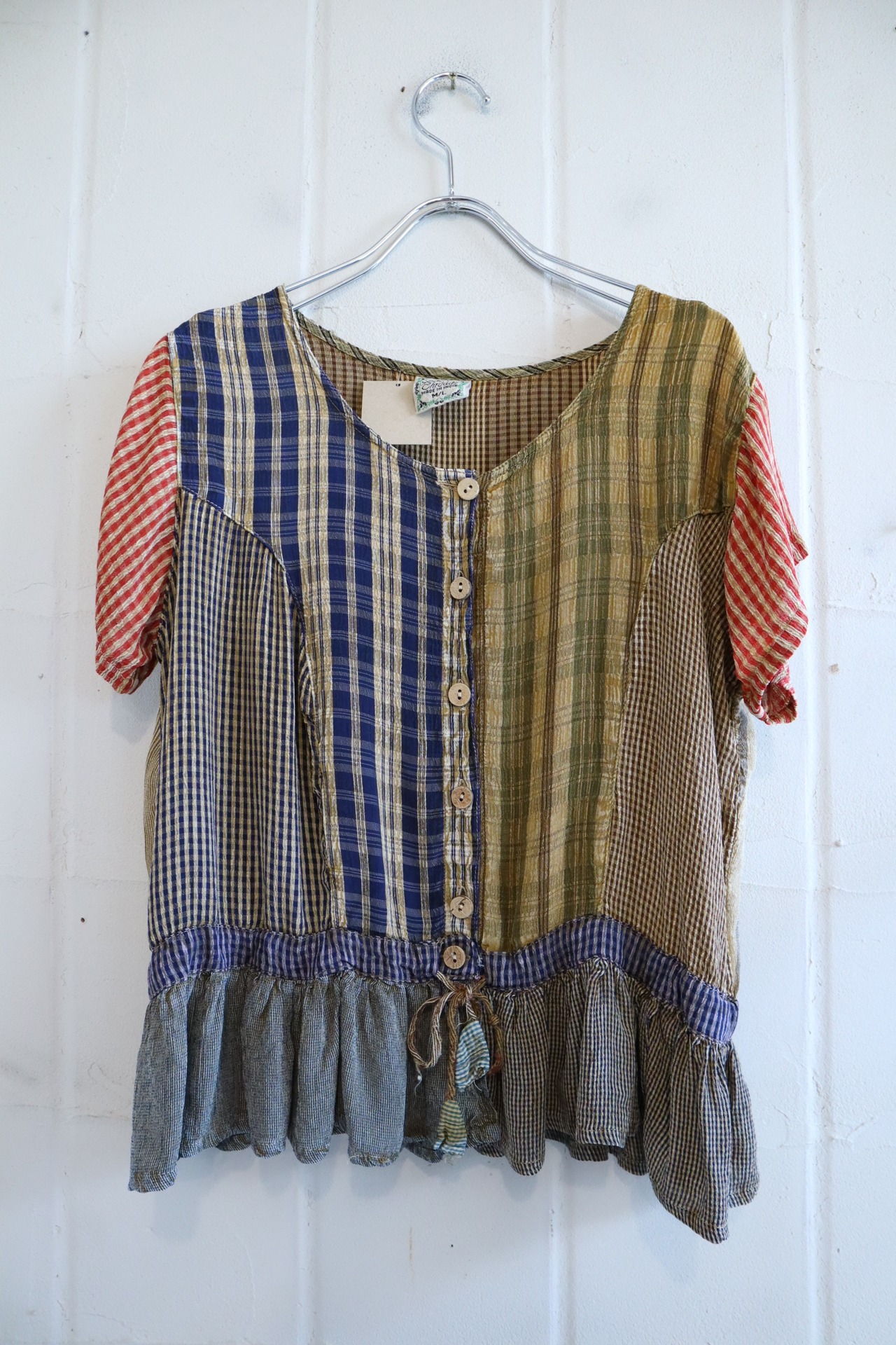 カラーリングの可愛いパッチワークが魅力的なインドレーヨントップス。