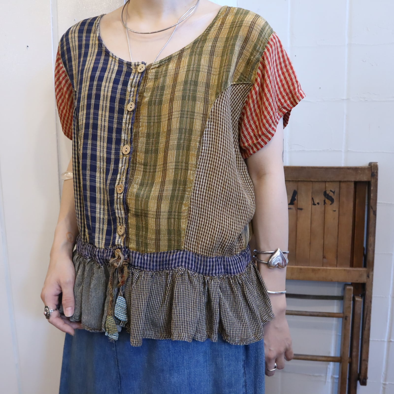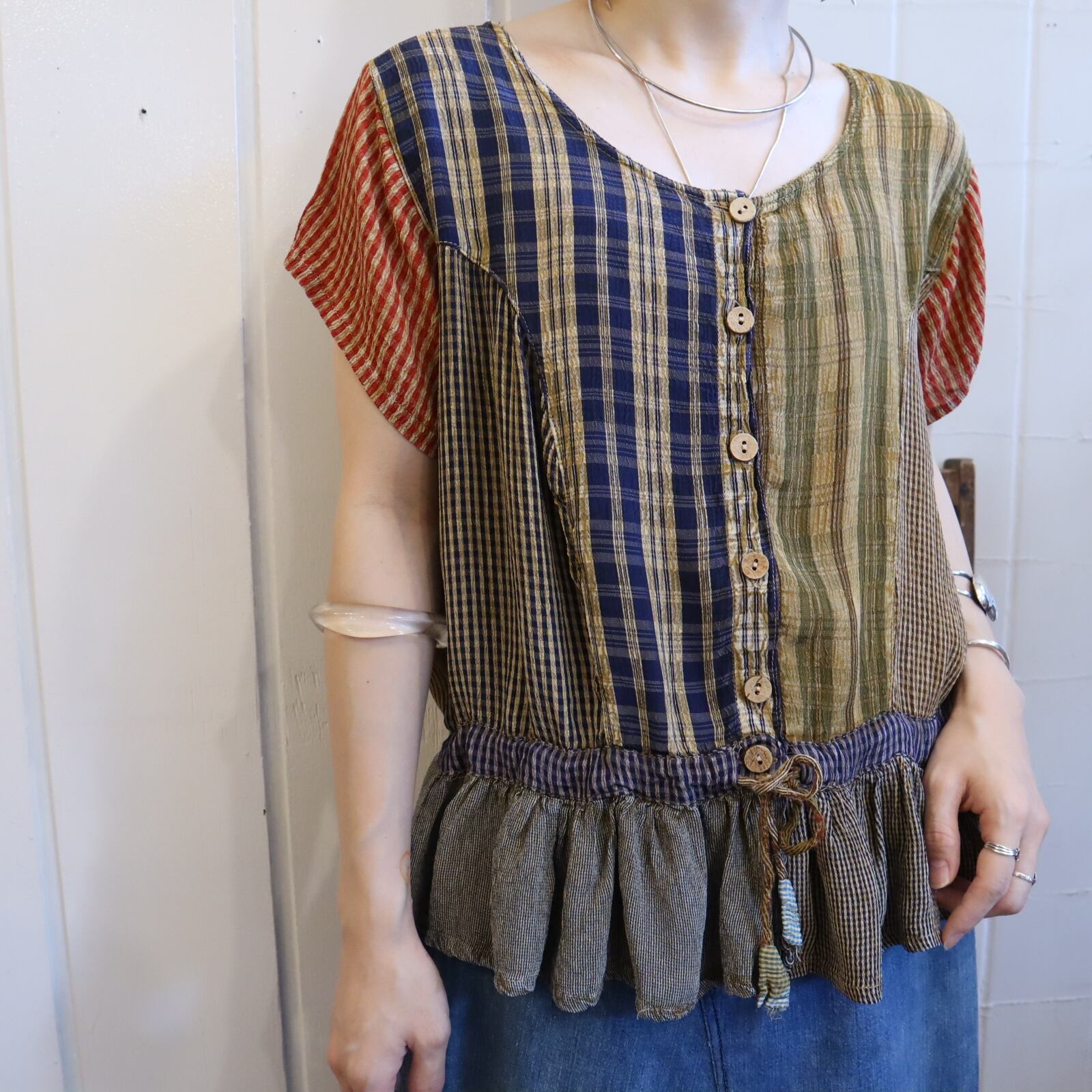 blue×yellow plaid patchwork Indian rayon tops [l-3805]