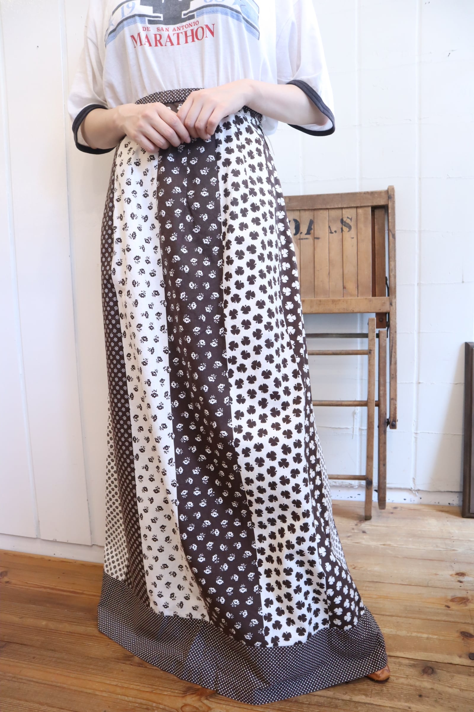 euro 70s white×brown flower&clover pattern long skirt [l-3820]