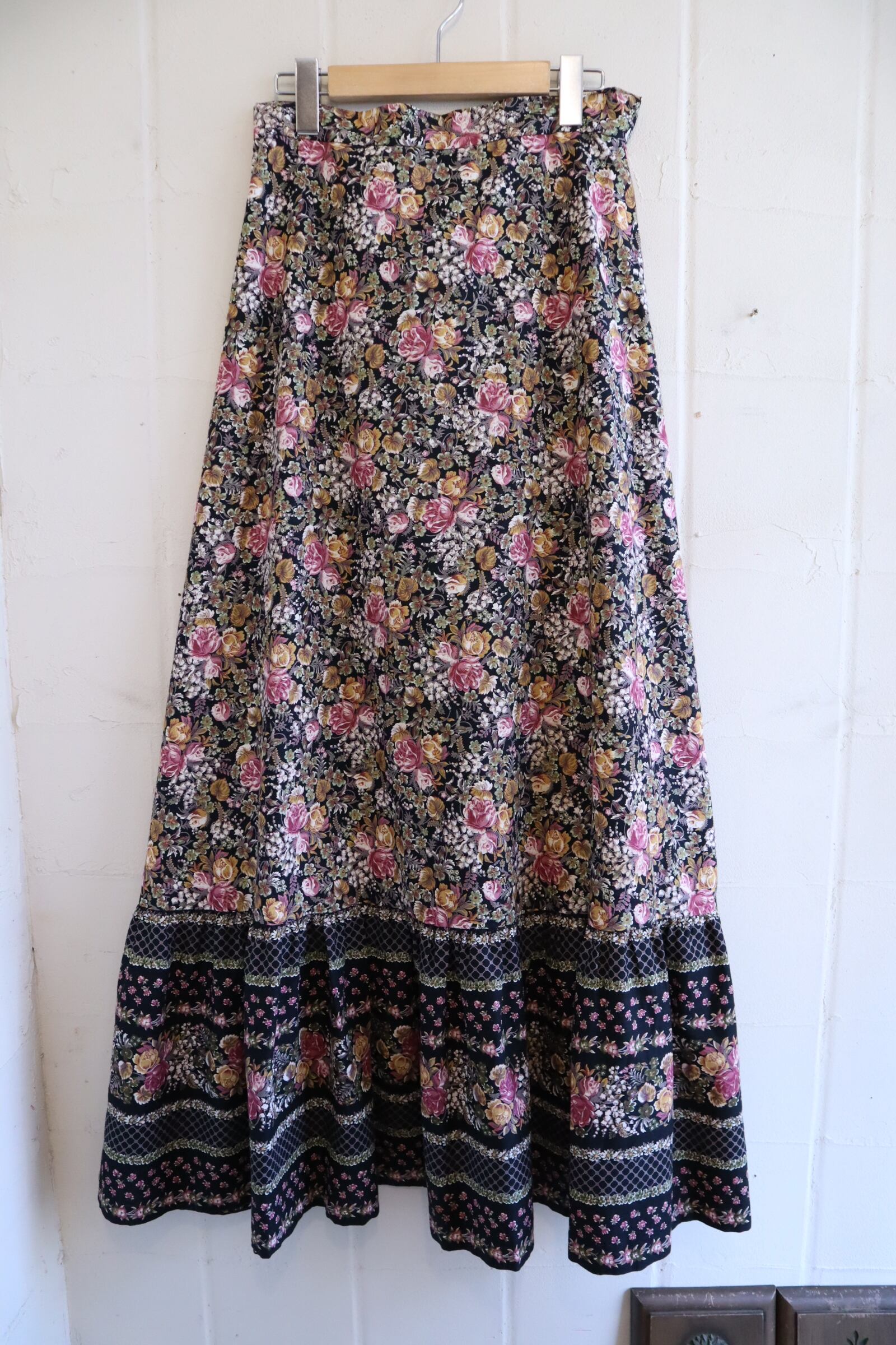 euro 70s black×beige×darkpink flower pattern long skirt [l-3821]
