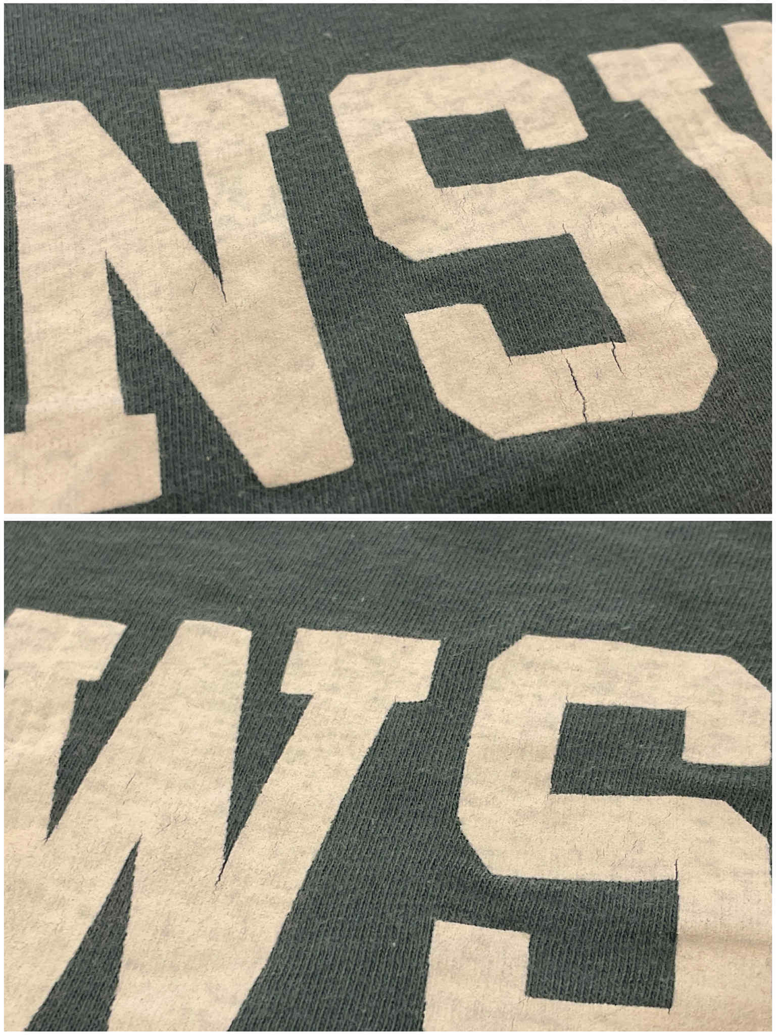いくつかプリントのひび割れ、小穴、生地の色褪せが見受けられますが、古着の味として着て頂けるかと思います。
