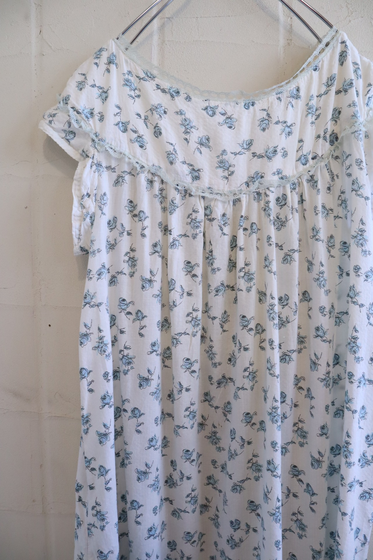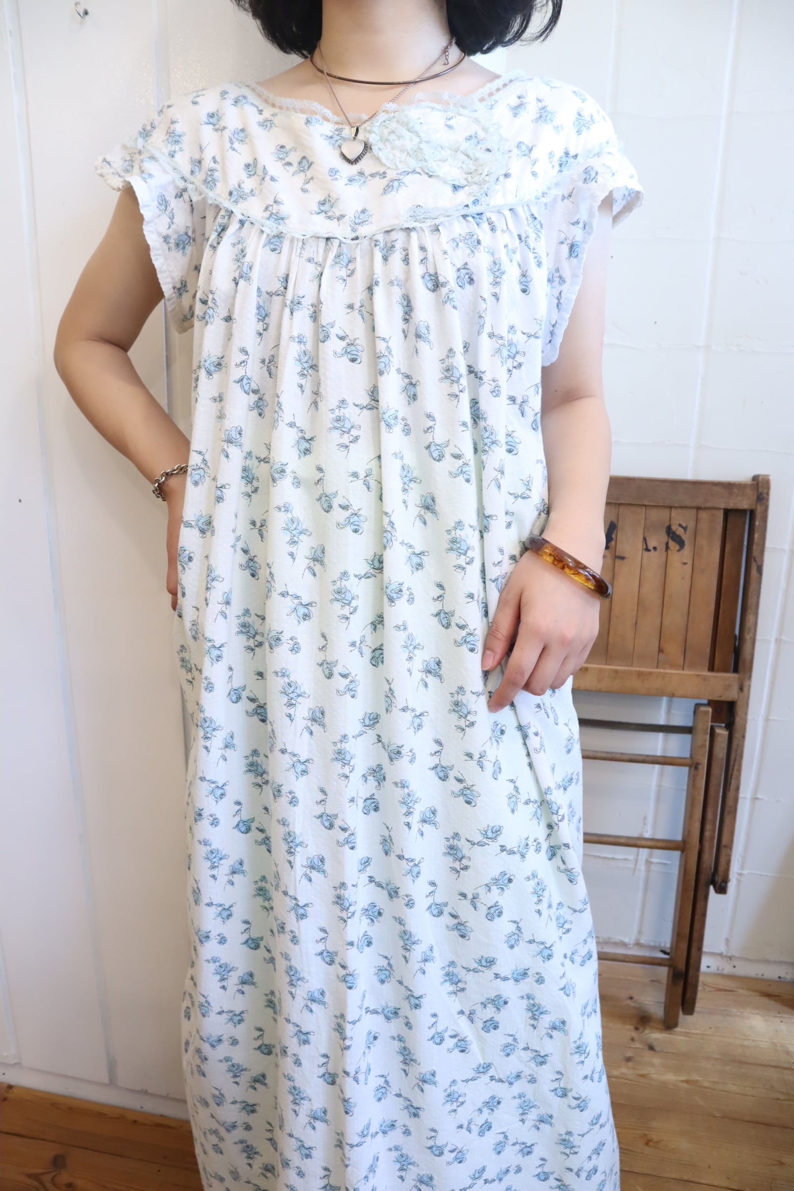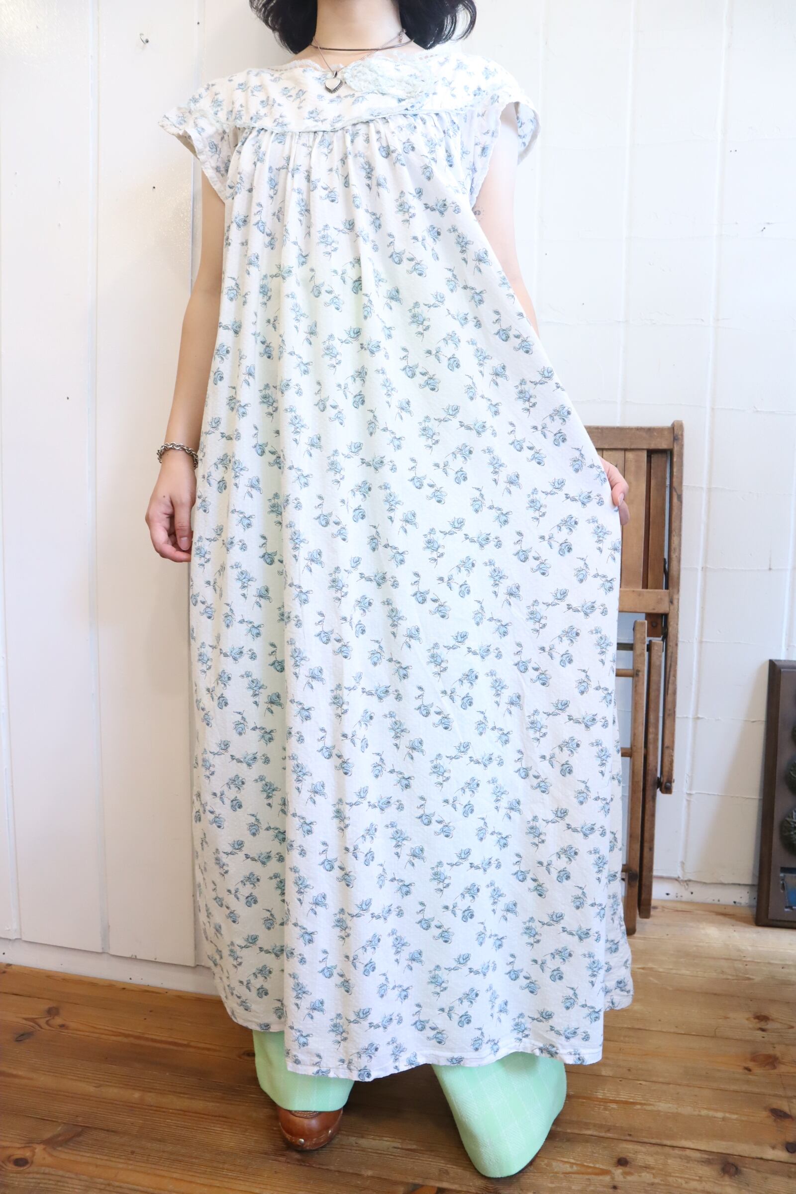 60s white×blue flower pattern long dress [l-3846]