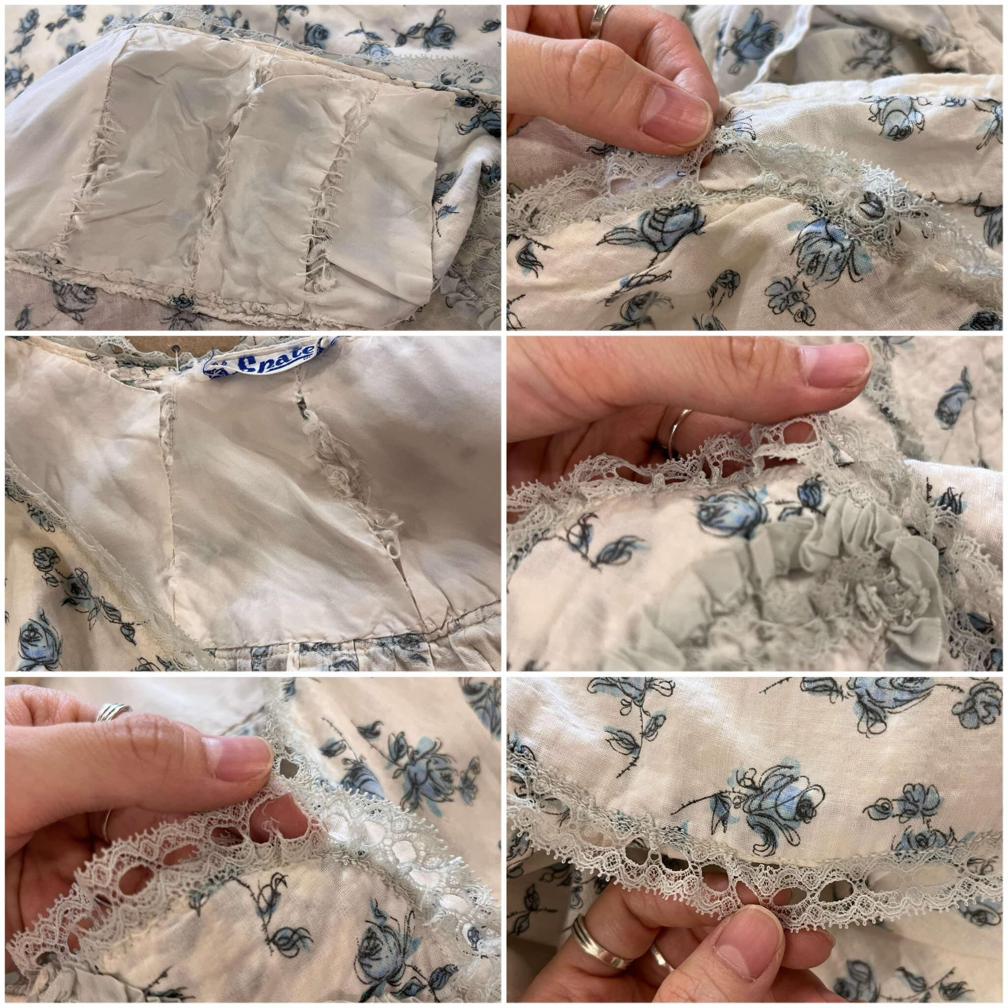 胸元の裏地にホツレやリペア跡、レースに小さな破れやホツレが見受けられます。
