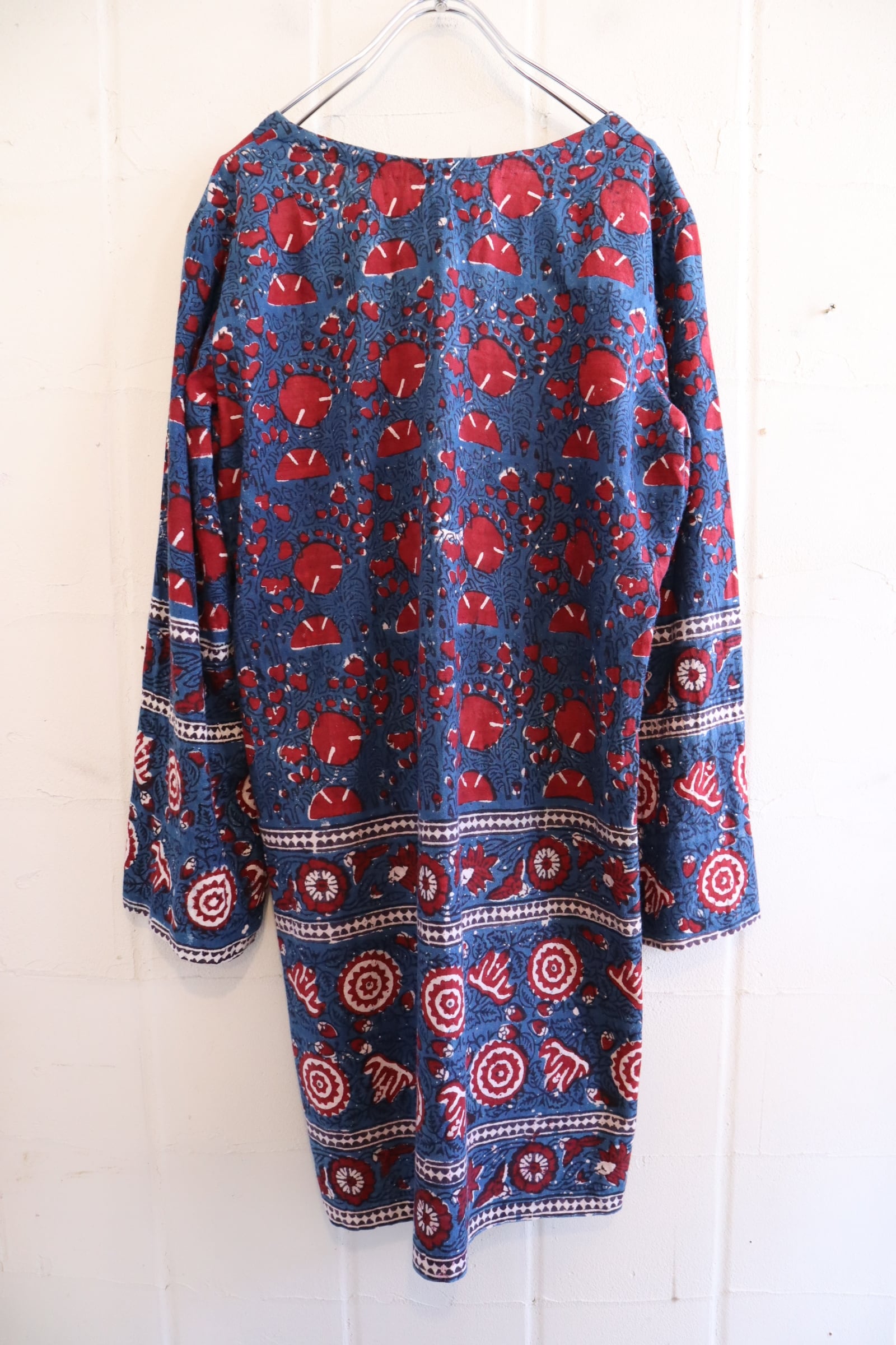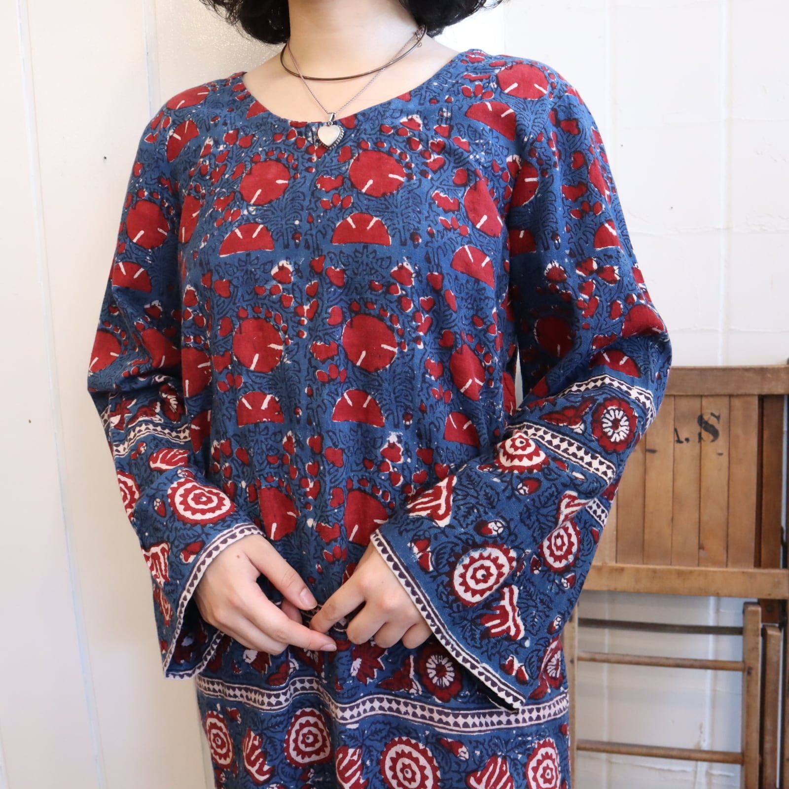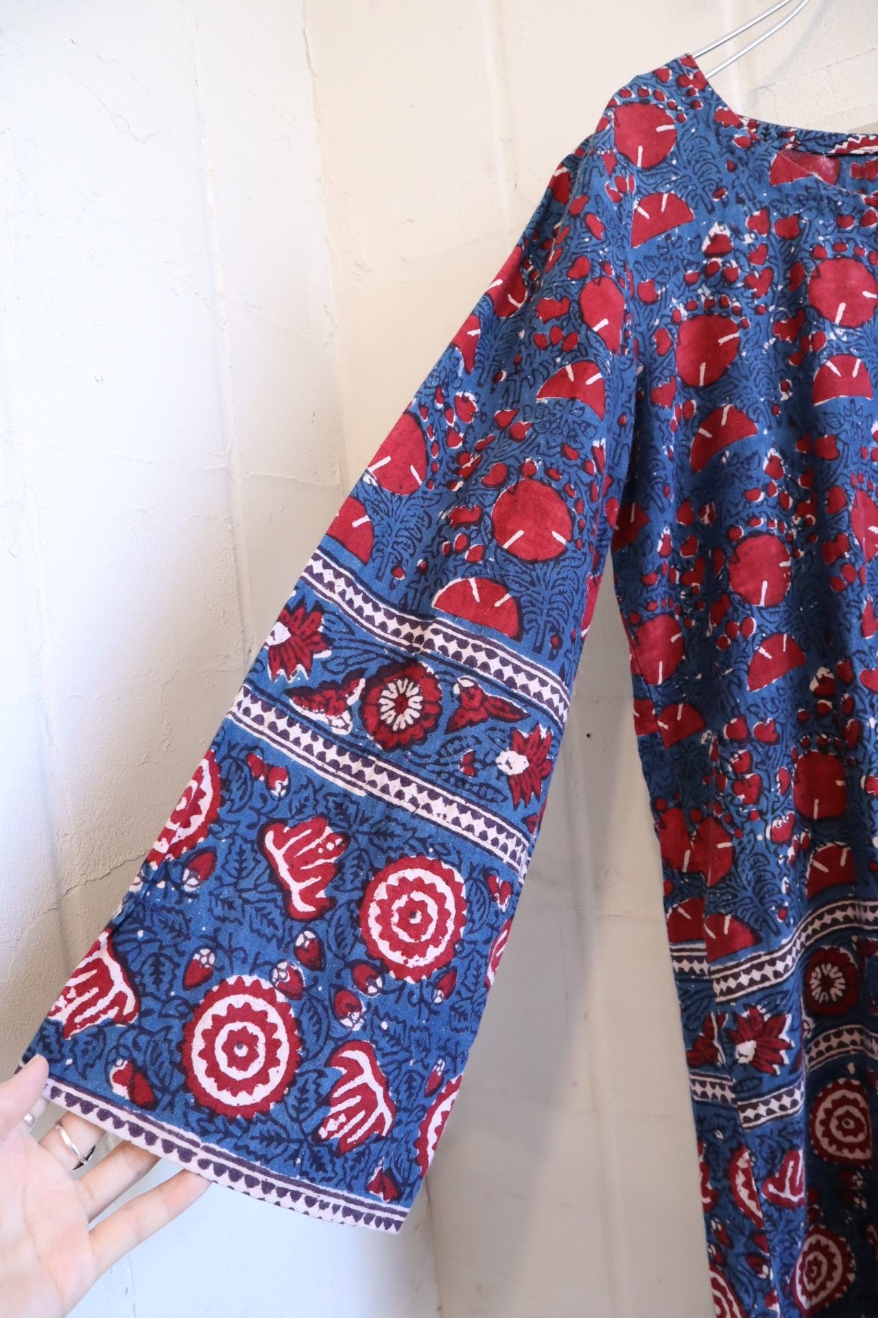 少し広がったお袖や渋めカラーが可愛いインドコットンドレス。