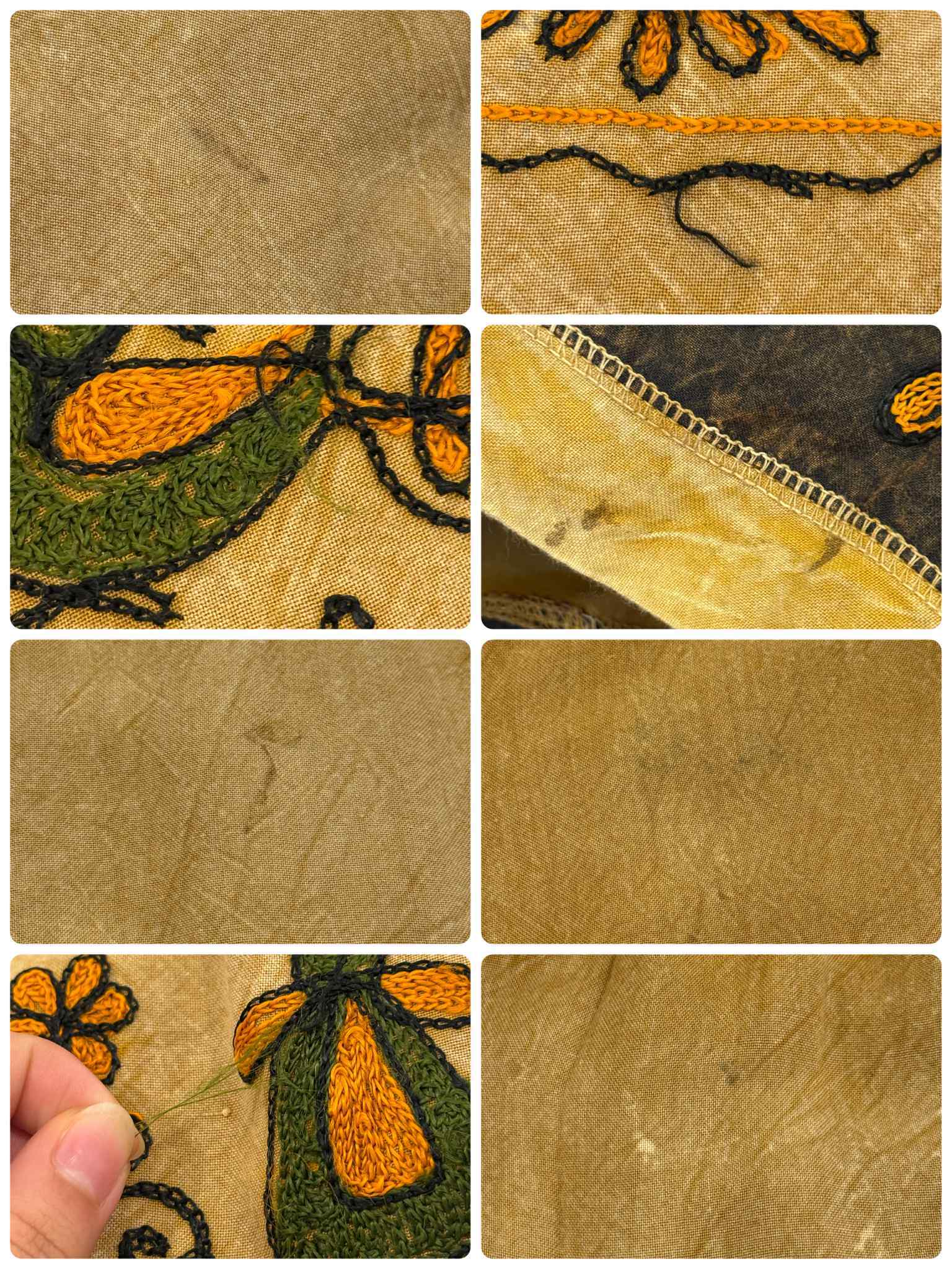 いくつか汚れ・色抜け・刺繍にホツレ、ボディに一部ツレがございますが、古着の味として着て頂けるかと思います。