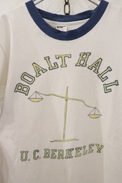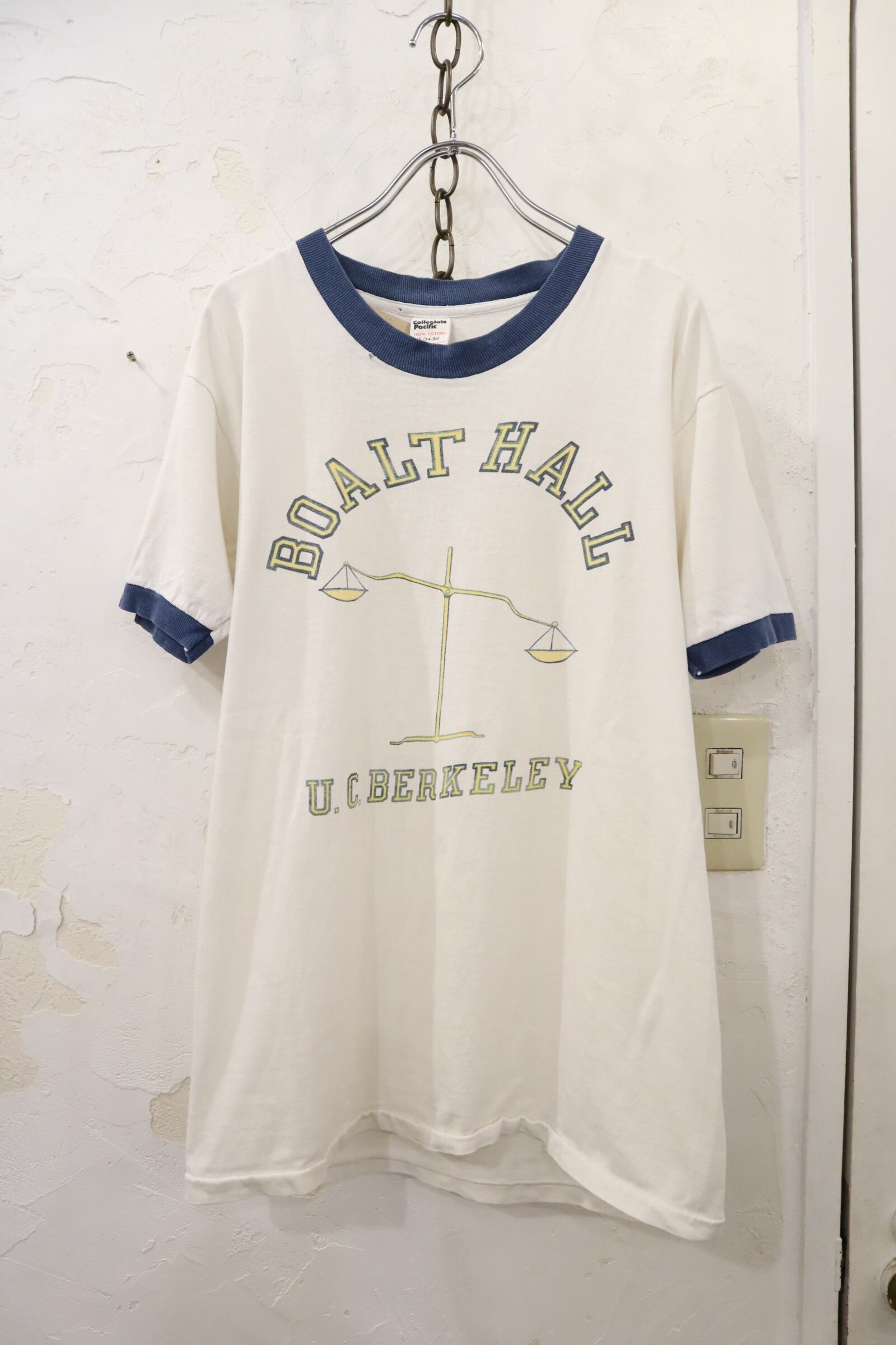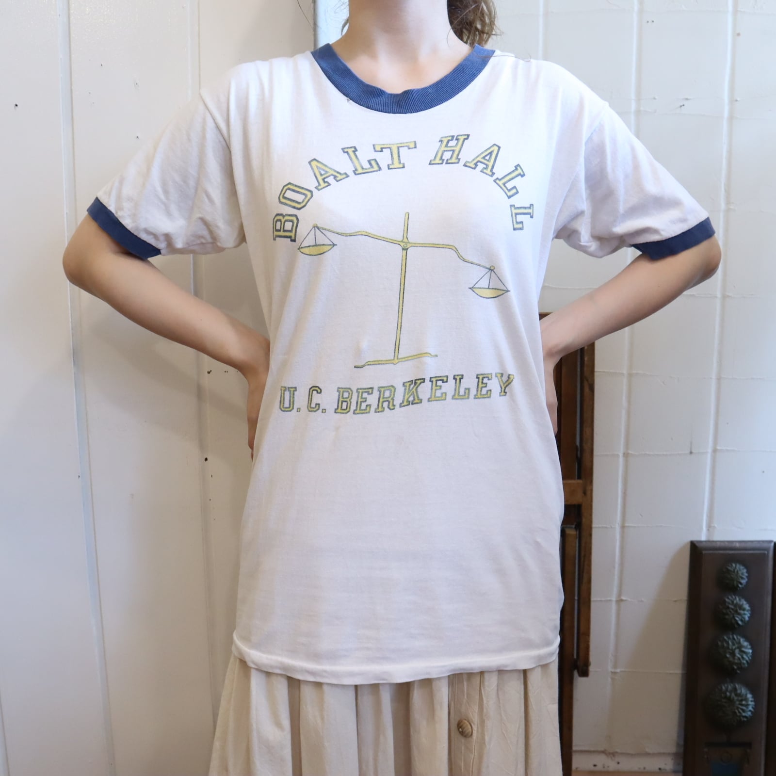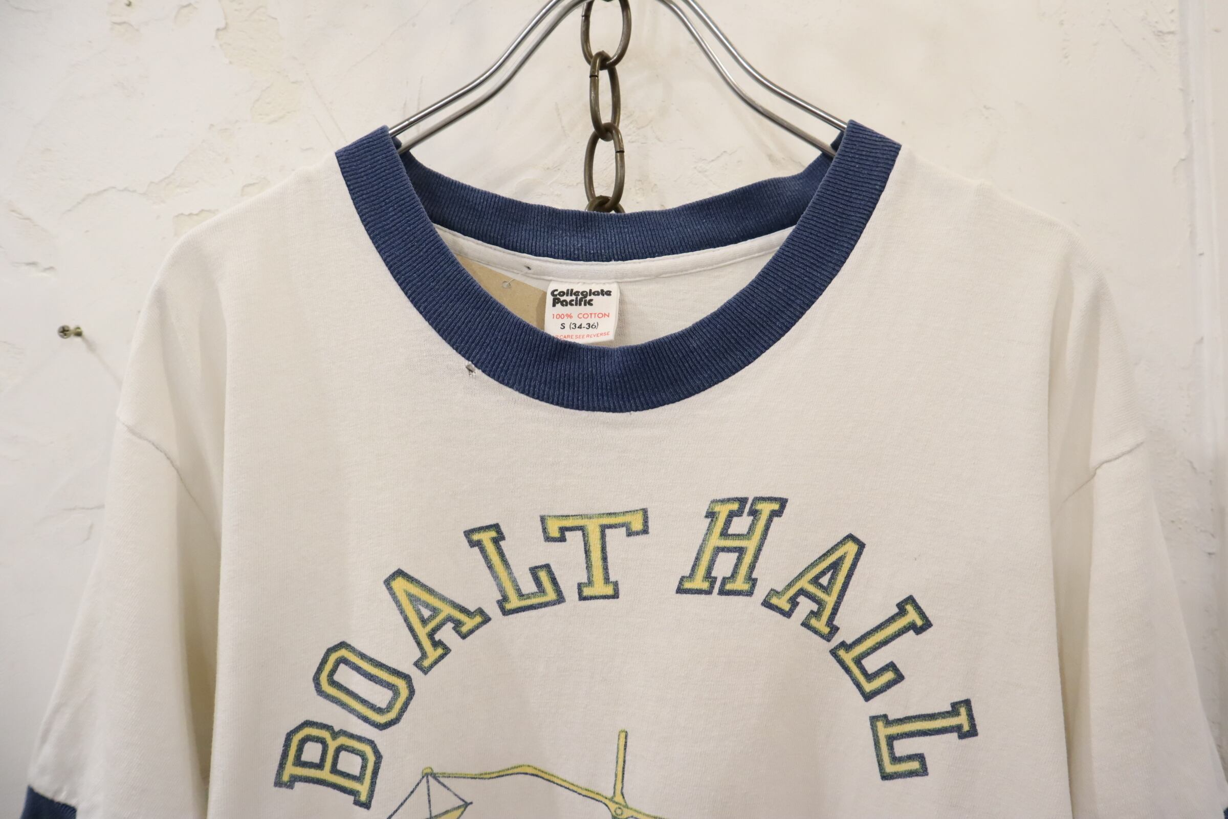 80s blue×white×yellow print ringer T-shirt [l-3876]