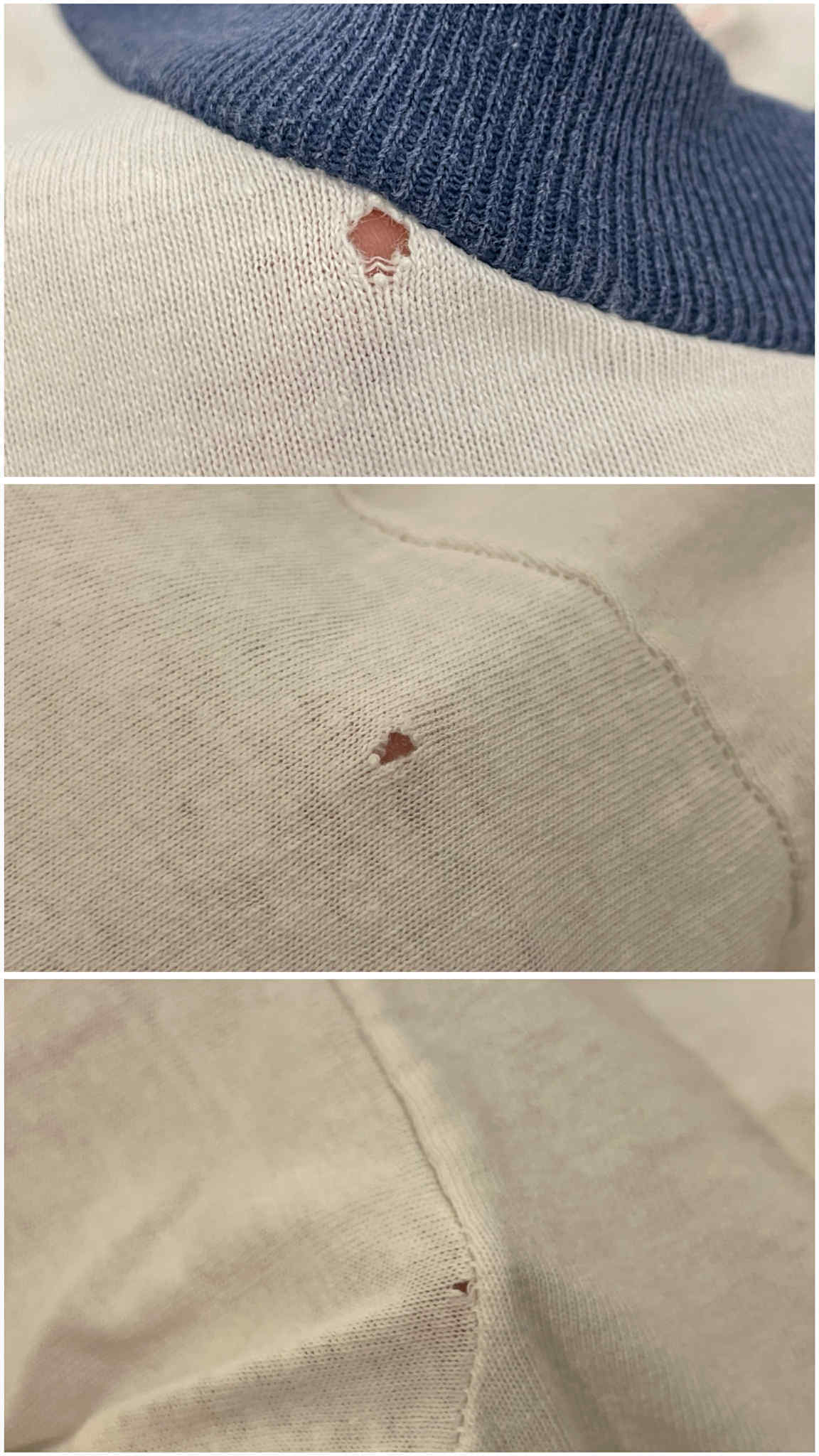 いくつか汚れやシミ汚れ、リブ色褪せ、小穴が見受けられますが、古着の味として着て頂けるかと思います。