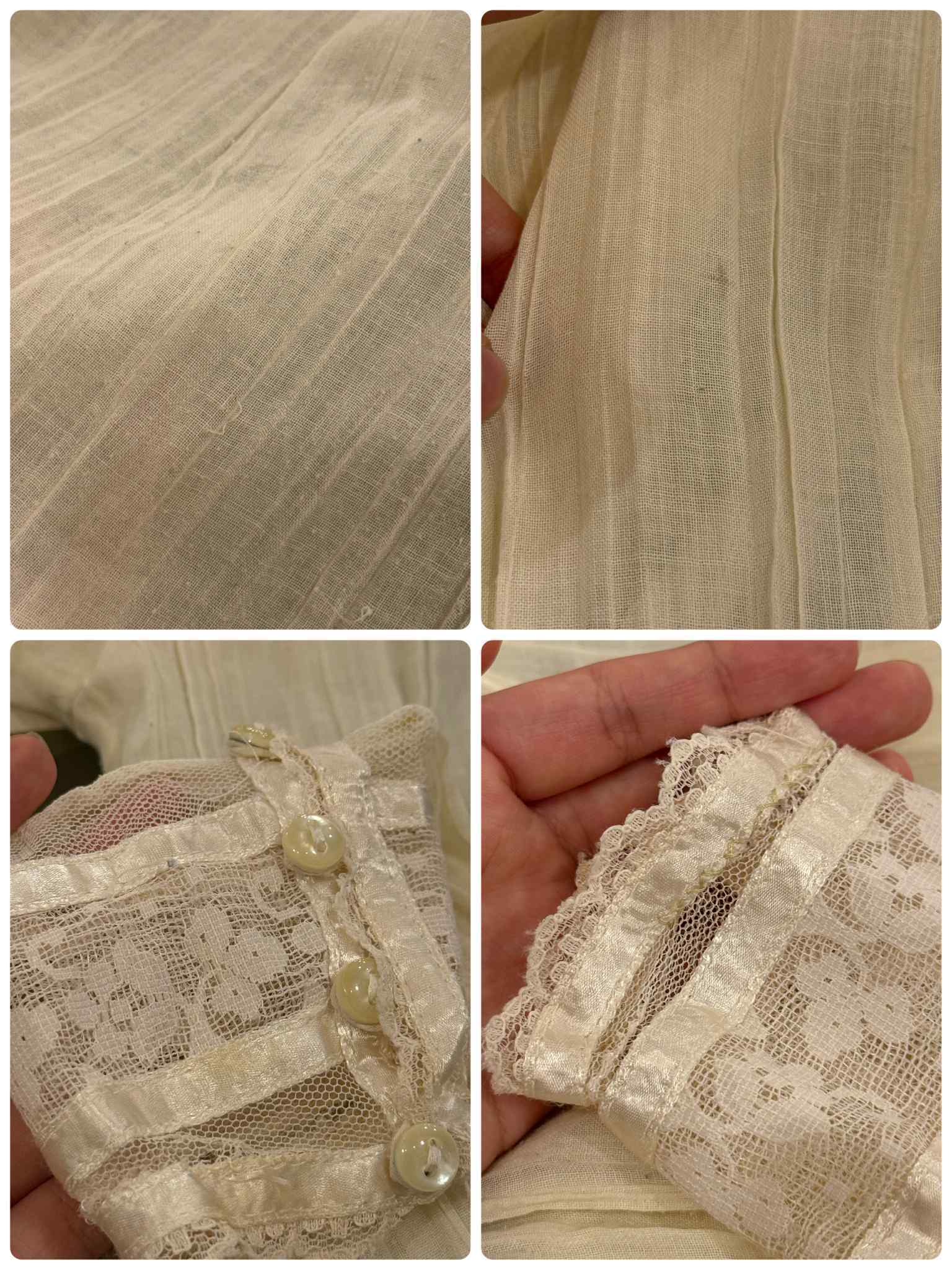 いくつか薄汚れや若干のシミ汚れ、袖口レースにリペア跡や破れ、全体的に生地の毛羽立ちが見受けられますが、古着の味として着て頂けるかと思います。