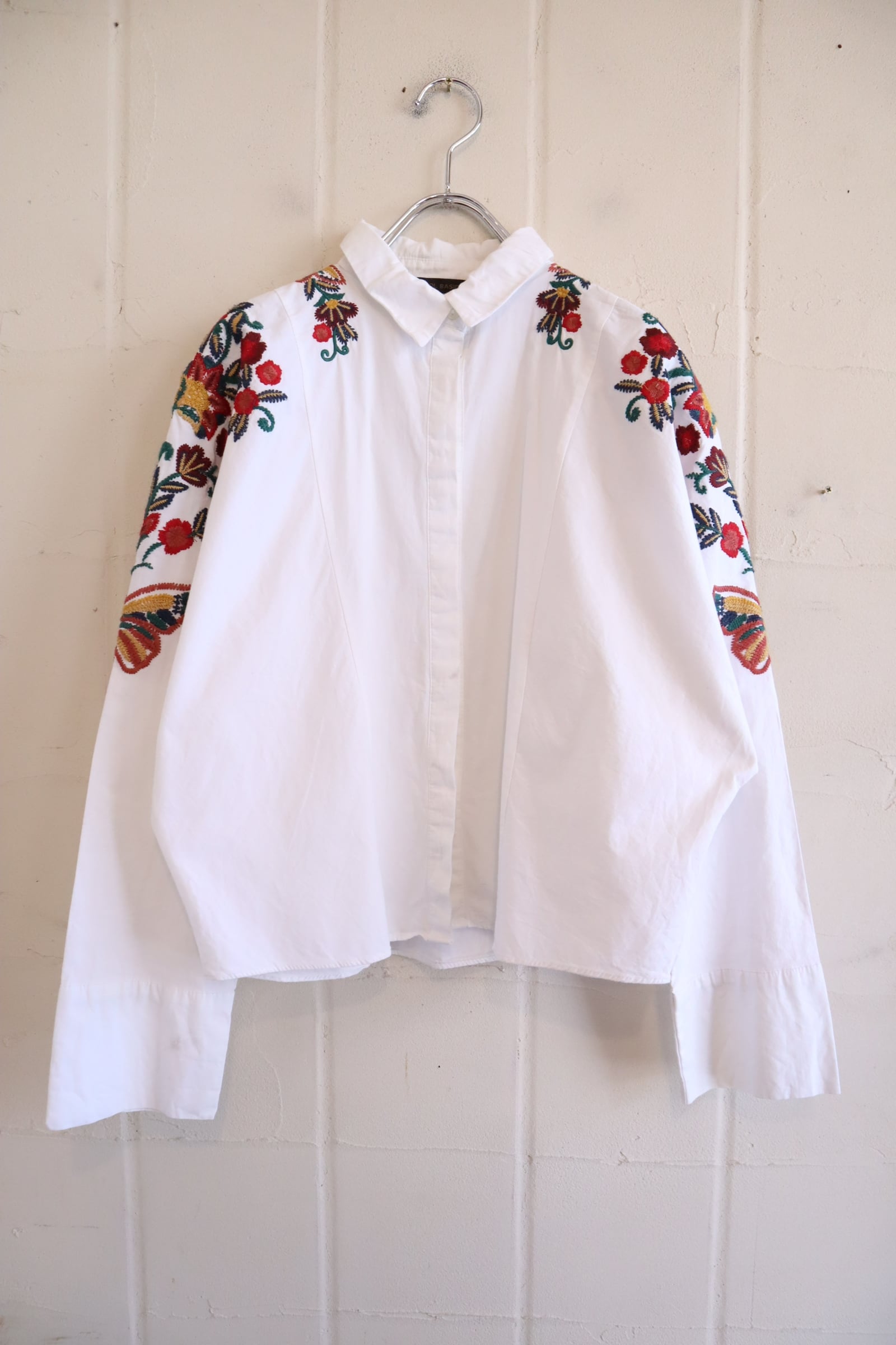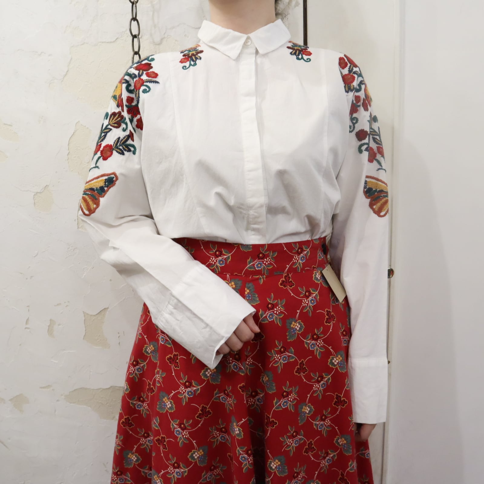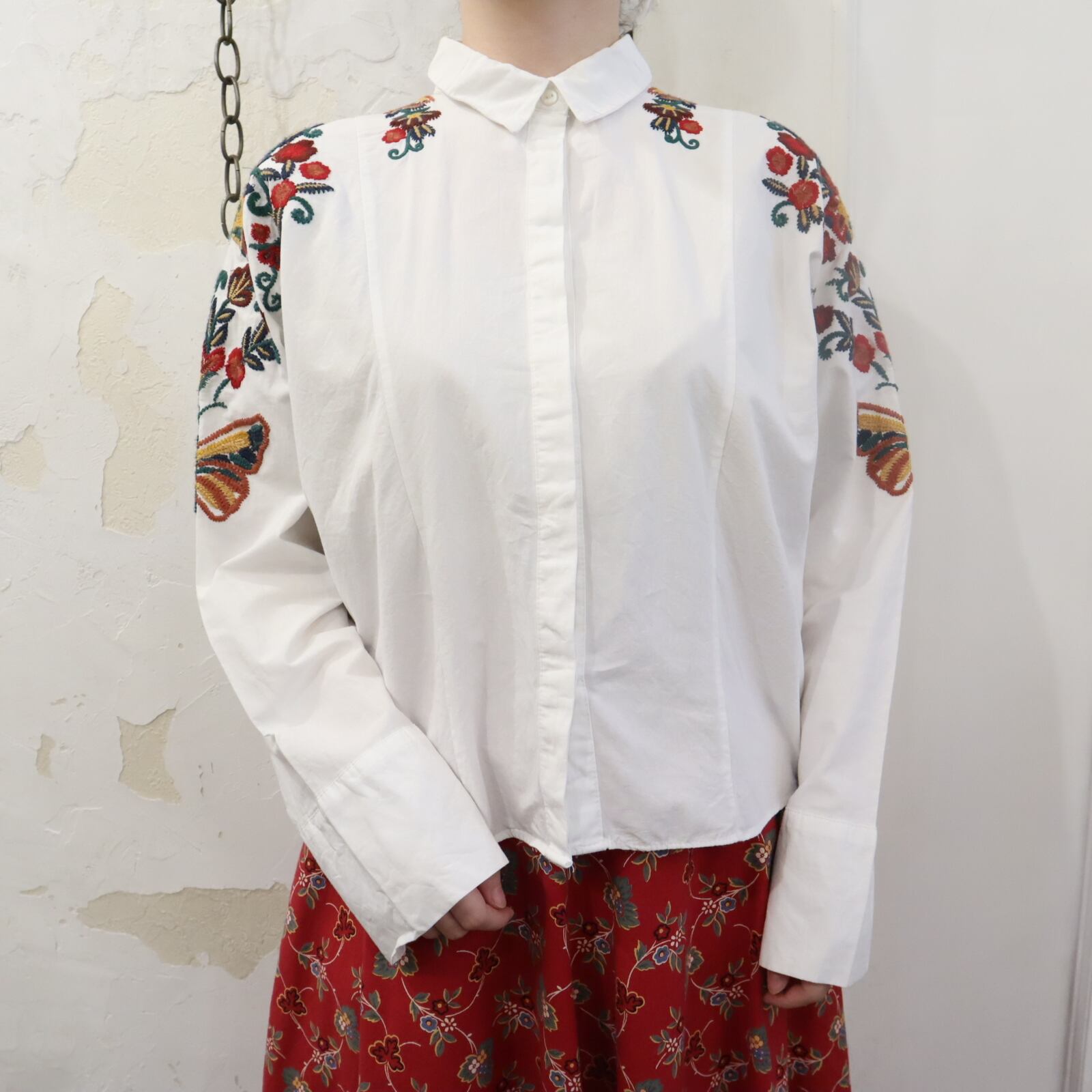 肩の色鮮やかな刺繍が素敵なブラウス。お花だけでなく、蝶々の刺繍も入っています♡