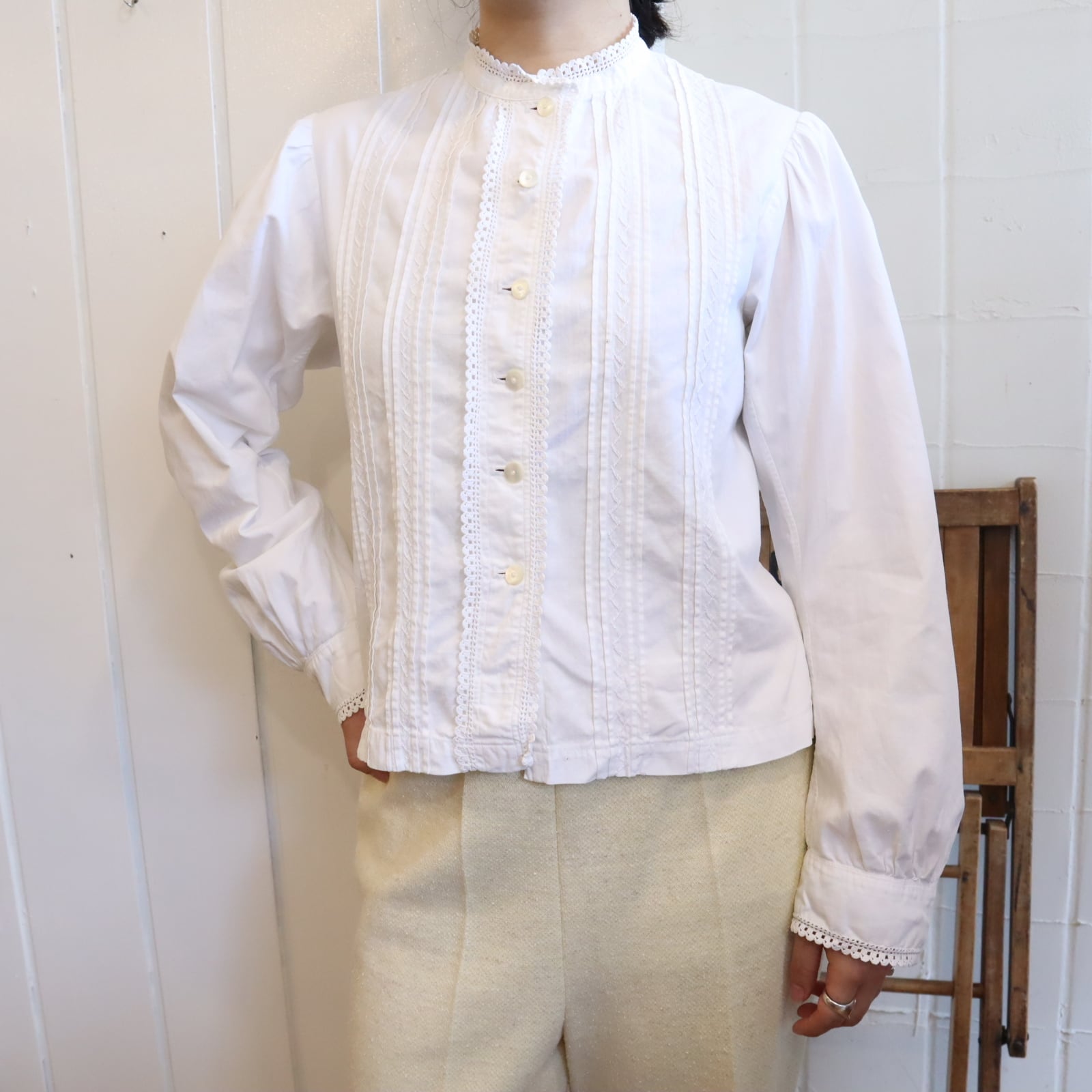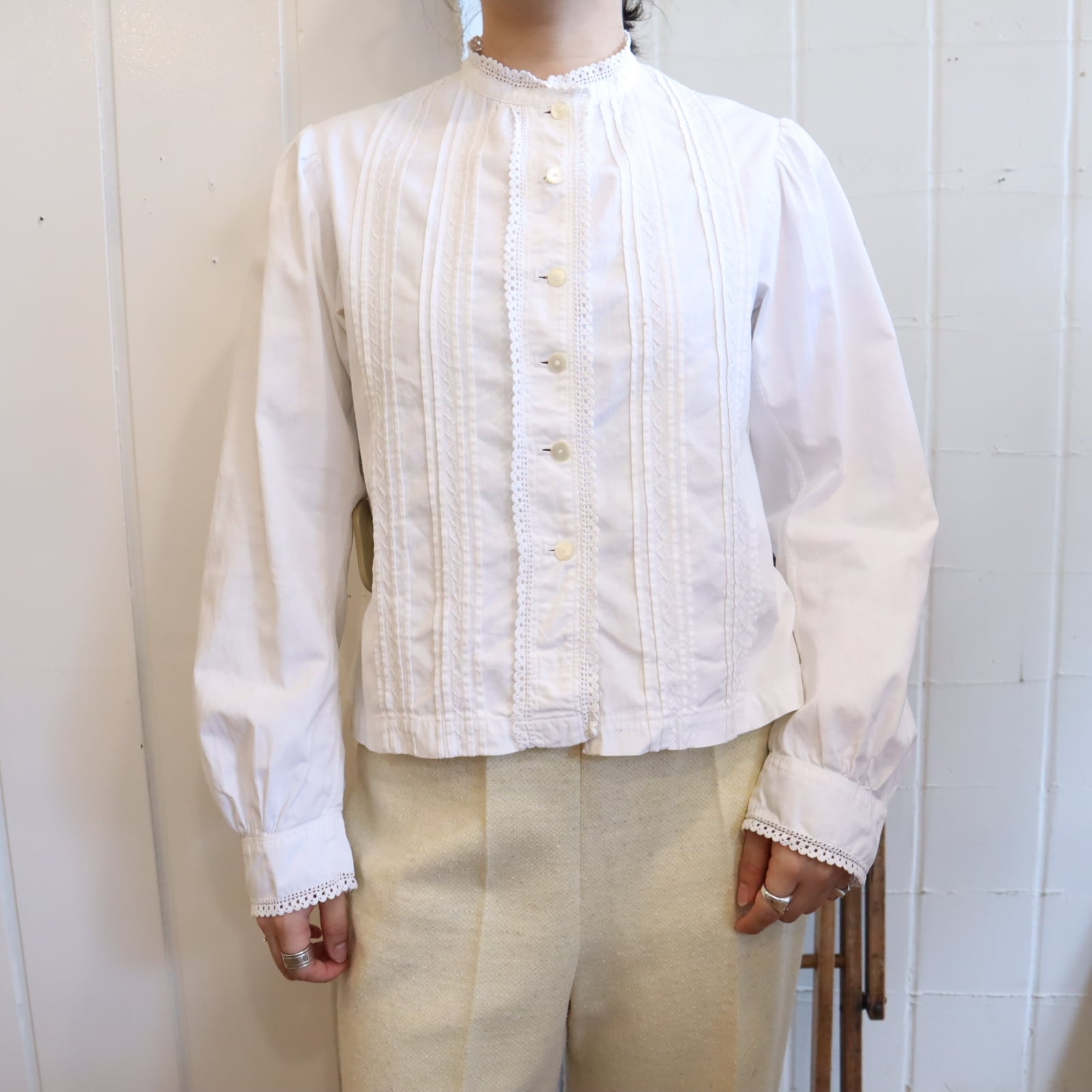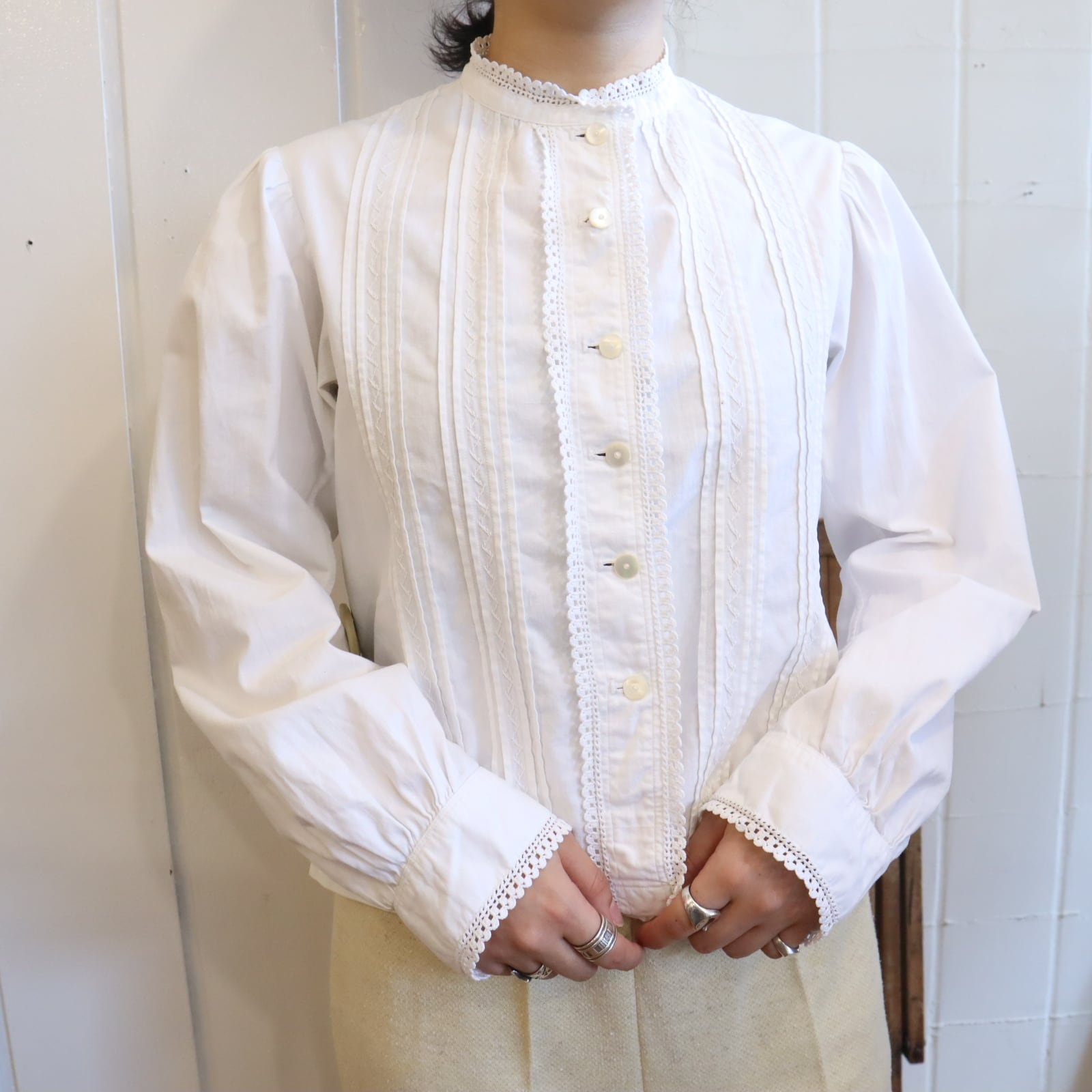 ややスタンドカラーのカチッとした雰囲気が素敵なアンティークブラウス。