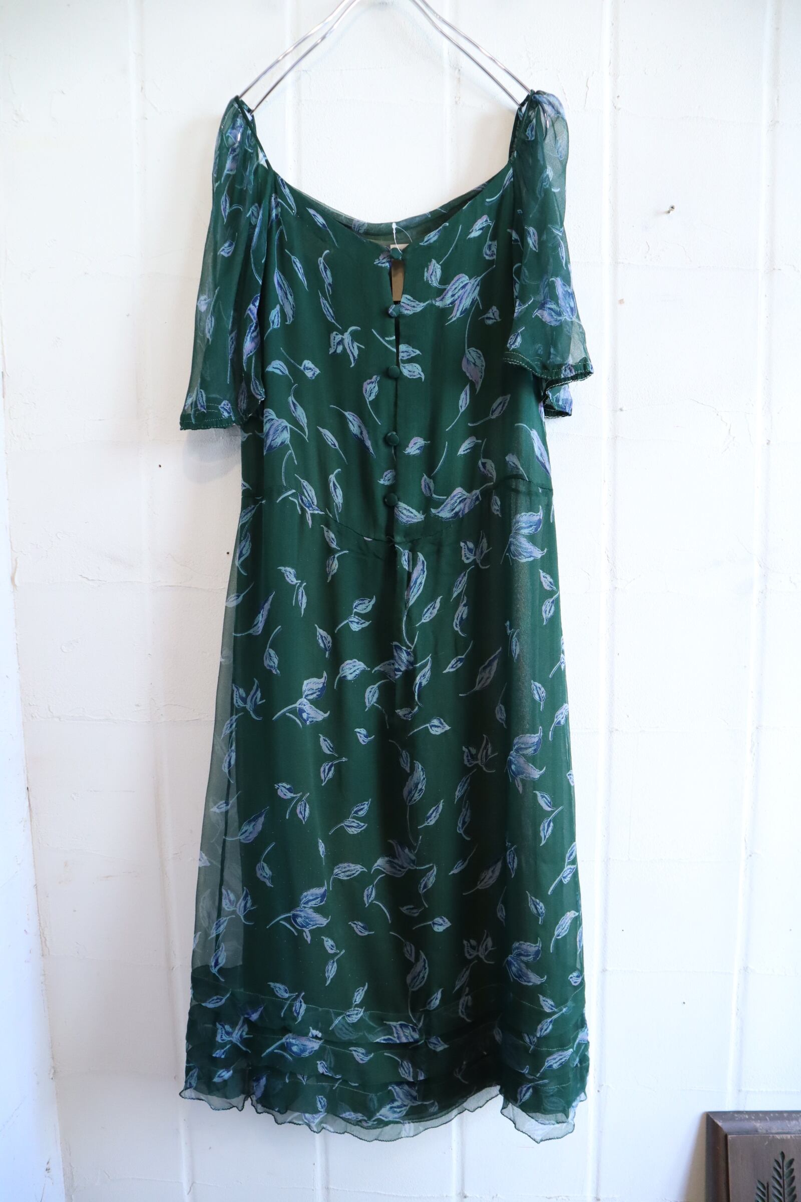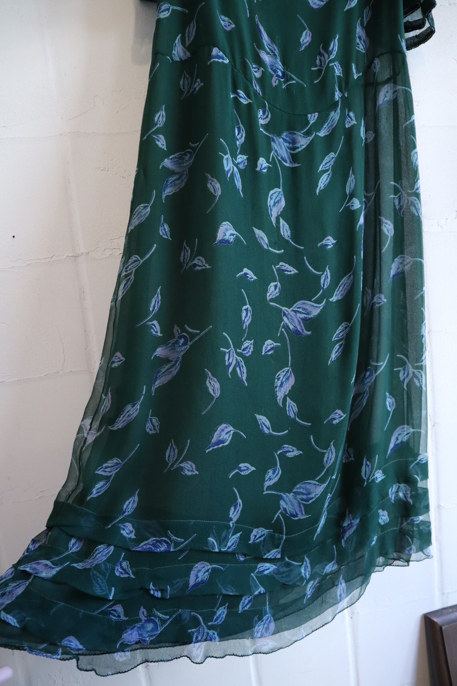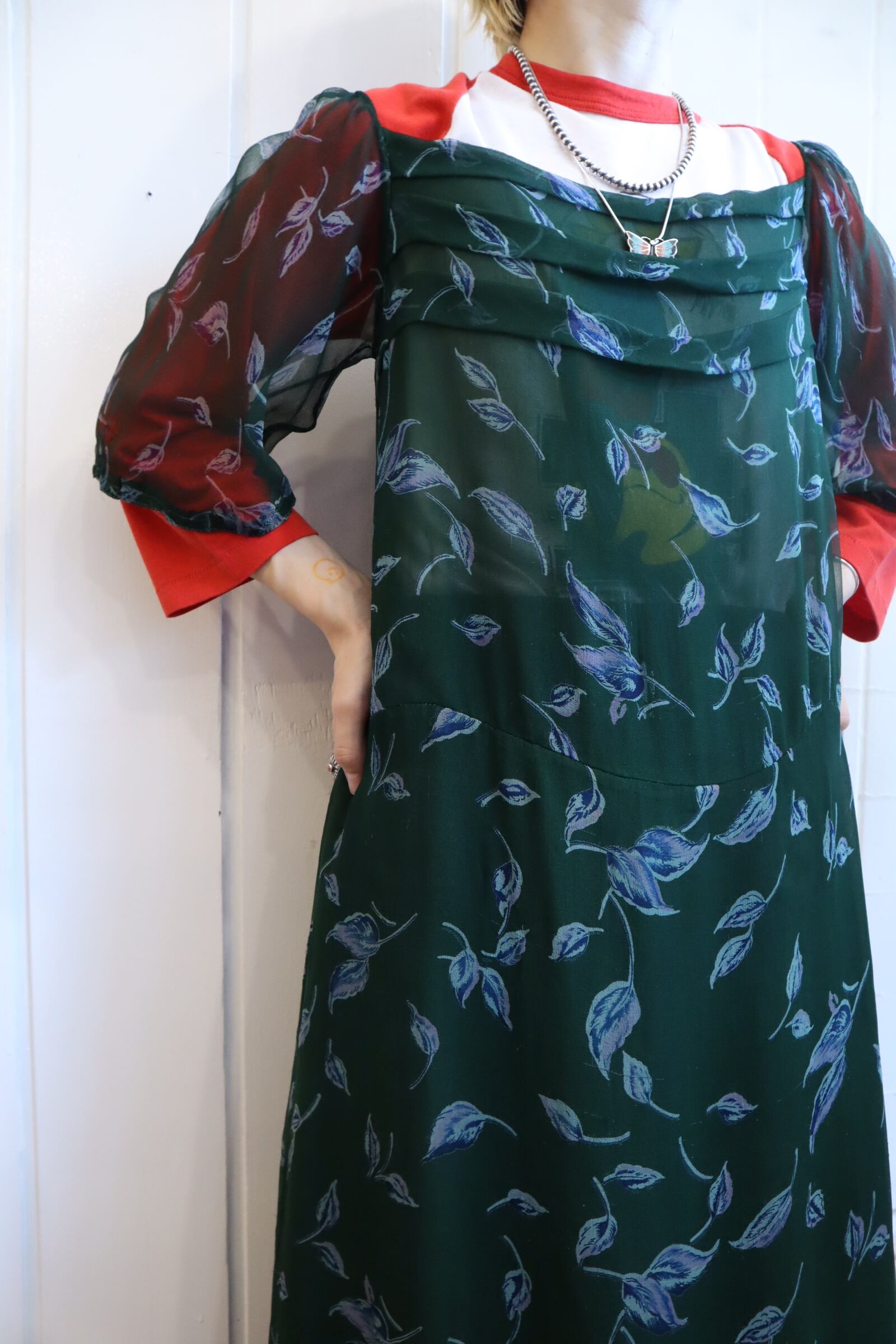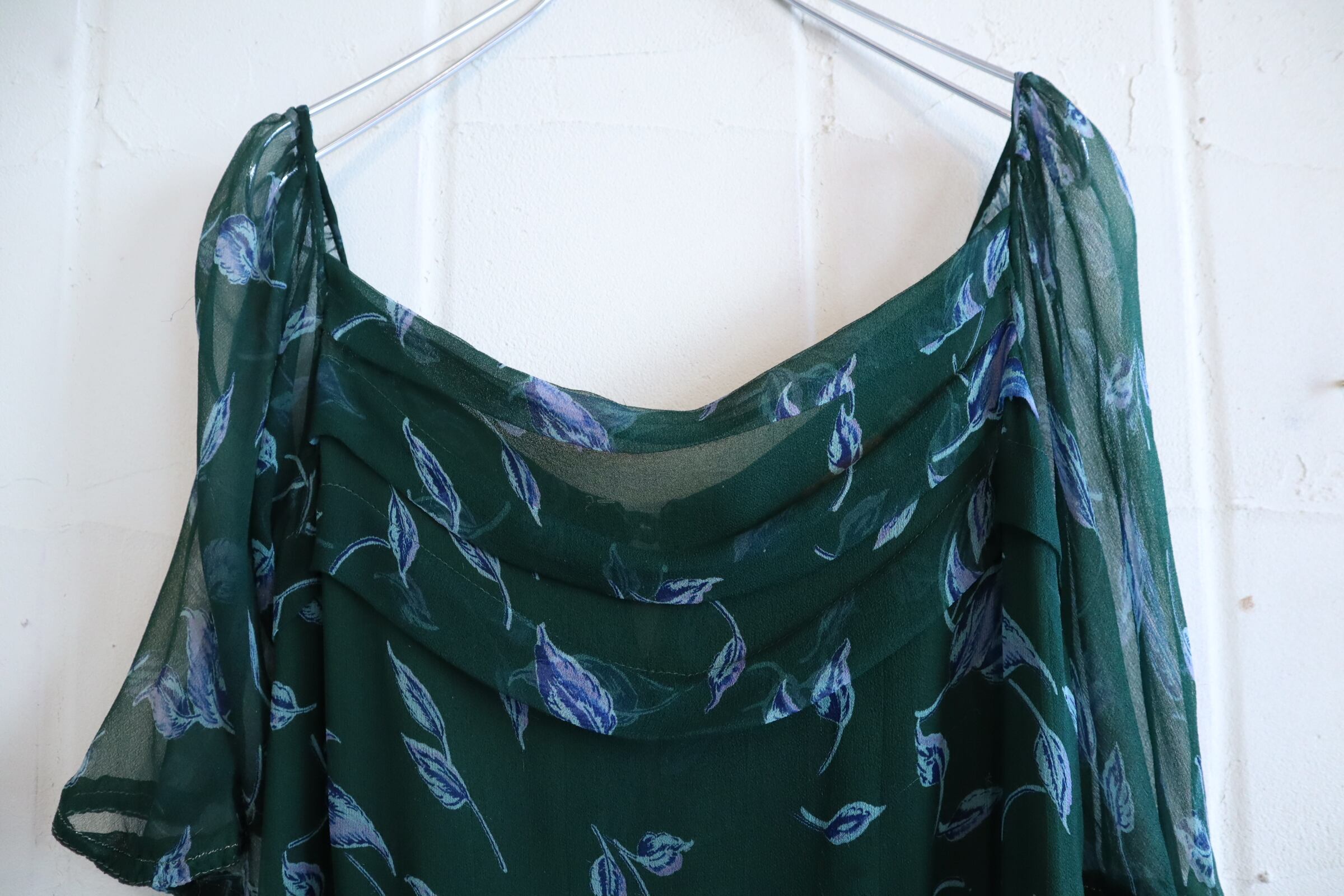 70s darkgreen×blue flower pattern see-through silk dress [l-3911]