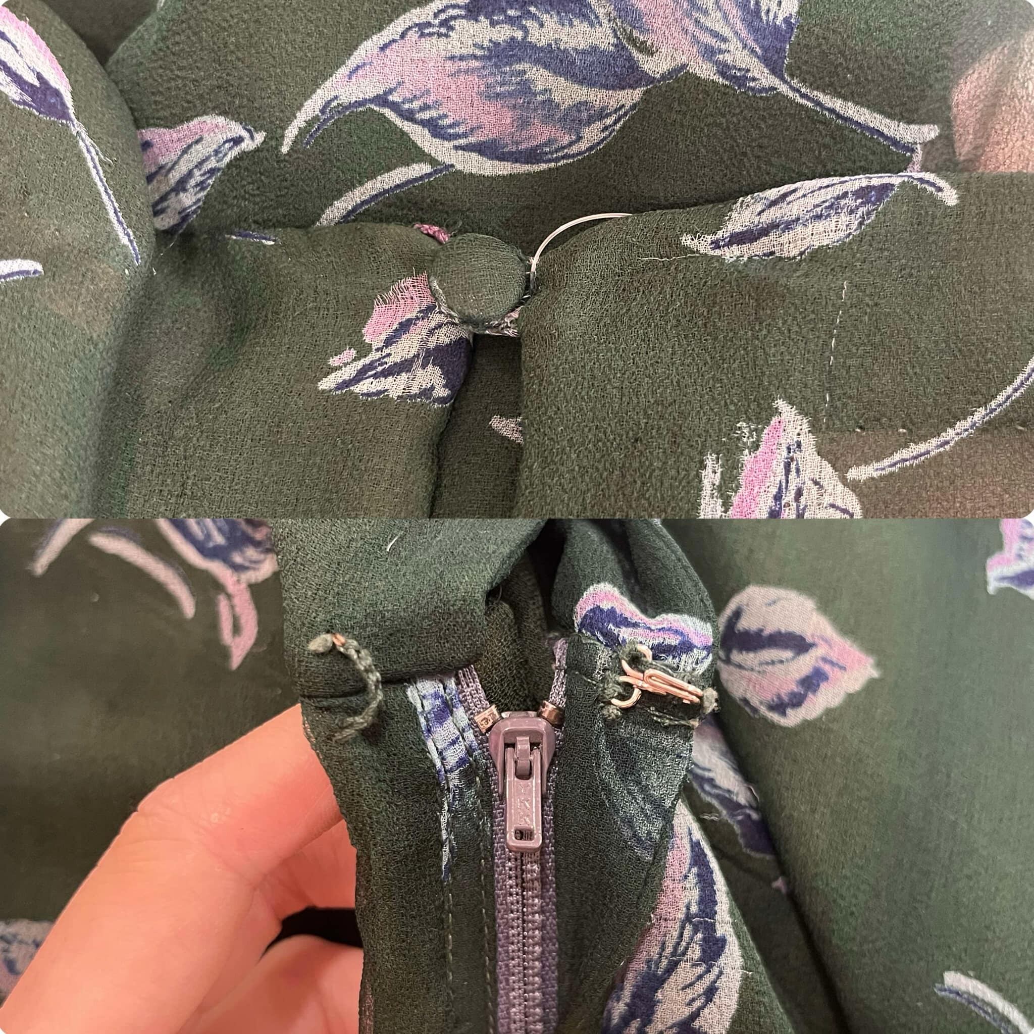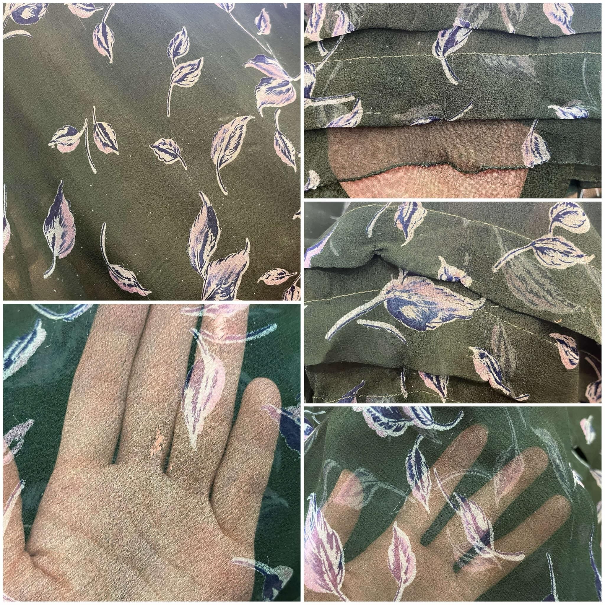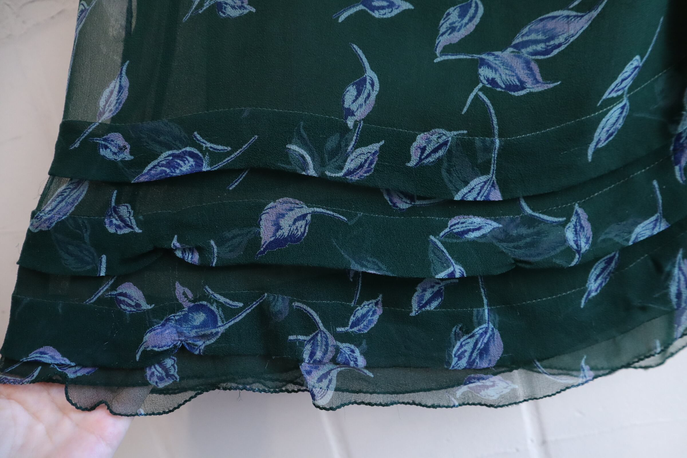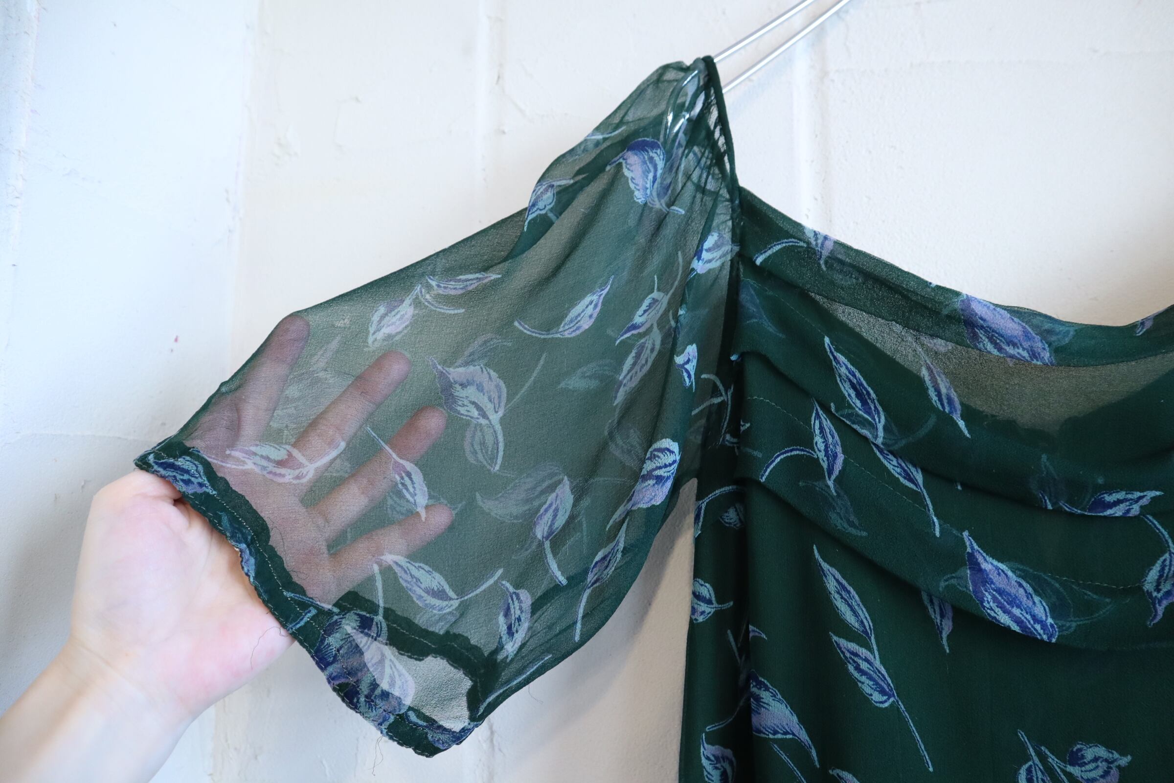 70s darkgreen×blue flower pattern see-through silk dress [l-3911]