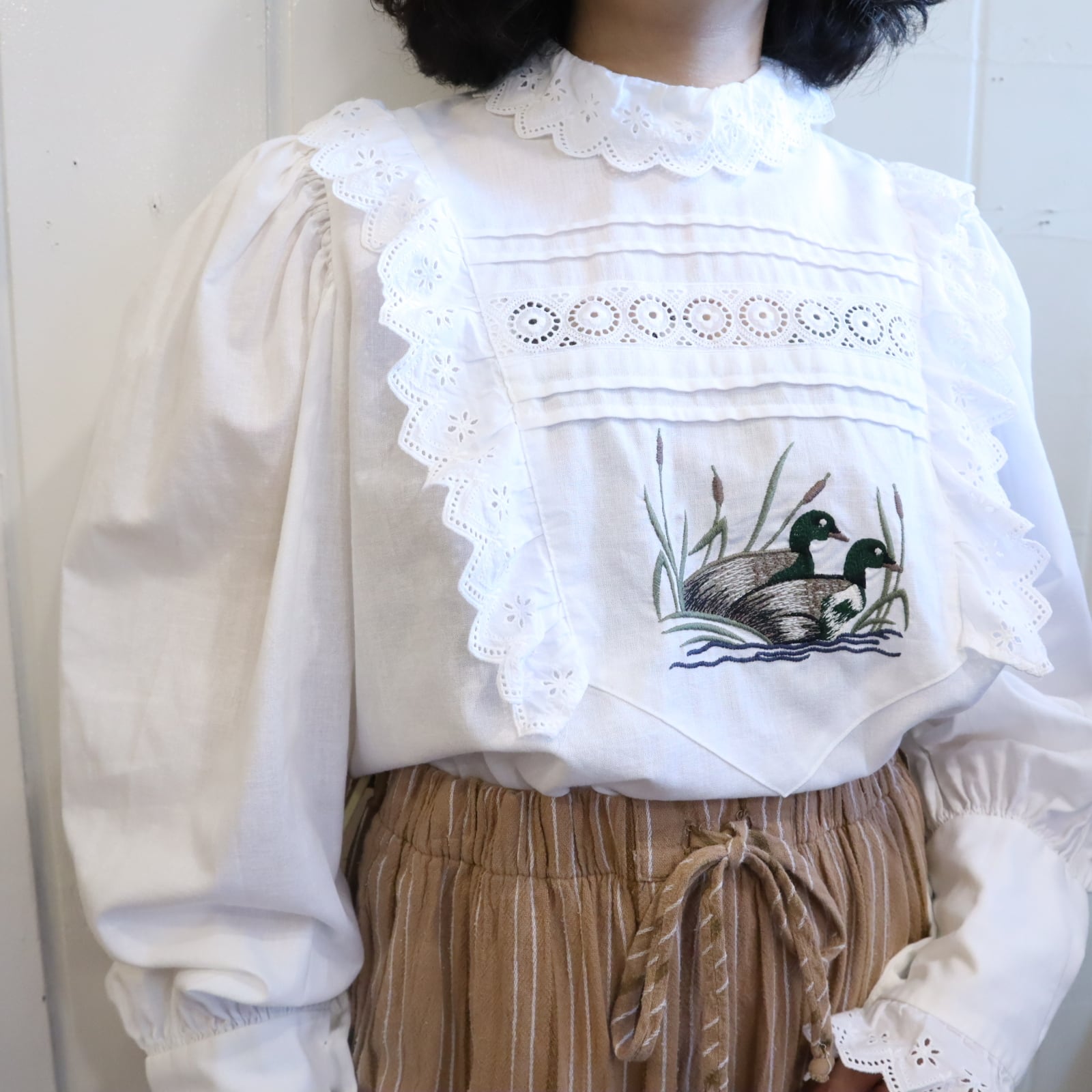 white×green duck embroidery standcollar tyrol blouse [l-3947]