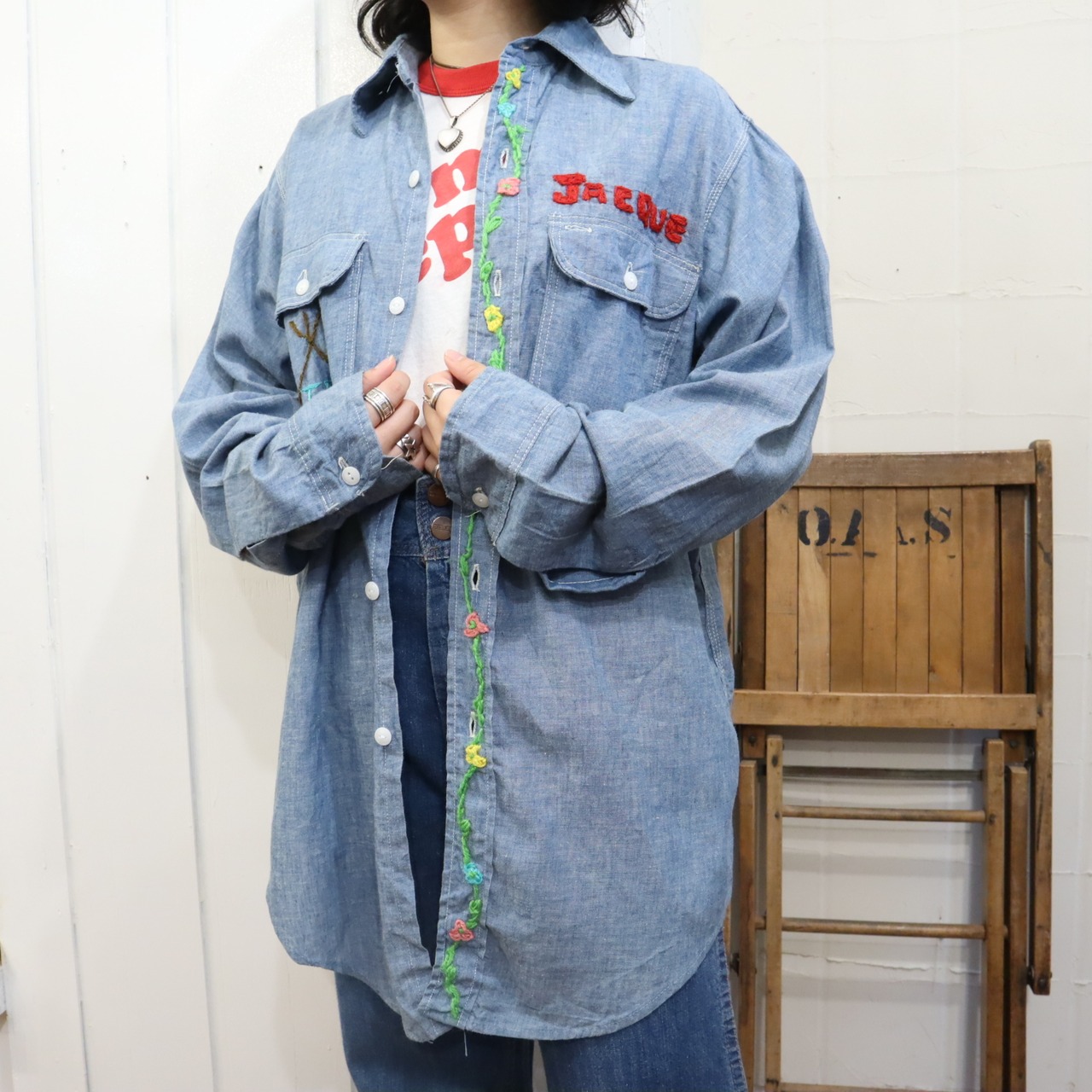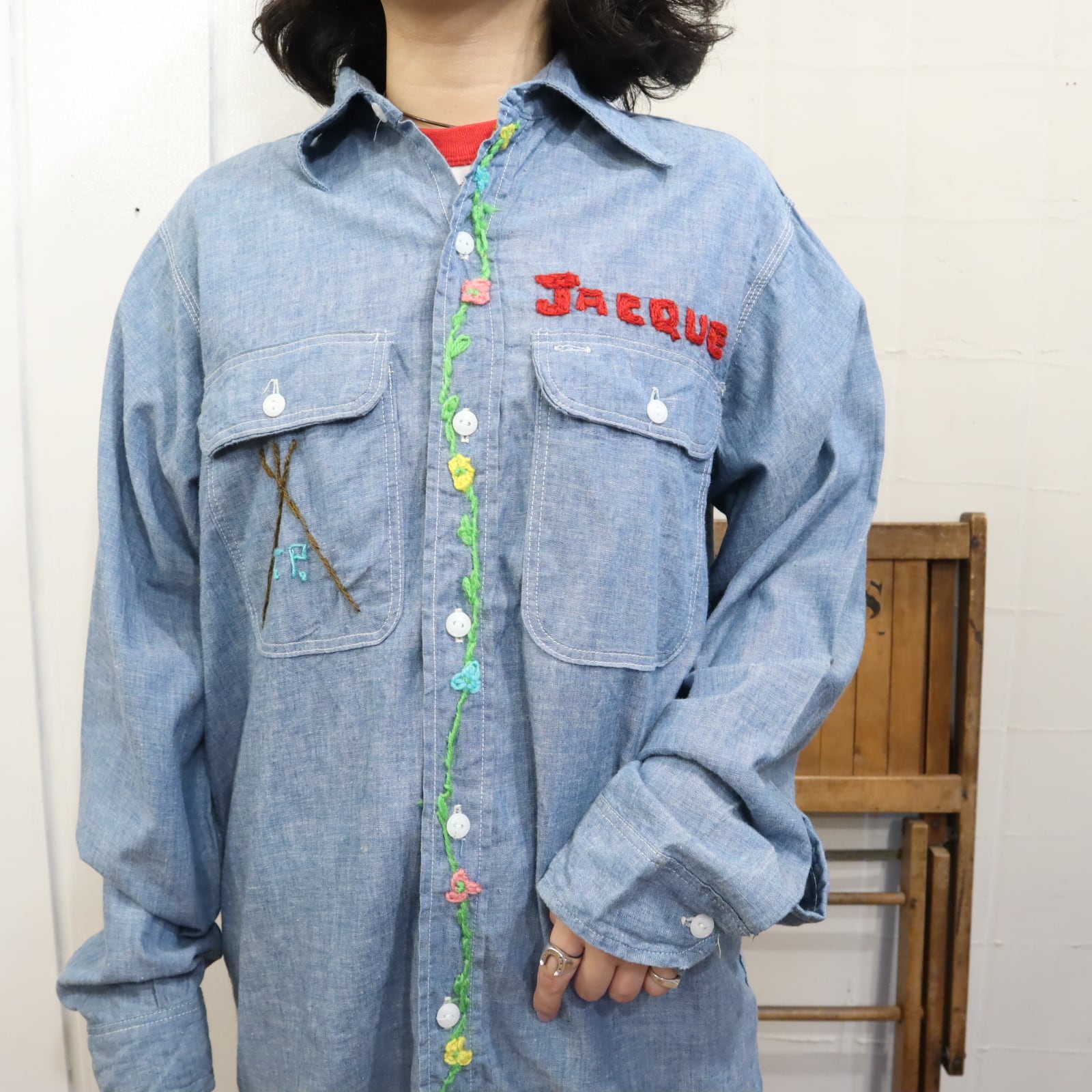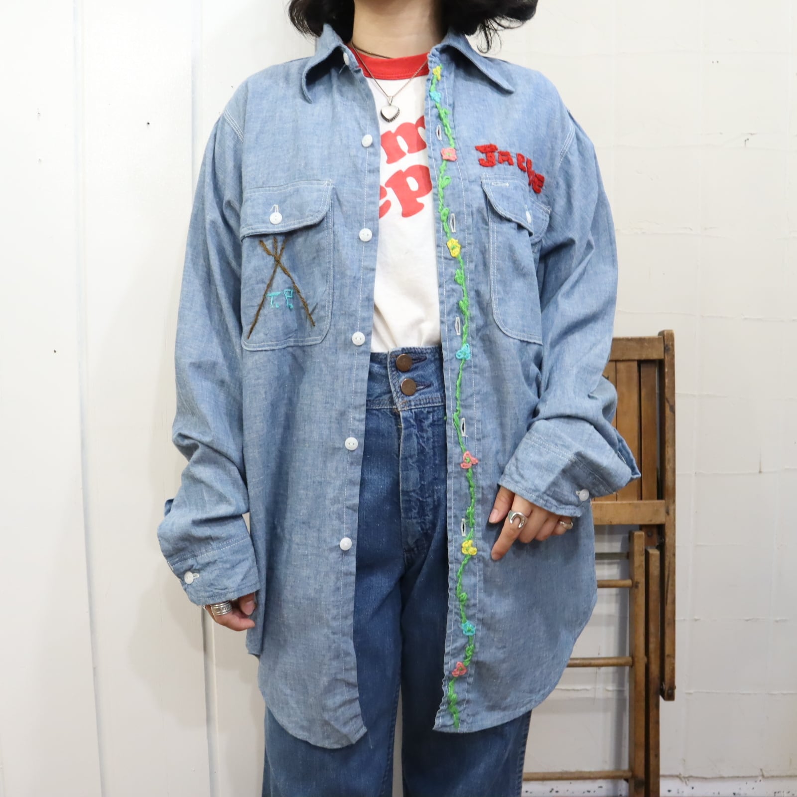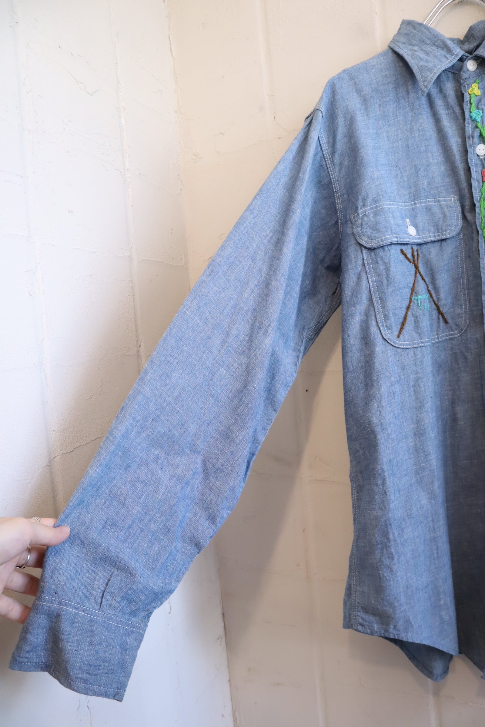 70s BIG MAC blue×colorful embroidery chambray shirt [l-3958]