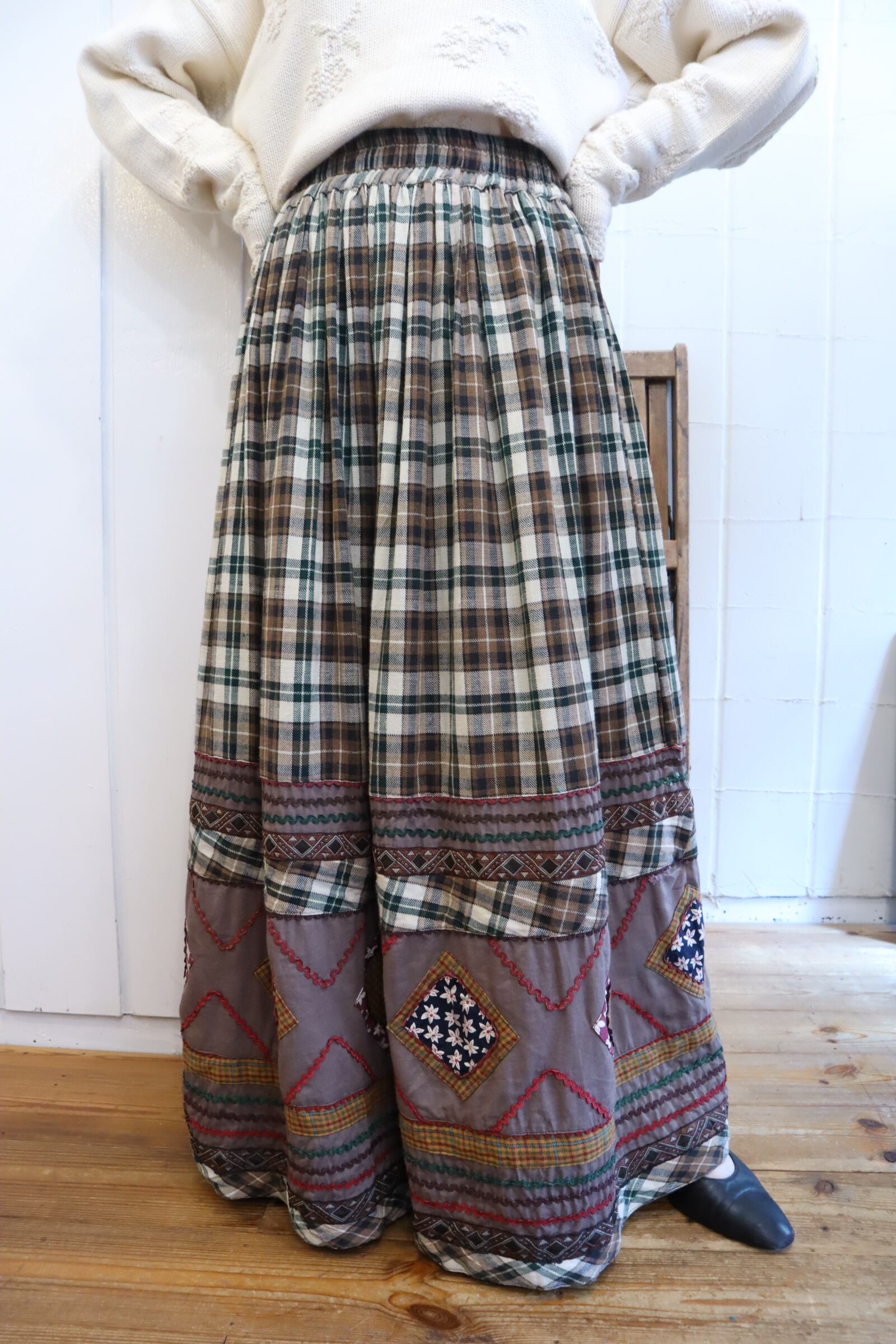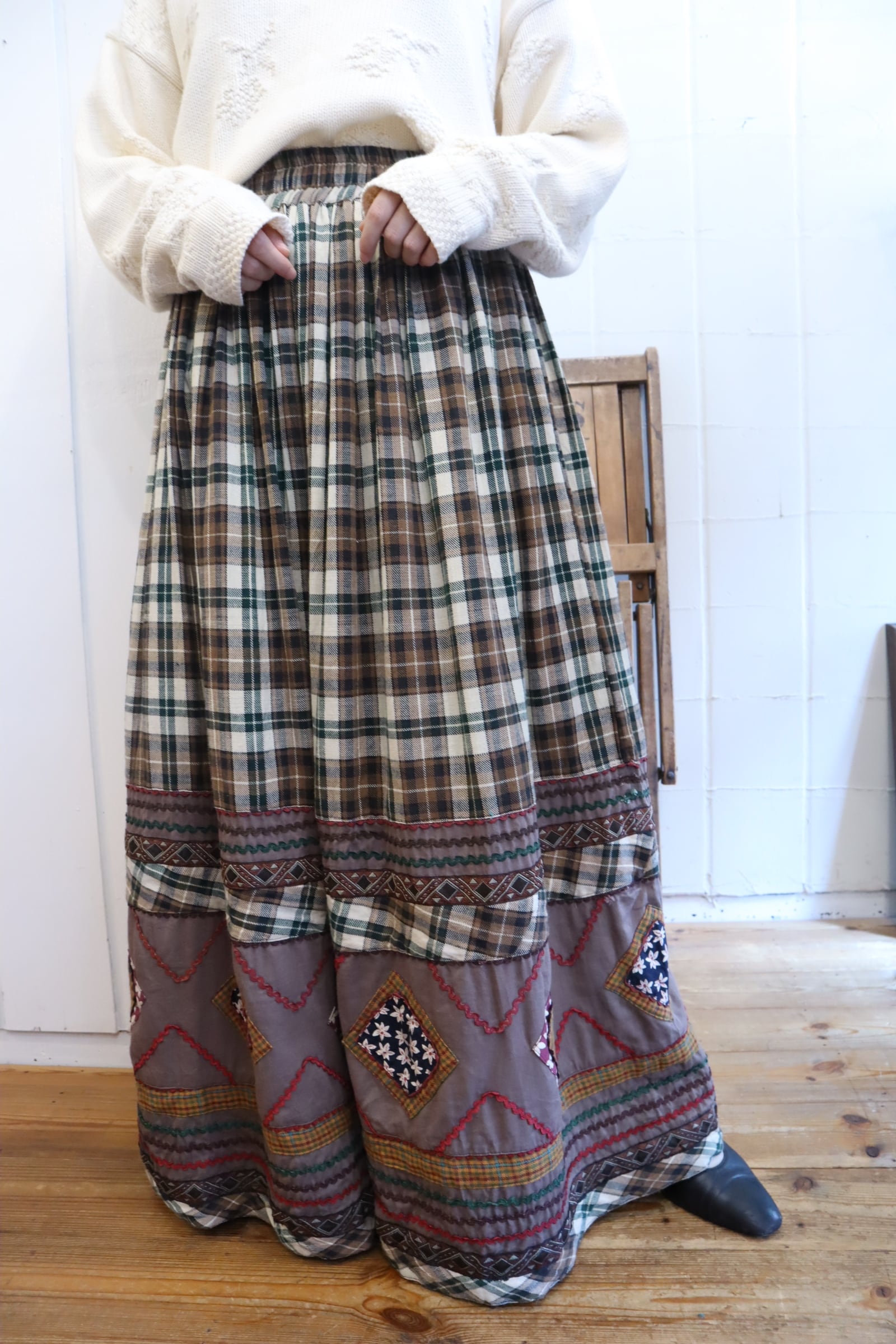 green×brown×yellow plaid patch design skirt [l-4020]