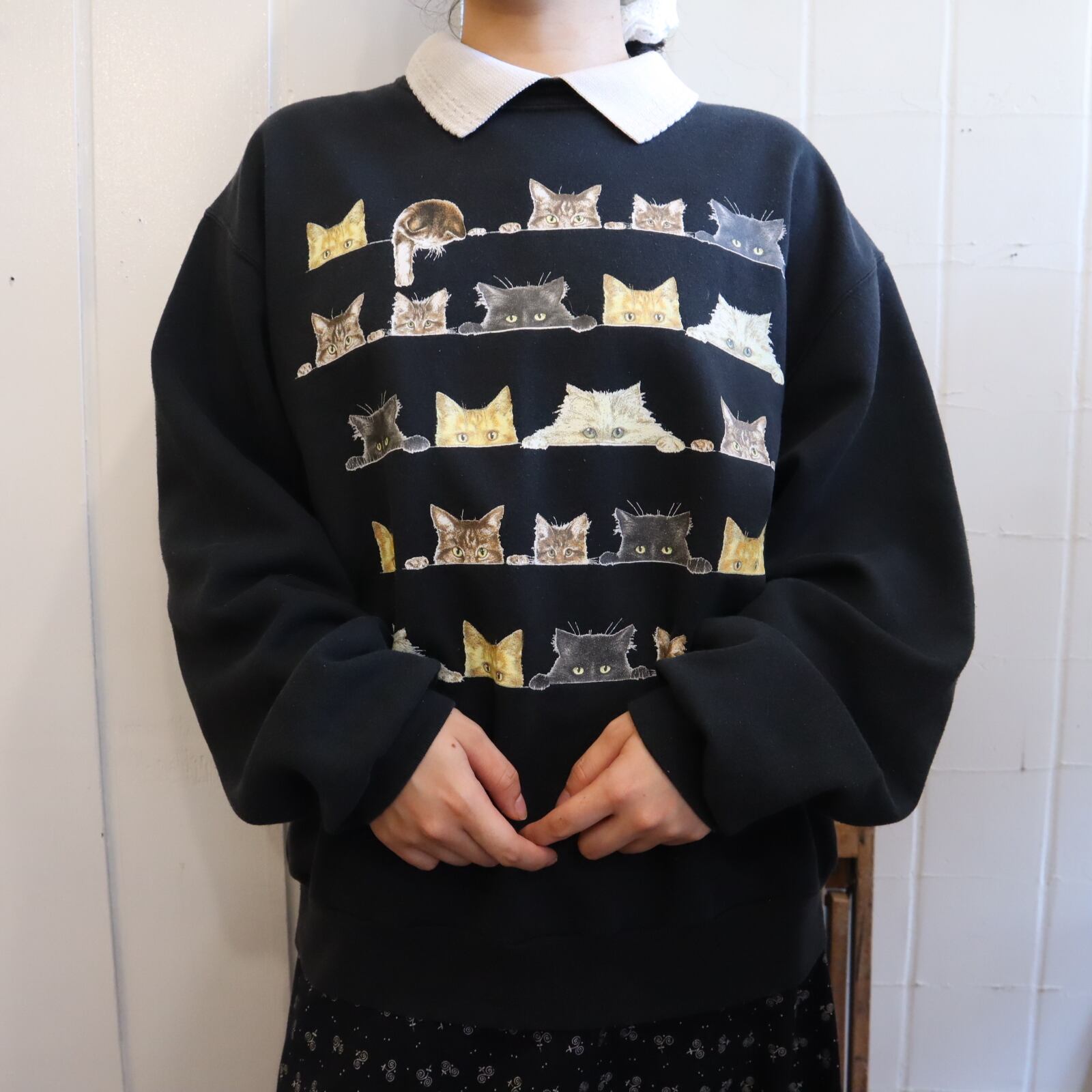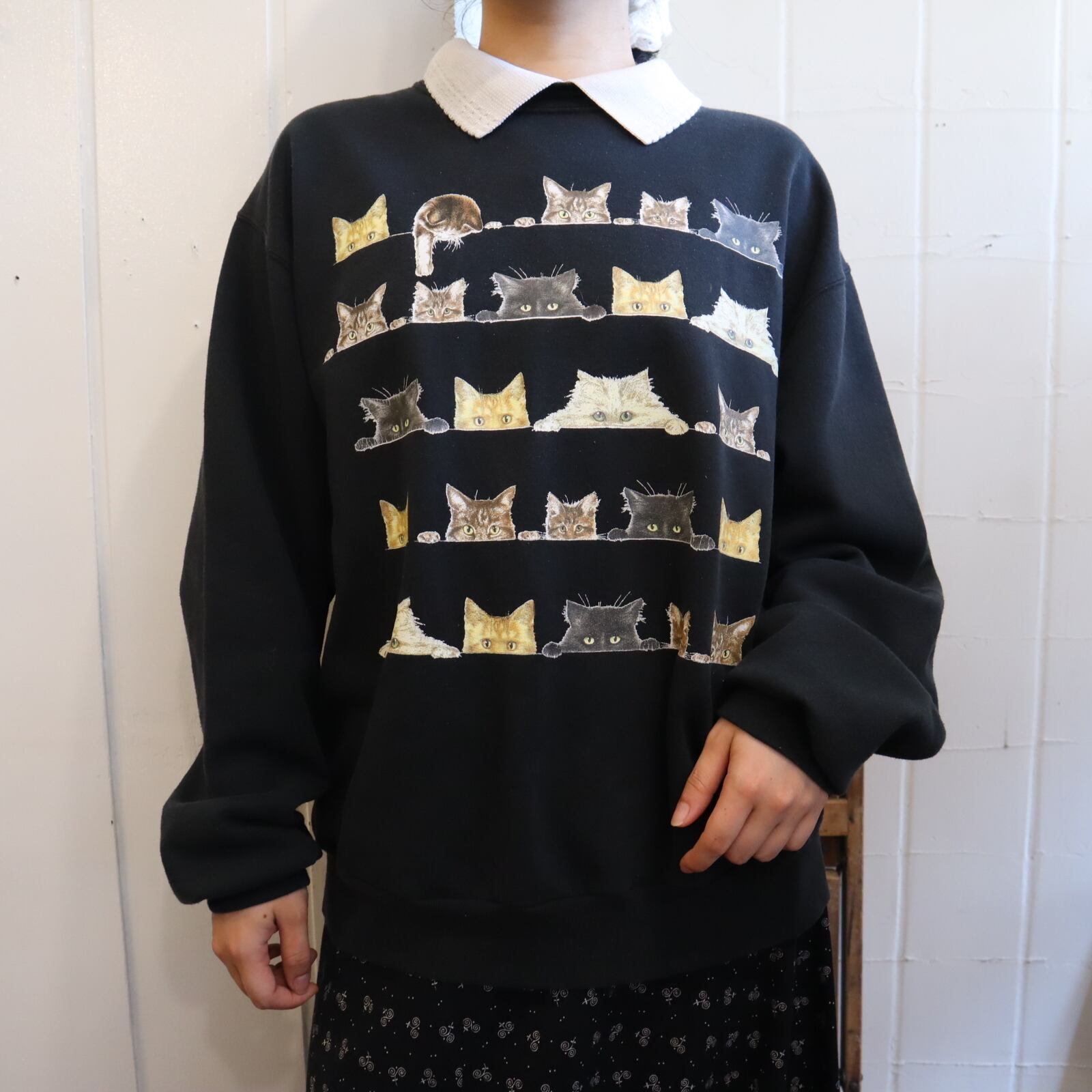 90s black×offwhite cat print knit collar sweat [l-4026]