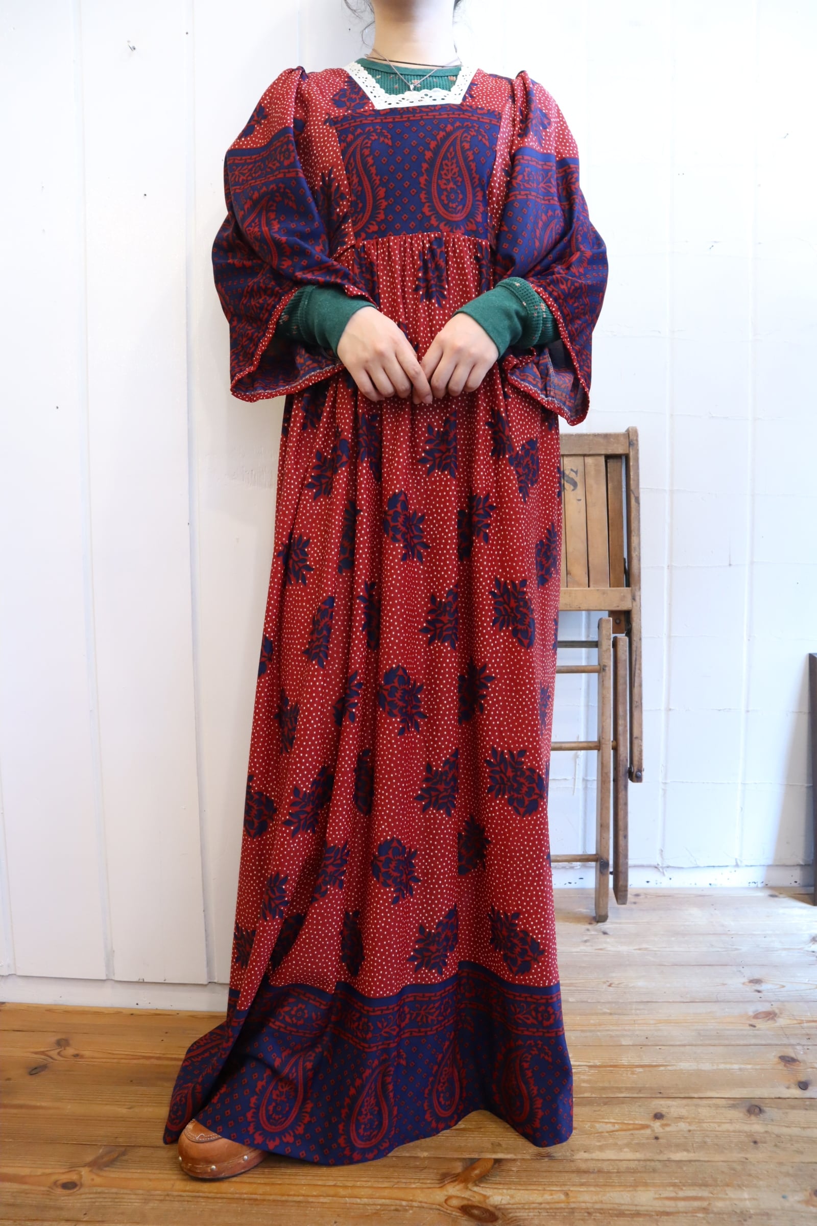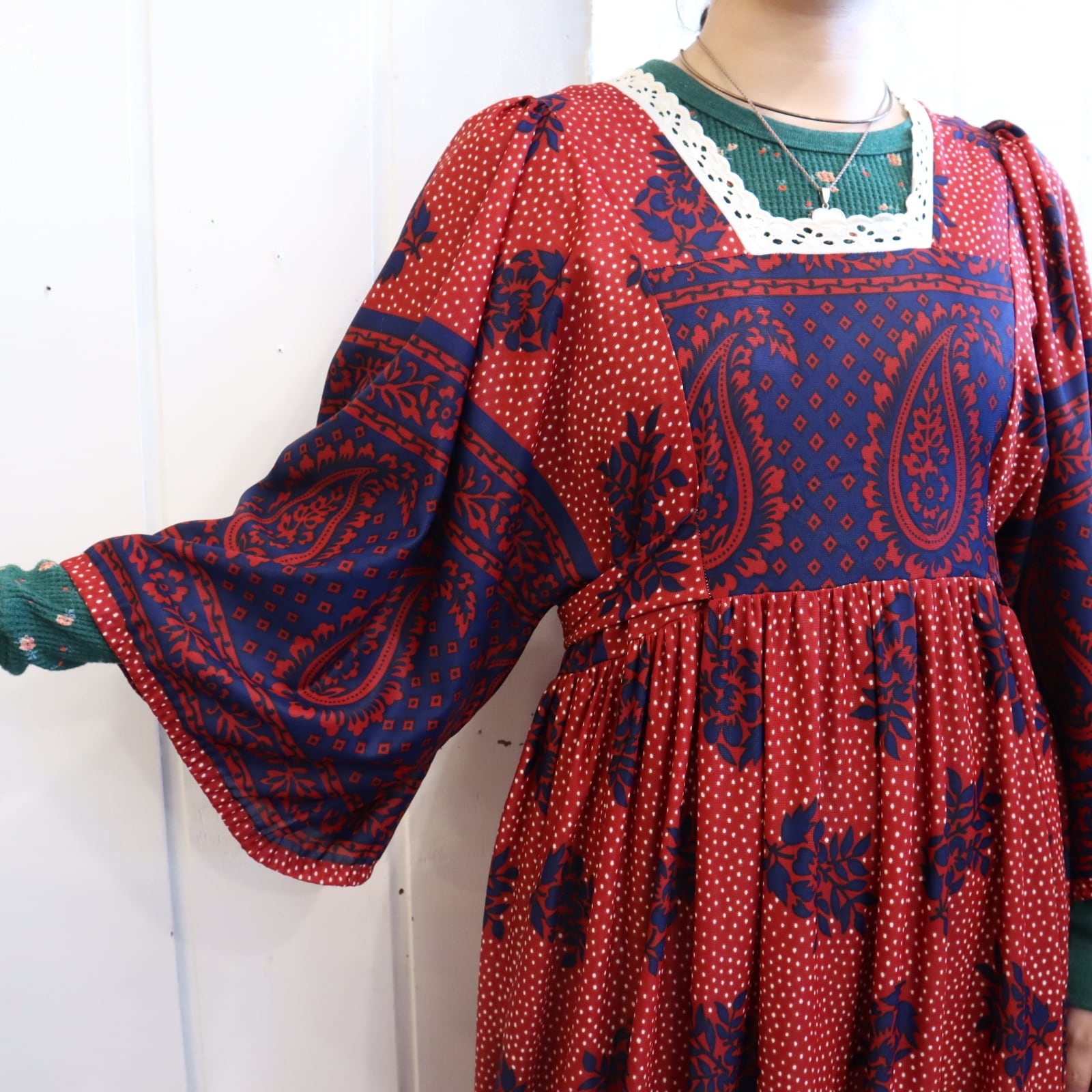 スクエアネックにワイドスリーブ、リボンなど70sらしいデティールがたまらないドレス。
