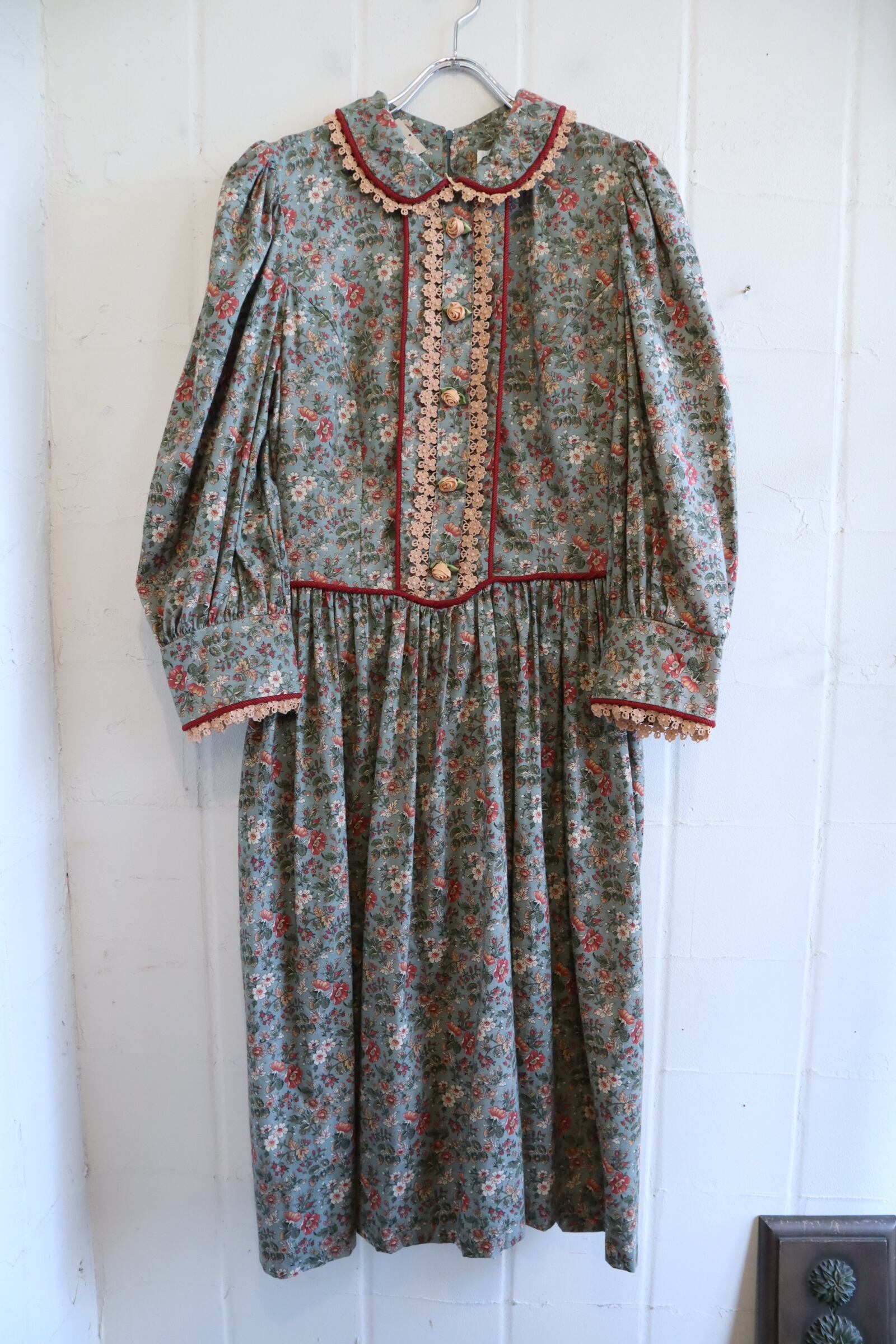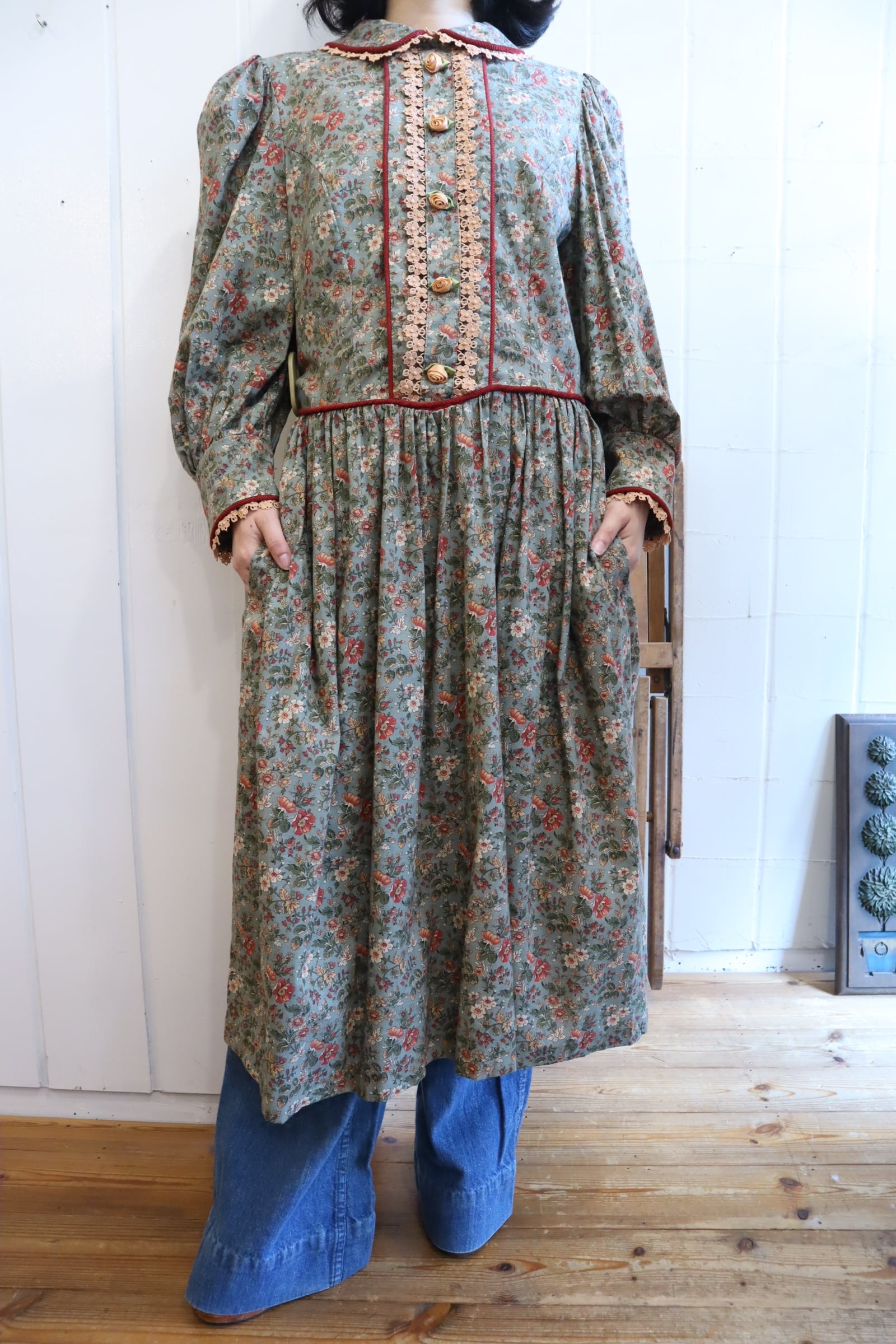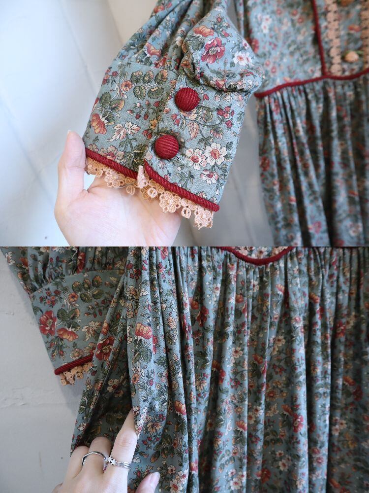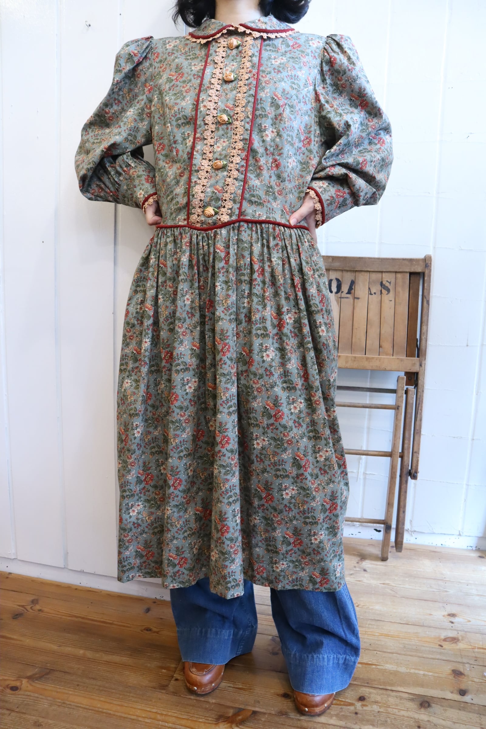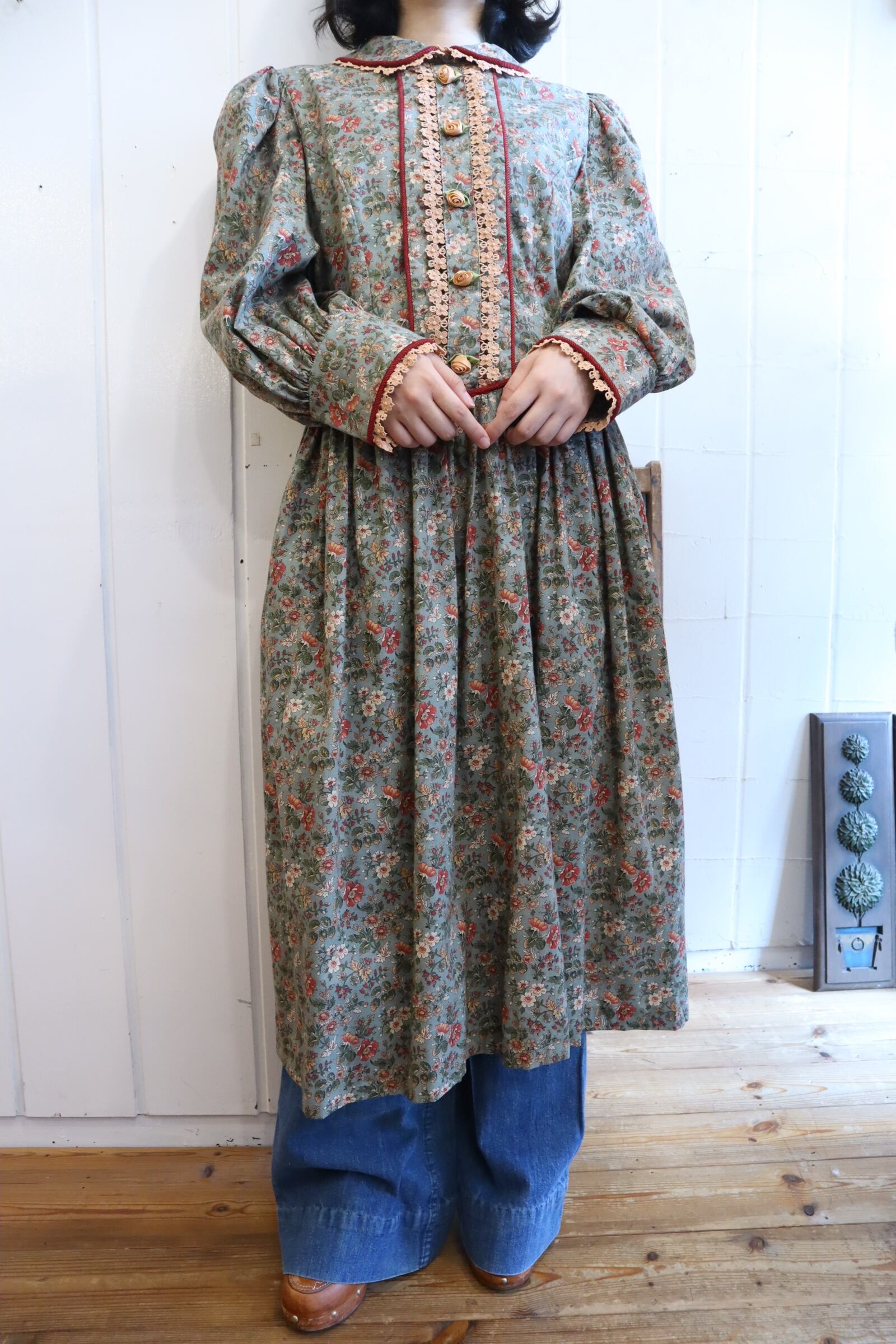 made in USA dullblue×dullred flower pattern dress [l-4057]