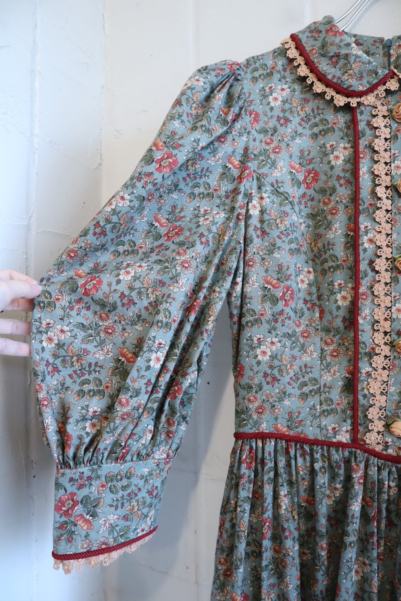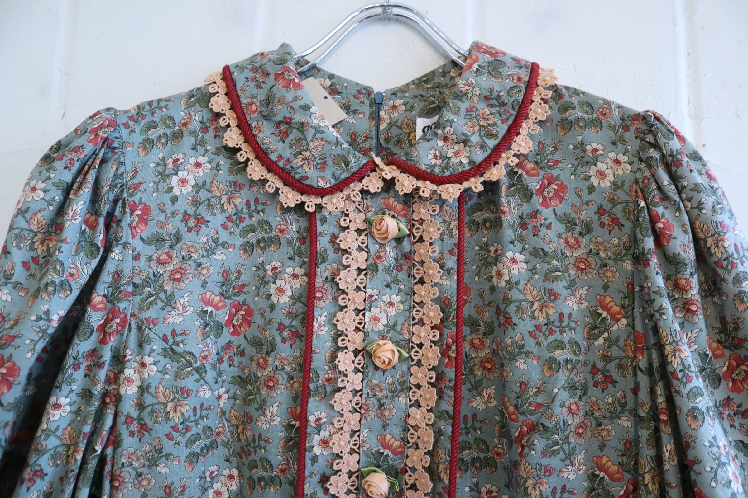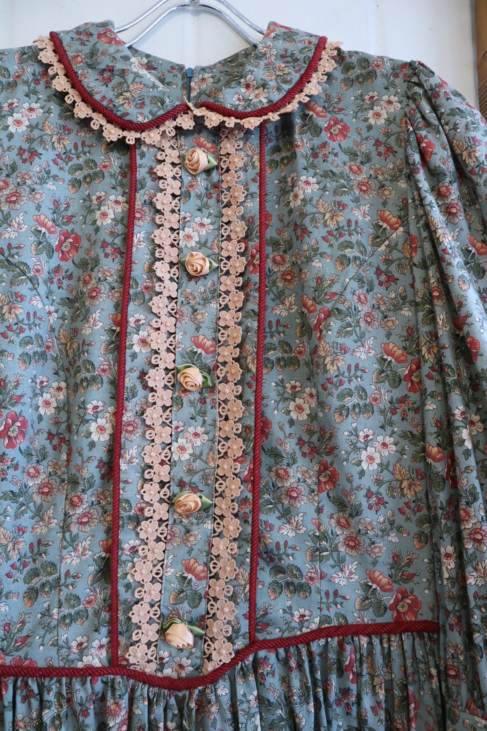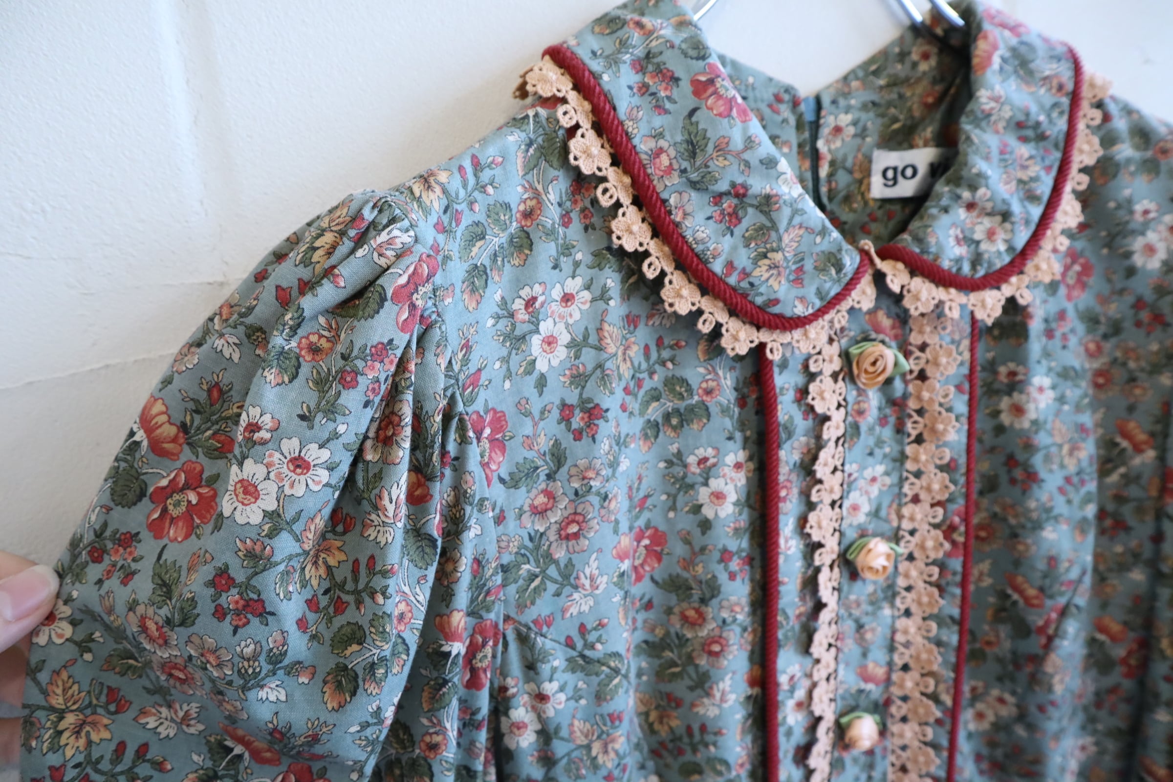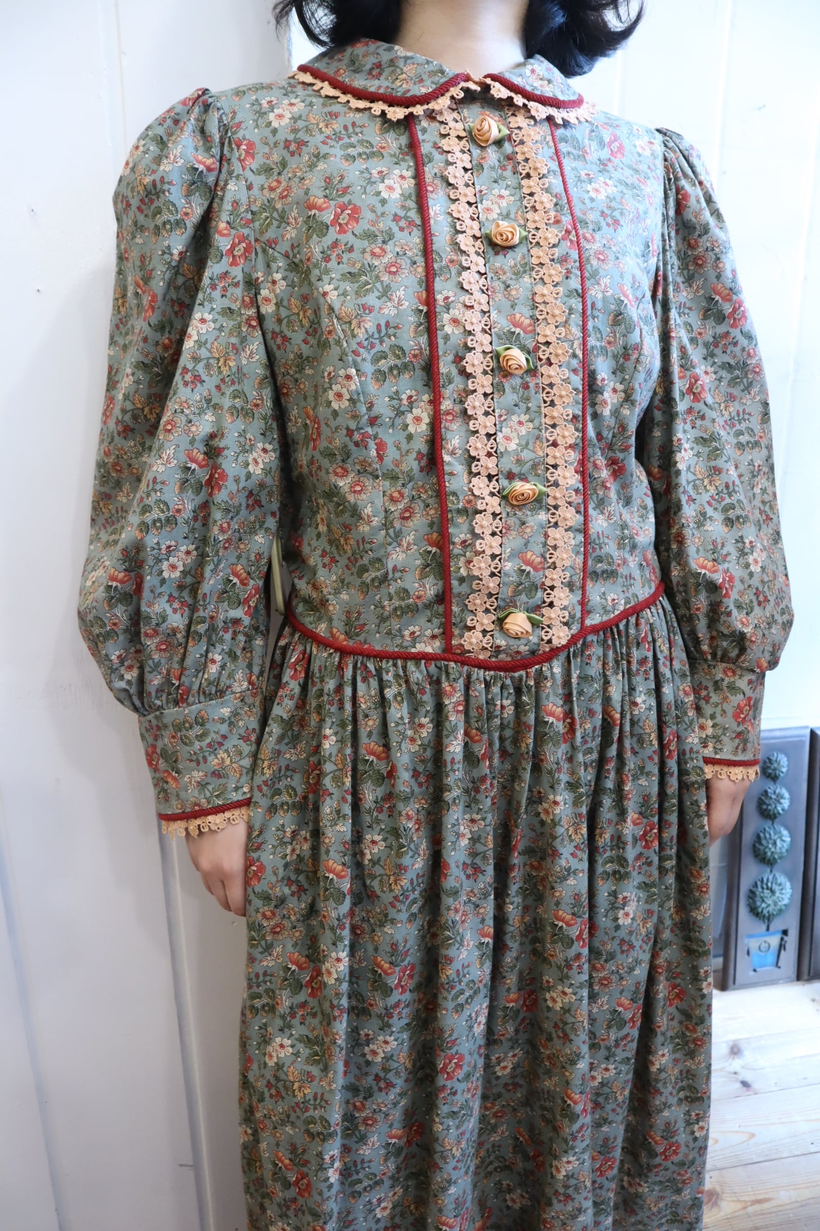 made in USA dullblue×dullred flower pattern dress [l-4057]