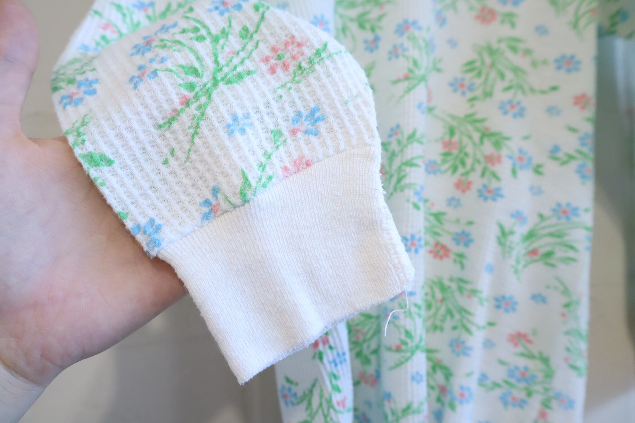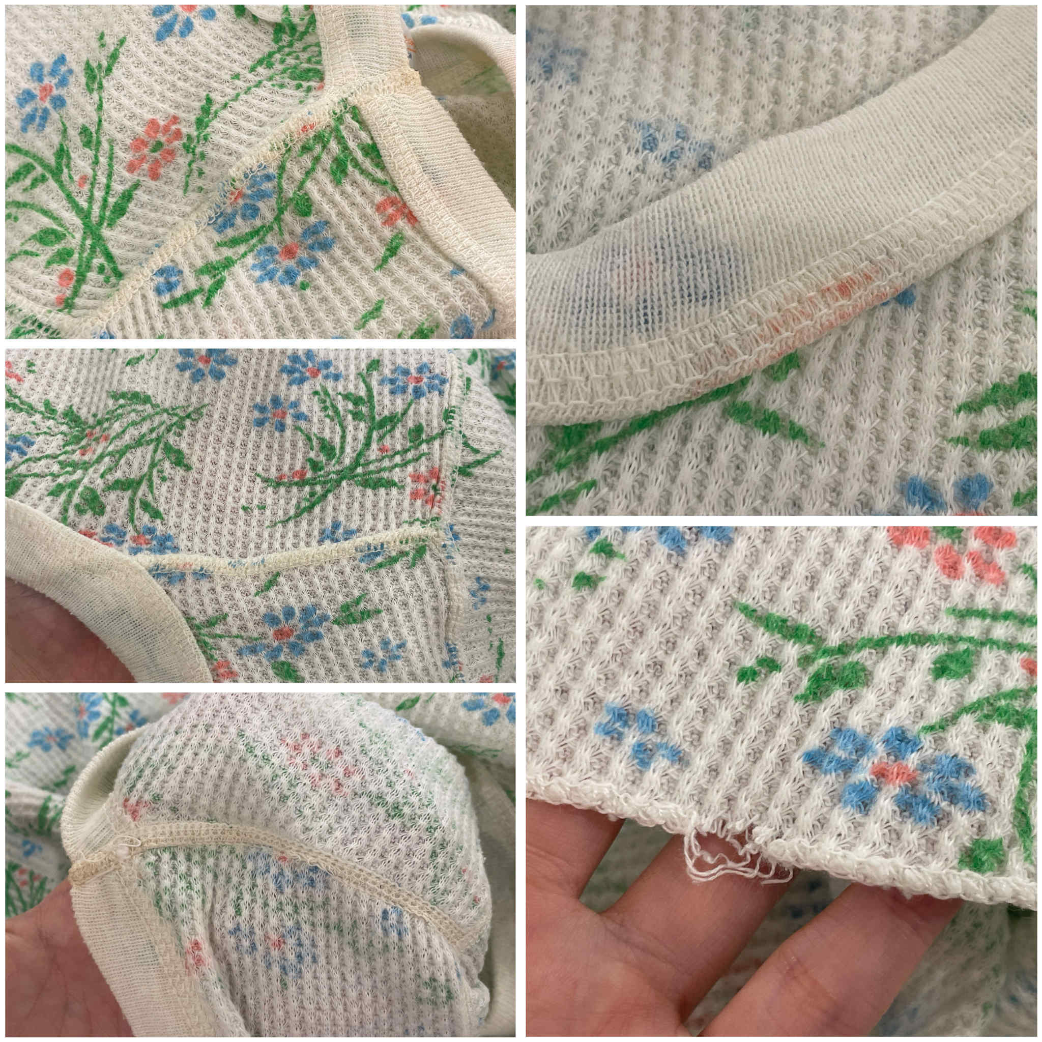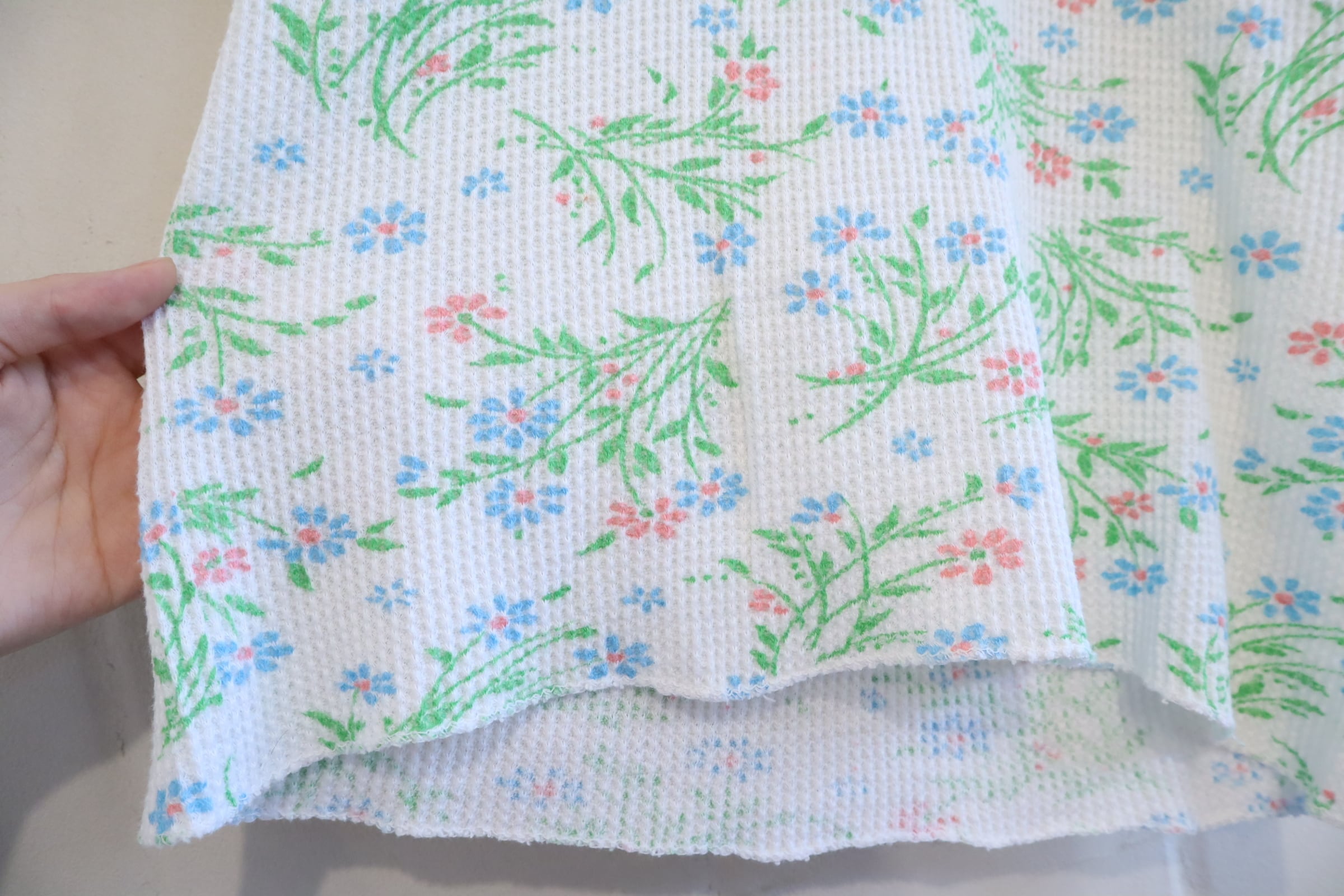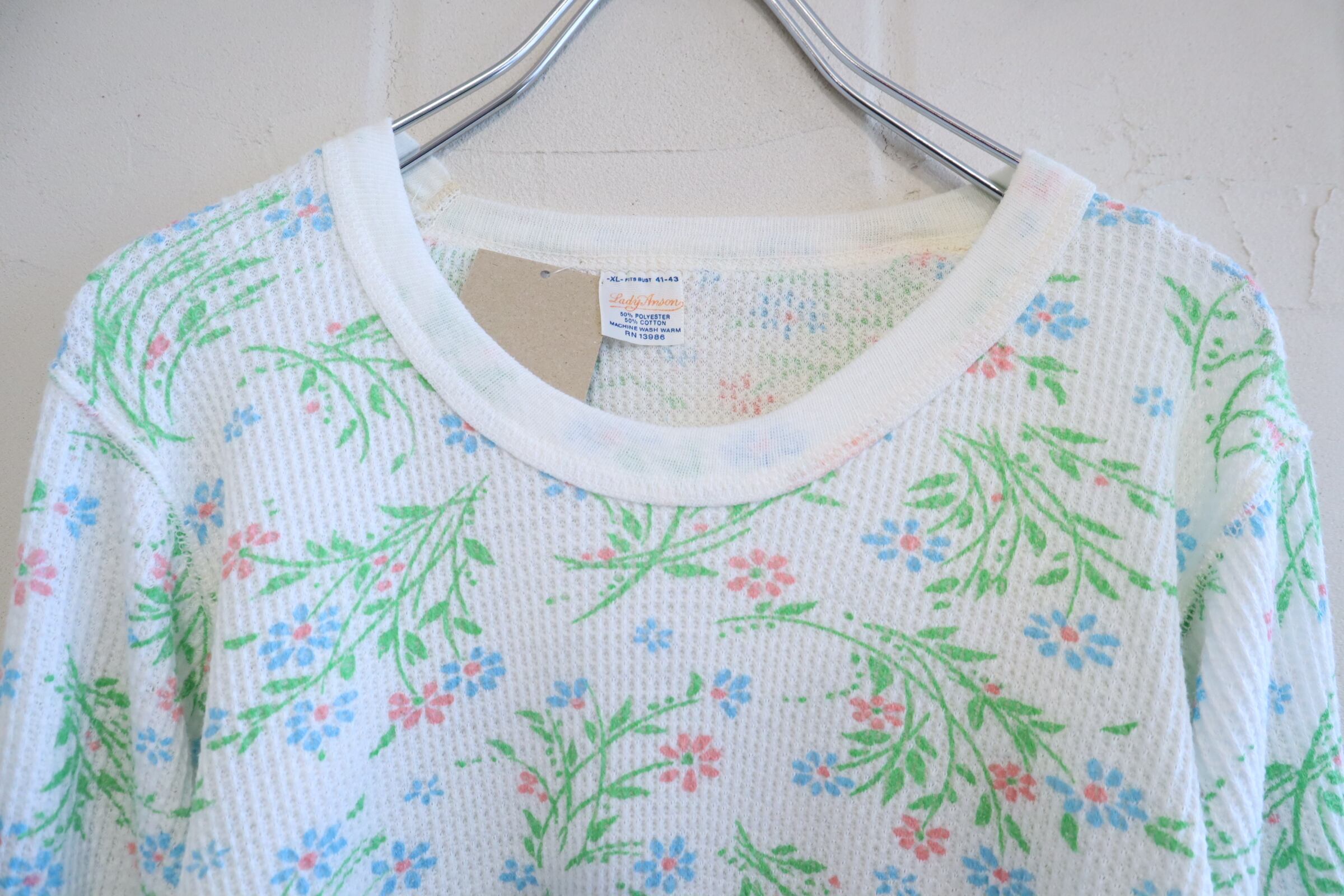 80s white×green×blue flower pattern thermal tops [l-4063]