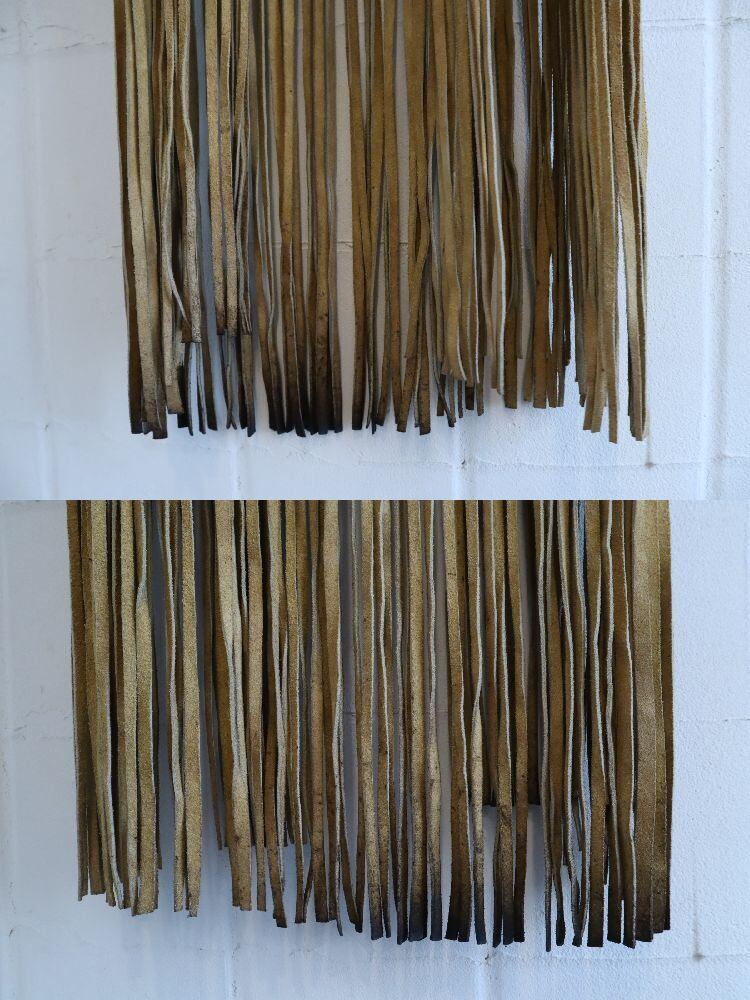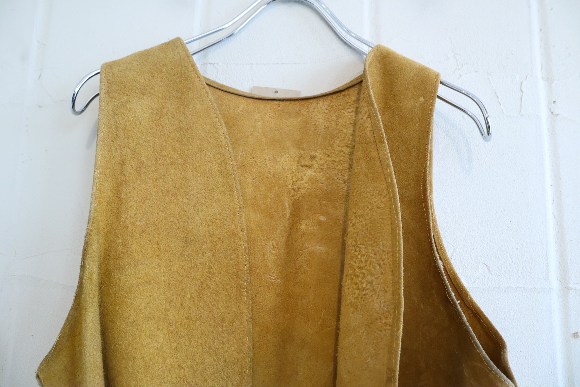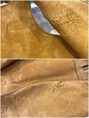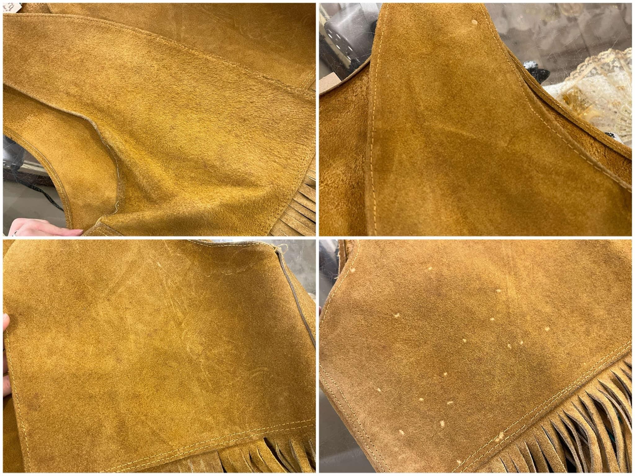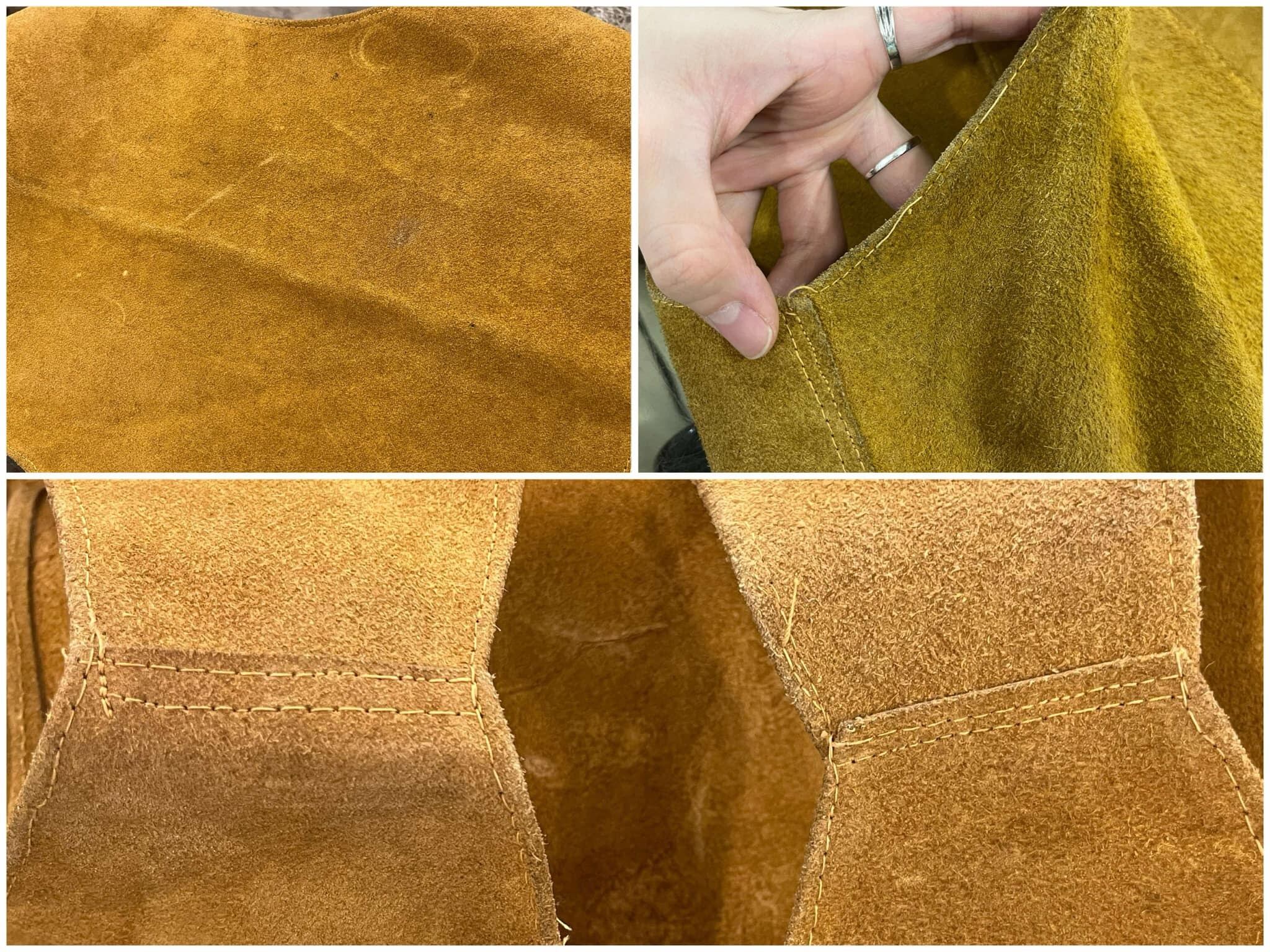 内側にいくつか擦れてできたようなキズ・毛羽立ち、表にいくつか素材特有のキズ・跡・汚れがございますが、古着の味として着て頂けるかと思います。