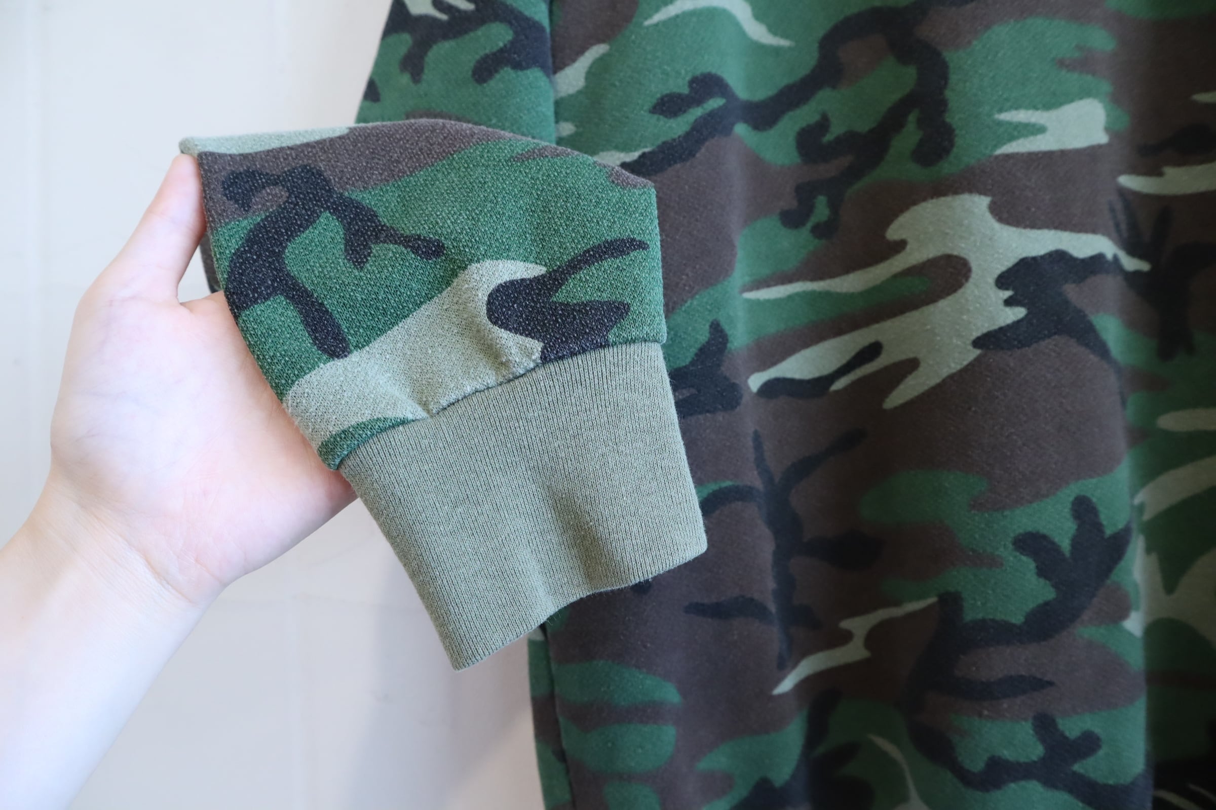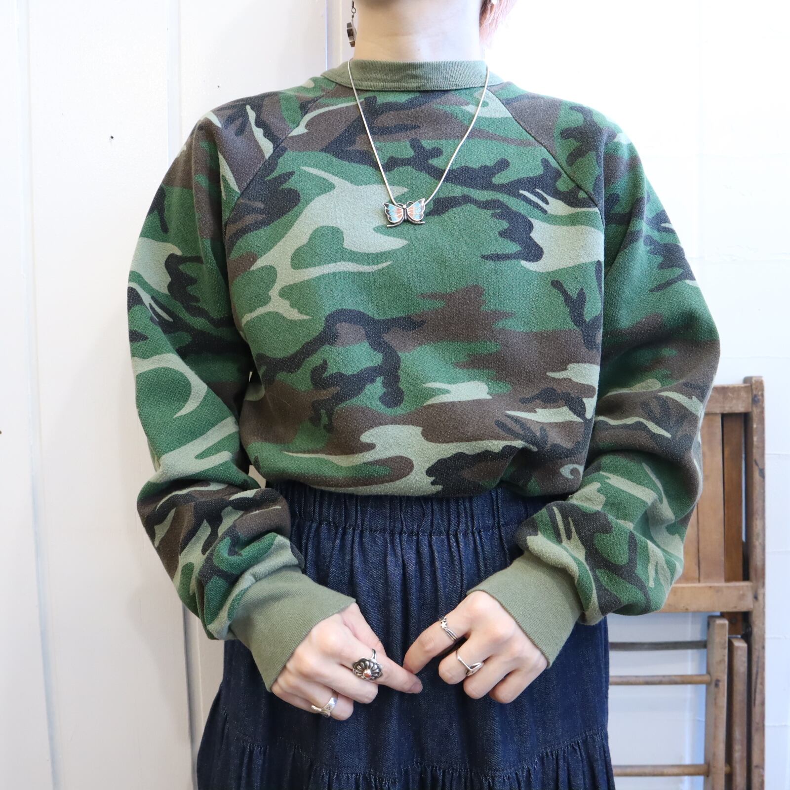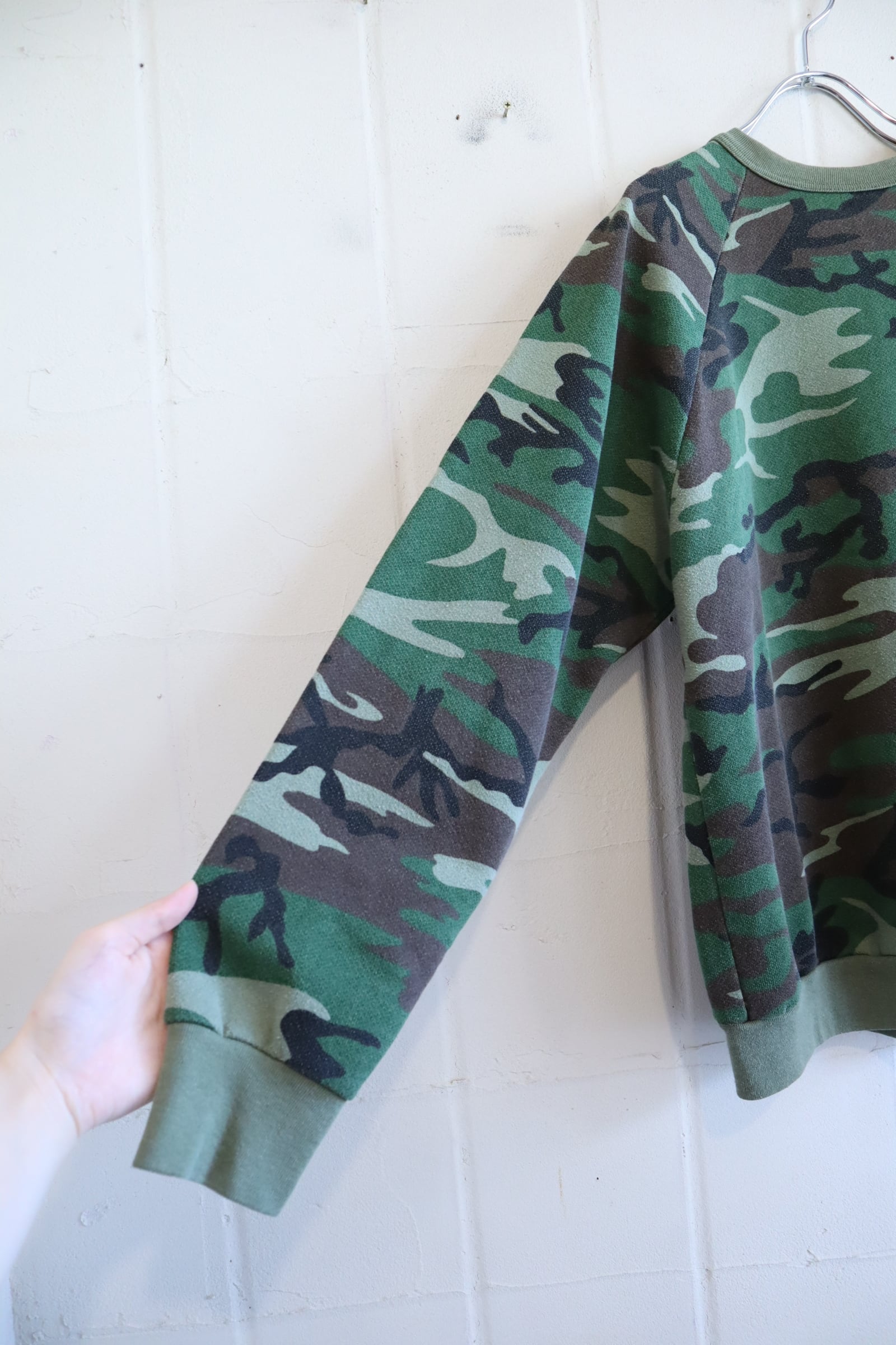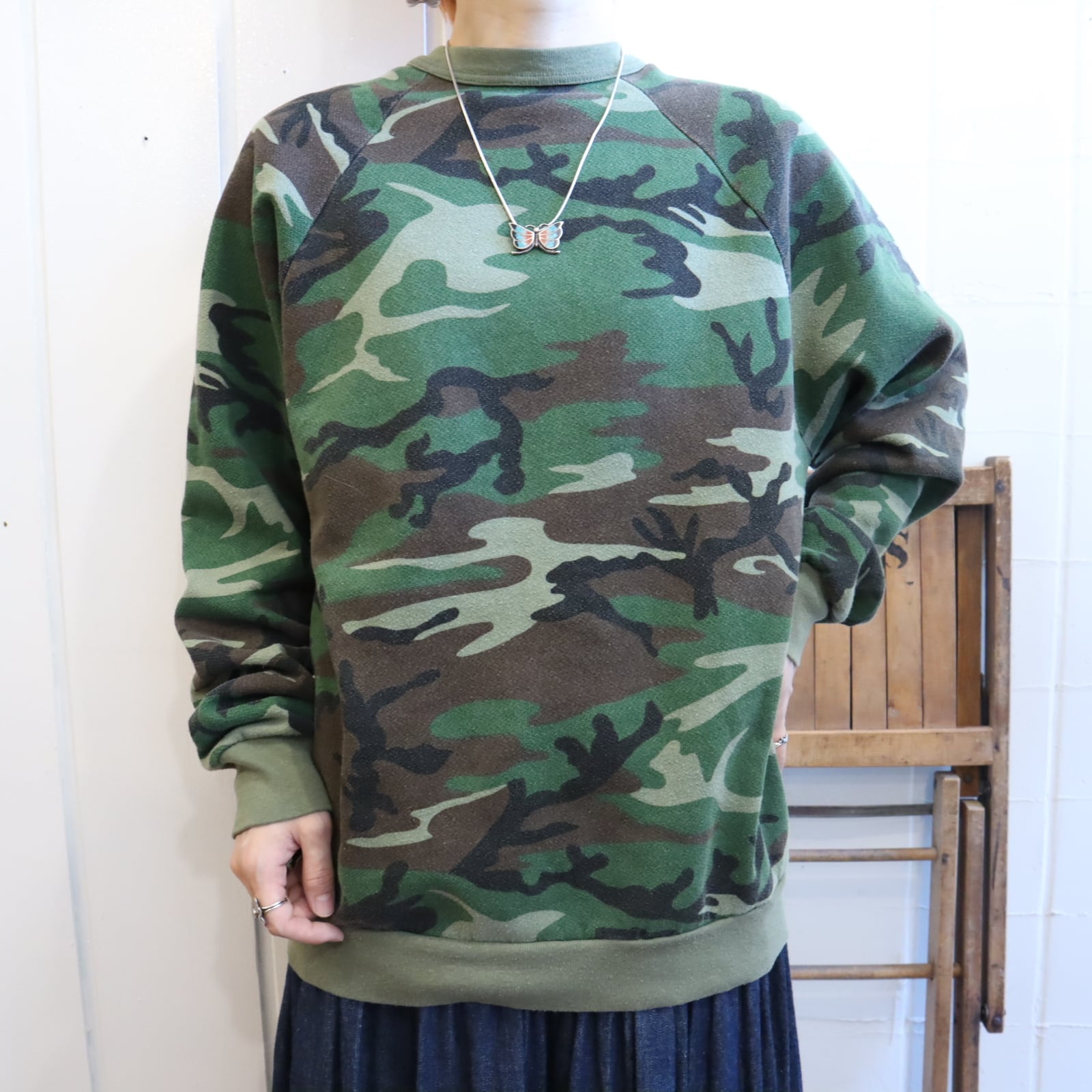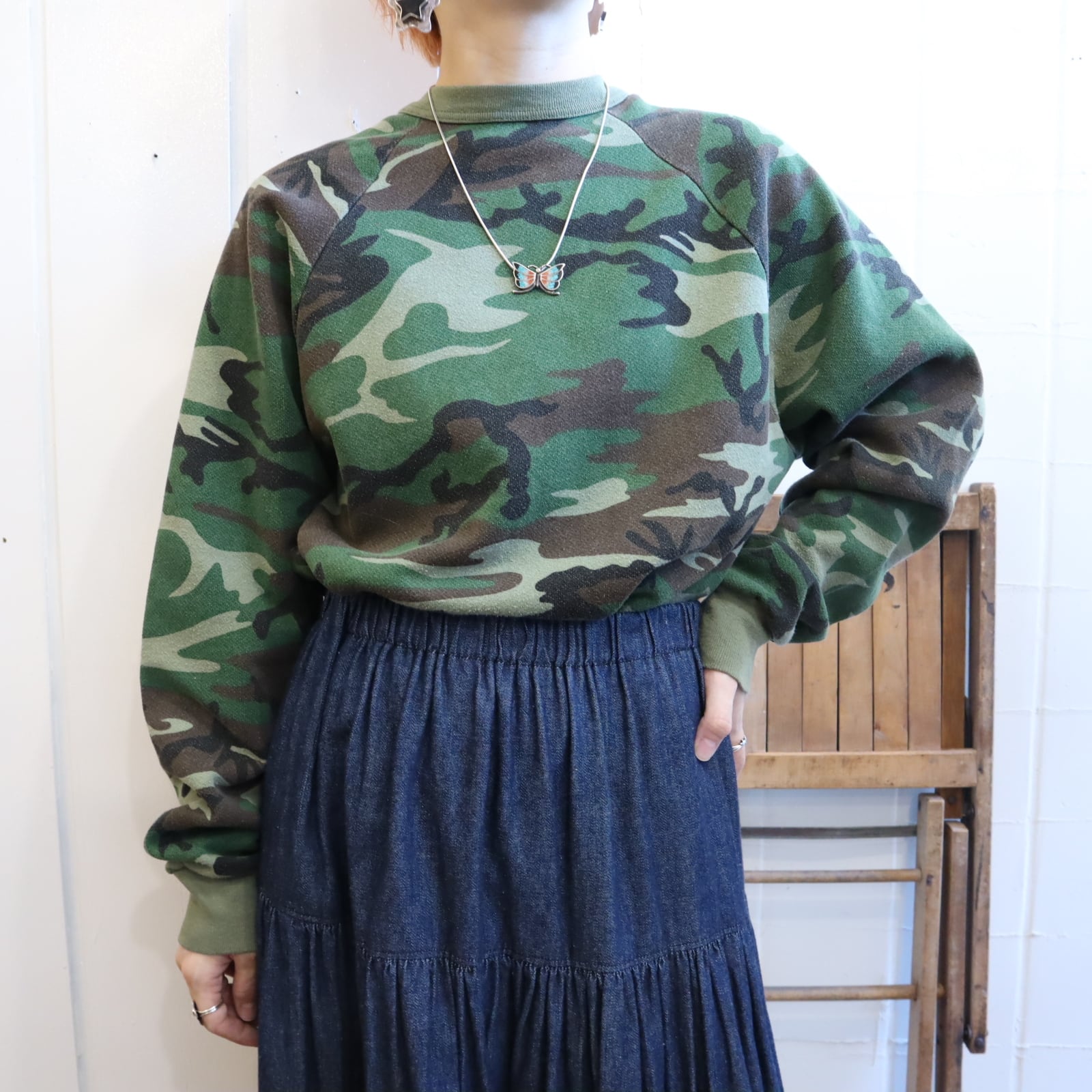 首の詰まったシルエットとカモ柄が可愛いUSA製スウェット。