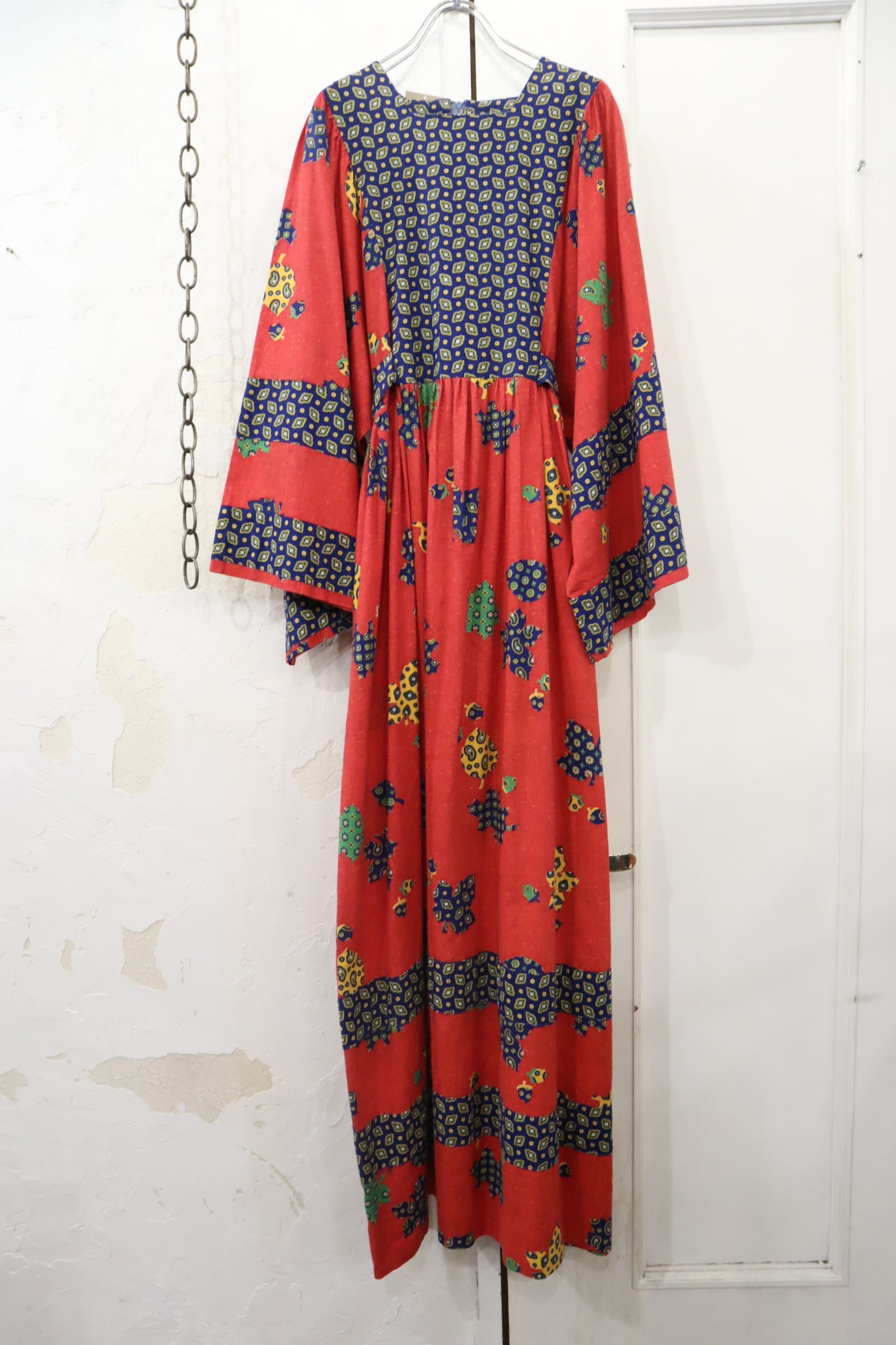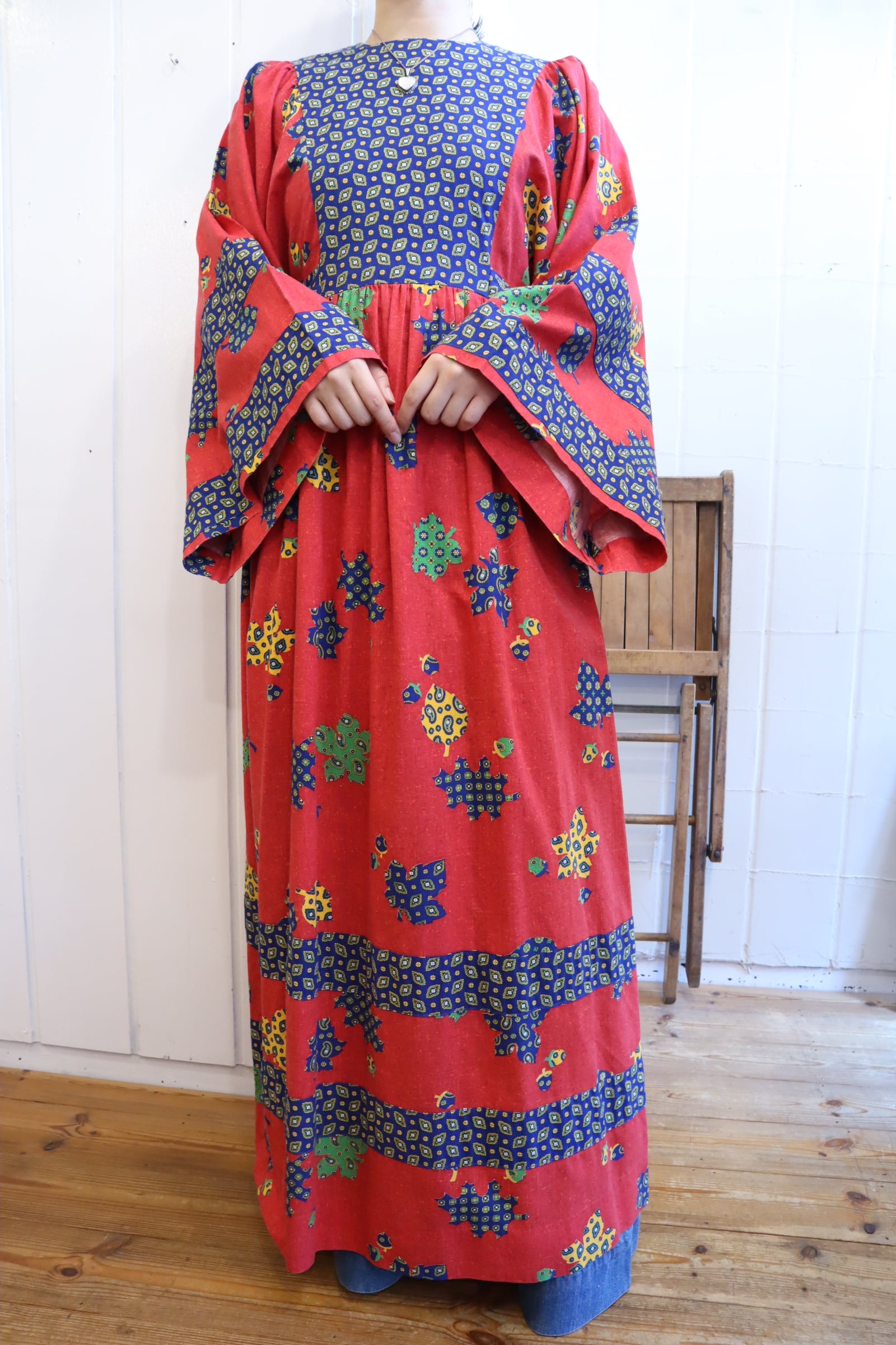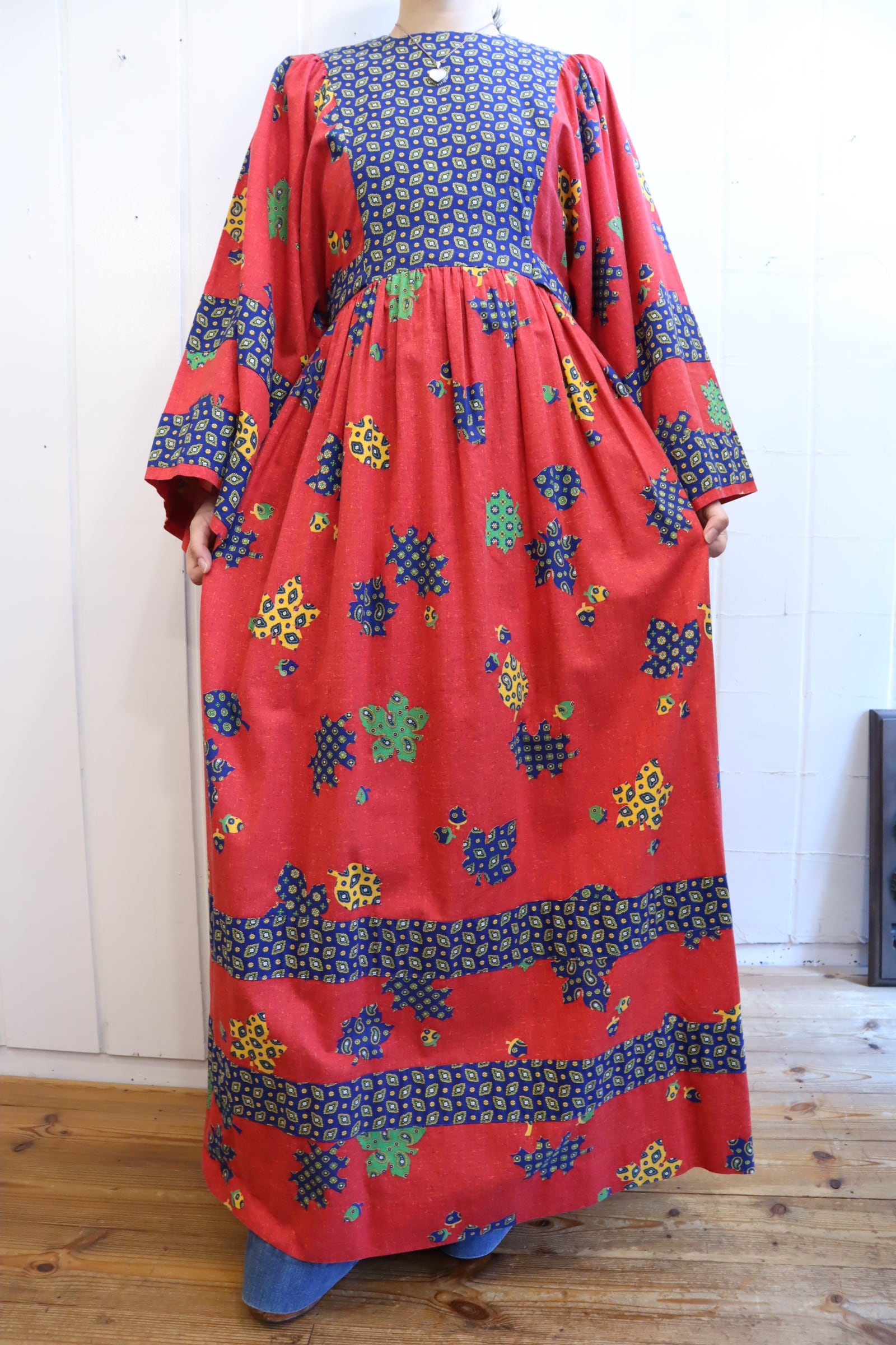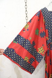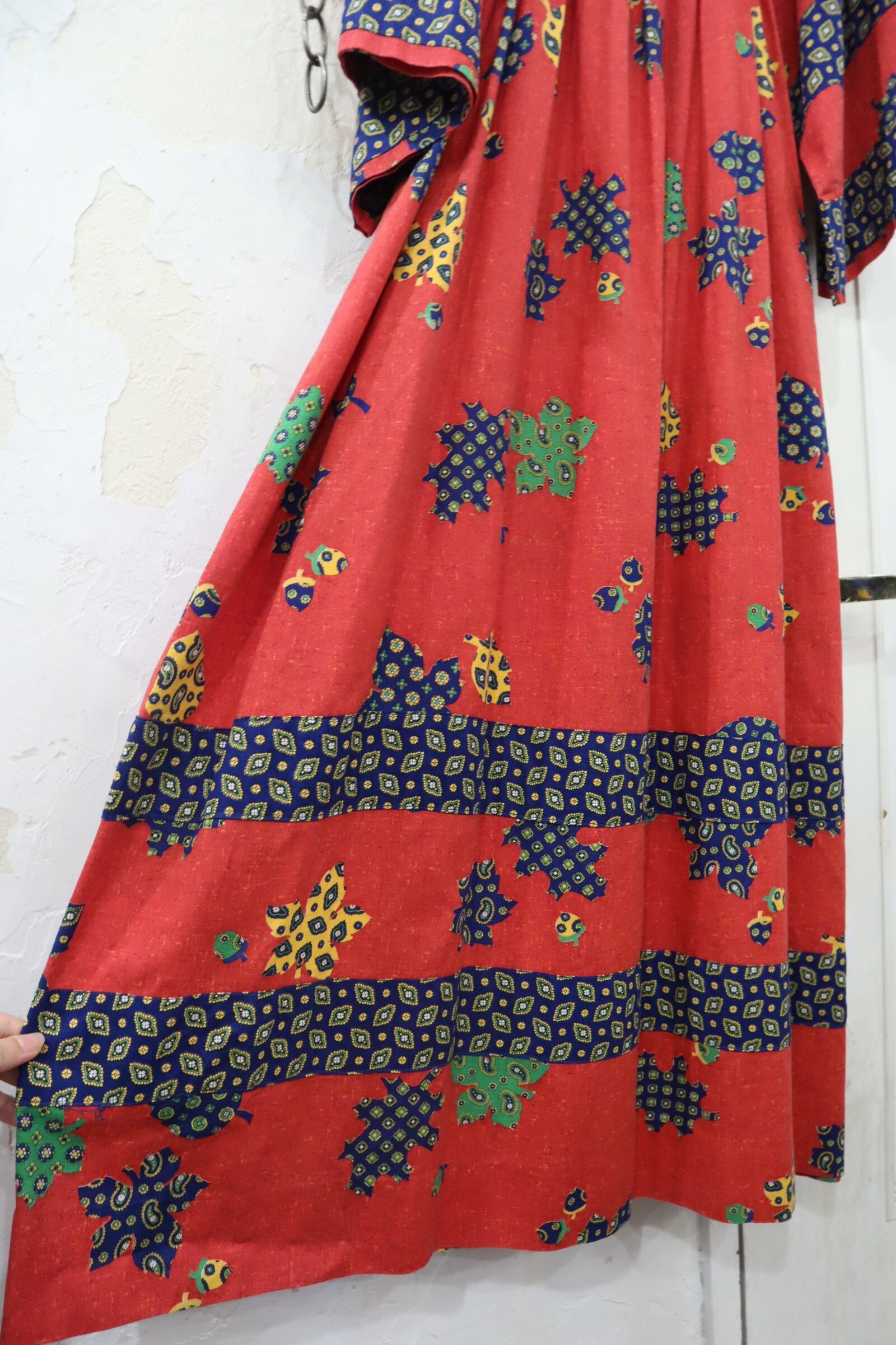 70s red×blue×yellow leaf pattern wide sleeve dress [l-4093]